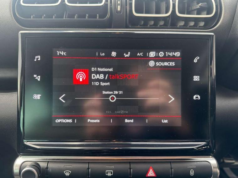 9" Touchscreen display, Citroen connect box emergency and assistance system, Citroen Connect Nav with 3D navigation, Coffee Break Alert, Cruise control with speed limiter, Driver instrument cluster including trip computer and rev counter with white text LCD display and white needles and chrome decor, eCall emergency call system, Engine start button, Lane departure warning system, Mirror screen with Apple CarPlay and Android auto, Outside temperature sensor, Rear parking sensors, Tailgate, Traffic signs and speed limit recognition and recommendation, Variable assistance power steering, Voice recognition for radio, navigation and telephone features, Bluetooth hands free and media streaming with USB socket, Citroen connected DAB radio with 6 speakers, Steering wheel mounted controls for stereo and telephone, 3D effect LED rear lights, Automatic Eco LED headlights, Automatic lights and windscreen wipers, Black roof bars, Body colour painted door handles, Chrome chevrons front grille, Electric front windows + one touch + anti-pinch, Electric rear windows with one touch/anti-pinch, Electrically adjustable door mirrors, Electrically folding door mirrors, Fog lights integrated into front bumper, Front and rear body coloured bumpers, Heated door mirrors, Heated rear window, Integrated roof spoiler, LED daytime running lights, LED third brake light, Painted door mirrors to match colour pack, Rear side wing doors, Rear wiper, Roof aerial, Tinted rear windows and rear quarterpanel glass, Variable front intermittent wipers, 12v socket in front, 60/40 split folding rear seat, Automatic air conditioning, Boot light, Centre console with open storage, Driver and front passenger cup holders, Driver and passenger sunvisor with courtesy mirror, Flex load/Pull out boot floor, Front and rear courtesy reading lights, Front and rear door storage, Front head restraints, Gloss black air vent surrounds and steering wheel insert, Glovebox with closable lid, Height adjustable driver's seat, Height and reach adjustable steering wheel, Manual handbrake with chrome insert, Passenger compartment headlight adjustment, Rear isofix mounting points (outside seats) with top tether, Row 2 - Three seats with individually adjustable head rests, Satin chrome interior door handles, Single front passenger seat, 3 point, height adjustable, pre tensioned front seatbelts, ABS with Electronic brakeforce distribution and Emergency braking assistance, Automatic illumination of hazard warning lights, Curtain airbags, Driver airbag, Drivers/passengers and rear seats unfastened seat belt warning, ESC (Electronic Stability Control), Front lateral airbags, Front passenger airbag, Front passenger airbag deactivation switch, Hill start assist function, Mono-tone horn, Rear door child safety locks, Three 3 point rear seatbelts, Tyre pressure monitor, Automatic door and boot locking when moving off with automatic unlocking in case of impact, Automatic locking of the vehicle (after 30 seconds if door or boot unopened), Immobiliser, Perimetric and volumetric anti theft alarm, Remote central locking + deadlocks, Vehicle locater function (headlights illuminate when button on key pressed), 16" X Cross diamond cut alloy wheels,
