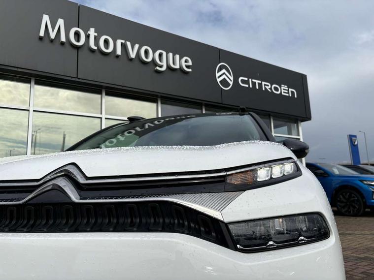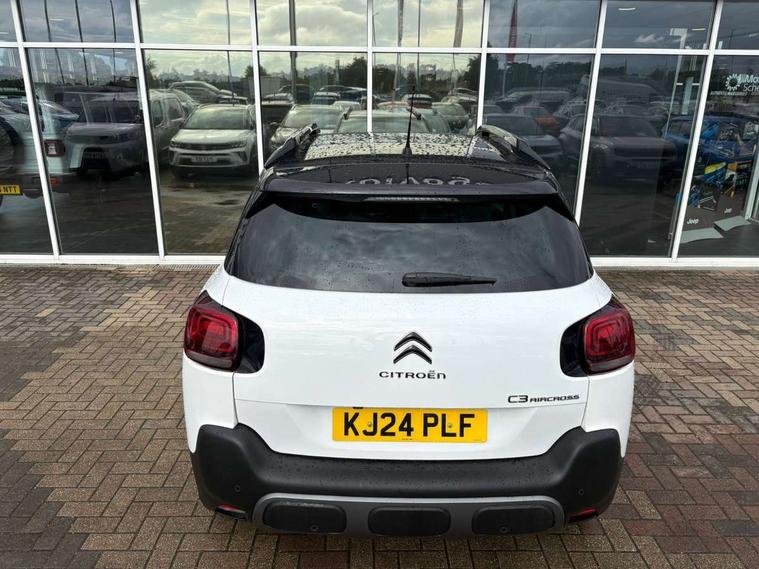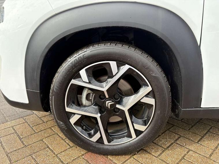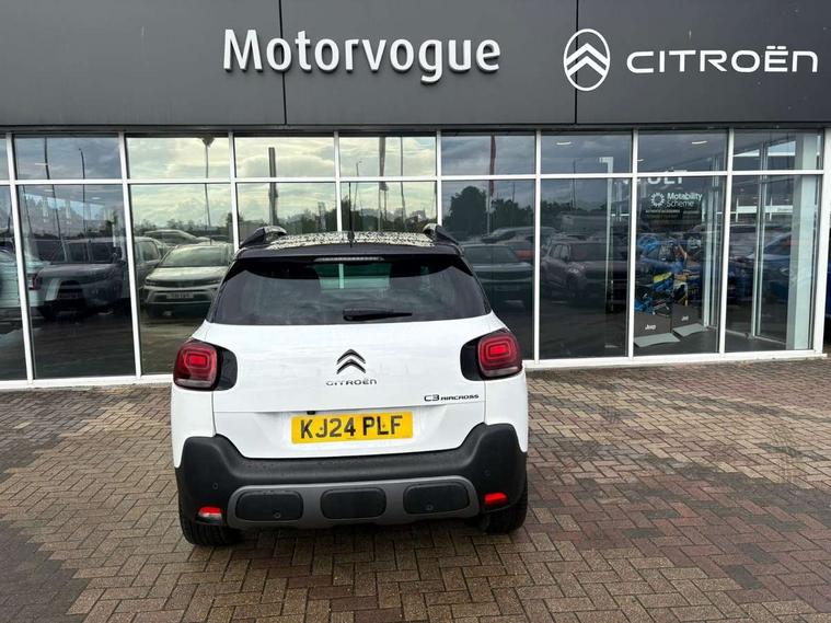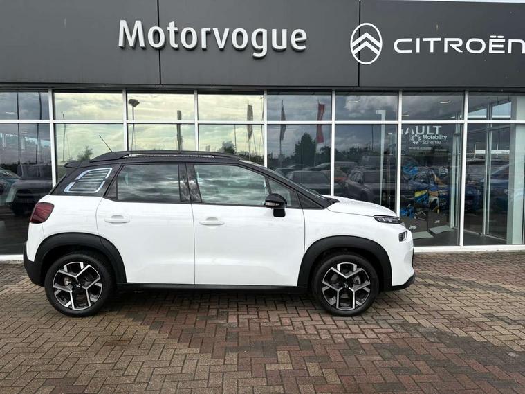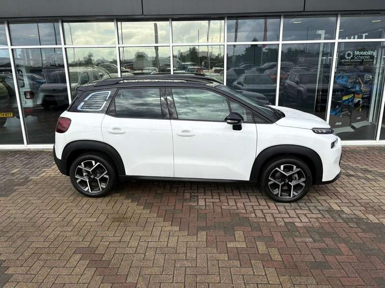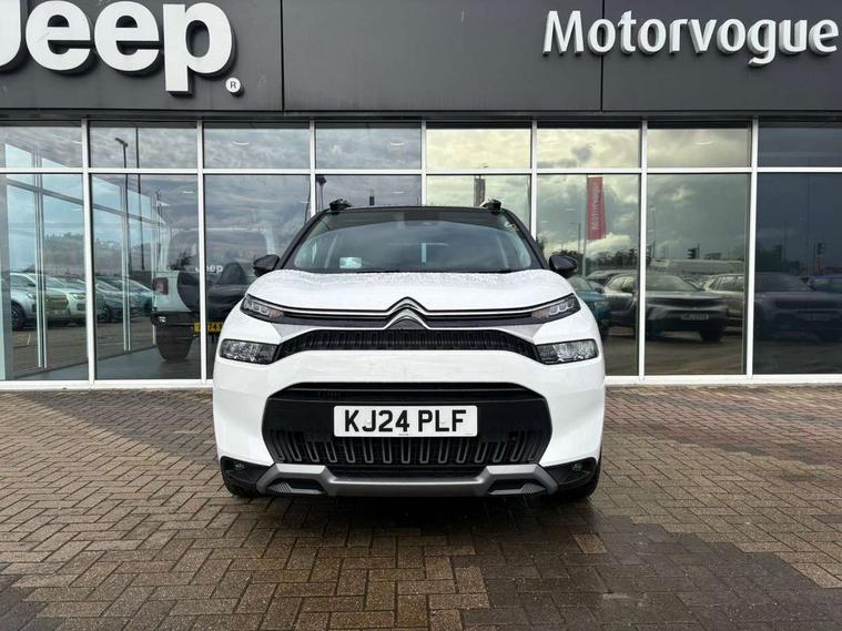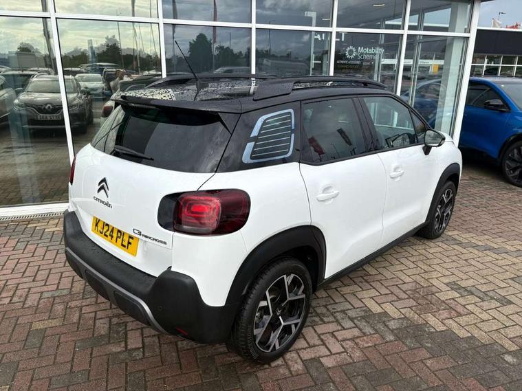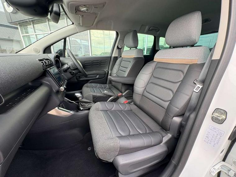3.5" head up display, 9" Touchscreen display, Citroen connect box emergency and assistance system, Citroen Connect Nav with 3D navigation, Coffee Break Alert, Cruise control with speed limiter, Driver instrument cluster including trip computer and rev counter with white text LCD display and white needles and chrome decor, eCall emergency call system, Engine start button, Lane departure warning system, Mirror screen with Apple CarPlay and Android auto, Outside temperature sensor, Rear parking sensors, Tailgate, Top rear vision reversing camera, Traffic signs and speed limit recognition and recommendation, Variable assistance power steering, Voice recognition for radio, navigation and telephone features, Bluetooth hands free and media streaming with USB socket, Citroen connected DAB radio with 6 speakers, Steering wheel mounted controls for stereo and telephone, 3D effect LED rear lights, Automatic Eco LED headlights, Automatic lights and windscreen wipers, Black roof bars, Body colour painted door handles, Chrome chevrons front grille, Electric front windows + one touch + anti-pinch, Electric rear windows with one touch/anti-pinch, Electrically adjustable door mirrors, Electrically folding door mirrors, Electrochrome rear view mirror, Fog lights integrated into front bumper, Front and rear body coloured bumpers, Heated door mirrors, Integrated roof spoiler, LED daytime running lights, LED third brake light, Rear side wing doors, Rear wiper, Roof aerial, Tinted rear windows and rear quarterpanel glass, Variable front intermittent wipers, 12v socket in front, 12V socket in rear of vehicle, 2 rear isofix mounting points (outside seats) with top tether, 60/40 split folding rear seats with sliding rear bench, centre armrest and ski flap, Automatic air conditioning, Boot light, Brasilia leather effect and flecked cloth upholstery with metropolitan graphite ambience, advanced comfort seats and wrapped dashboard, Central adjustable armrest on drivers seat, Centre console with closed storage and chrome insert, Driver and front passenger cup holders, Driver and passenger sunvisor with courtesy mirror, Flex load/Pull out boot floor, Front and rear courtesy reading lights, Front and rear door storage, Front head restraints, Front passengers seat flat folding, Glovebox with closable lid, Height adjustable driver's seat, Height and reach adjustable steering wheel, Leather steering wheel with satin chrome inserts and radio controls, Manual handbrake with chrome insert, Passenger compartment headlight adjustment, Row 2 - Three seats with individually adjustable head rests, Satin chrome interior door handles, Single front passenger seat, Gloss black colour pack - C3 Aircross Max, 3 point, height adjustable, pre tensioned front seatbelts, ABS with Electronic brakeforce distribution and Emergency braking assistance, Active safety brake including Forward collision warning, Automatic illumination of hazard warning lights, Curtain airbags, Driver airbag, Drivers/passengers and rear seats unfastened seat belt warning, ESC (Electronic Stability Control), Front lateral airbags, Front passenger airbag, Front passenger airbag deactivation switch, Hill start assist function, Mono-tone horn, Rear door child safety locks, Three 3 point rear seatbelts, Tyre pressure monitor, Automatic door and boot locking with automatic unlocking in case of impact, Automatic locking of the vehicle (after 30 seconds if door or boot unopened), Immobiliser, Keyless entry and keyless start, Perimetric and volumetric anti theft alarm, Remote central locking + deadlocks, Vehicle locater function (headlights illuminate when button on key pressed), Gloss black centre console, Satin chrome air vent decors,