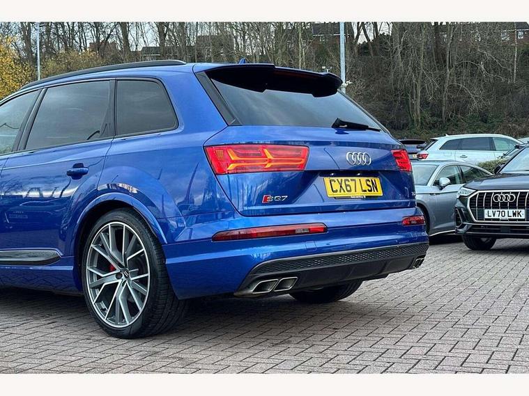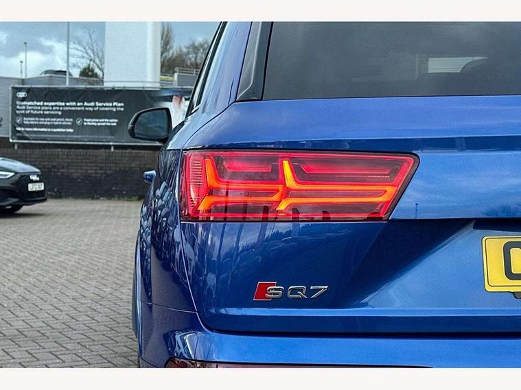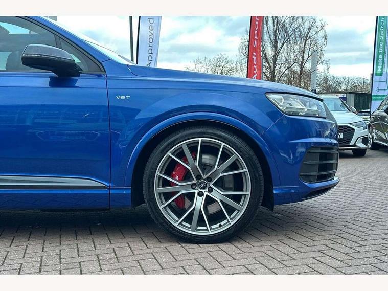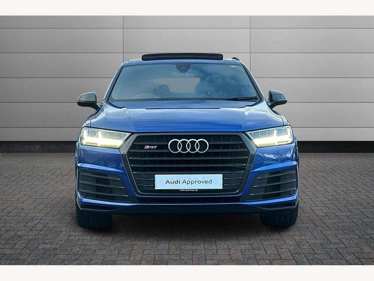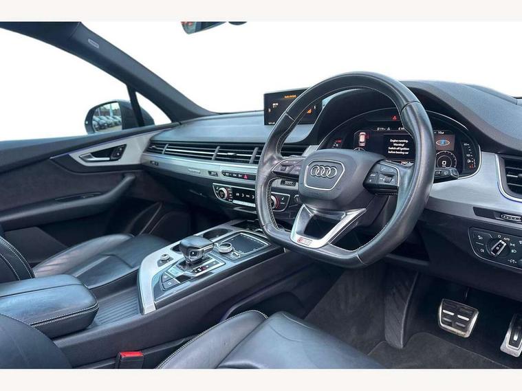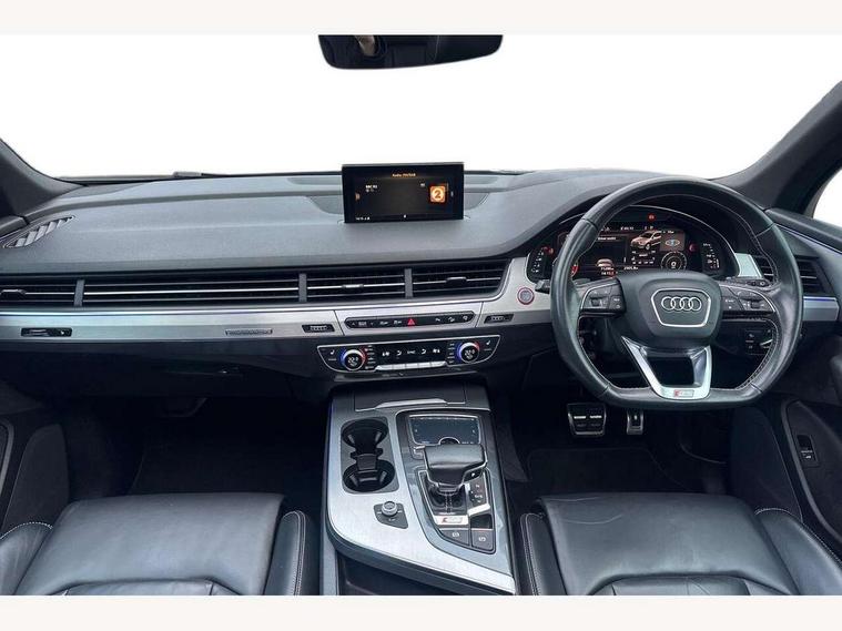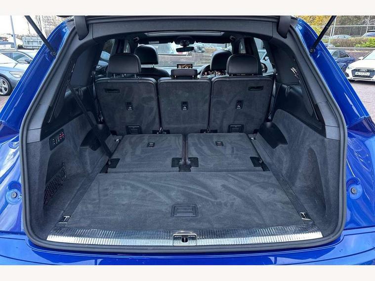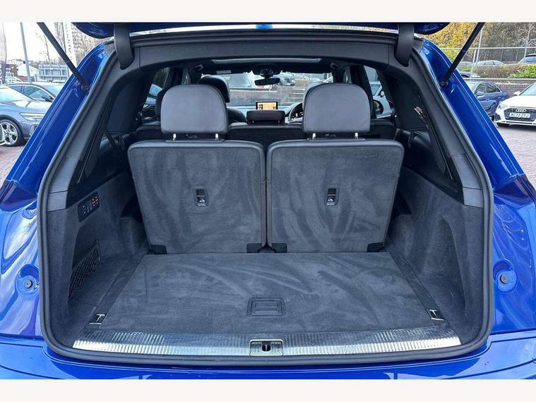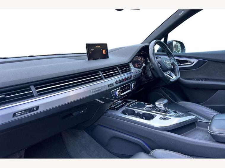 Audi drive select, Audi smartphone interface, Electric release luggage compartment, MMI - Multi Media Interface control system, MMI navigation plus with touch and 8" colour display, DVD, SD card reader, 10GB music storage, Mobile phone preparation with bluetooth interface, Remote electric boot opening/closing, Service interval indicator, Servotronic speed related PAS, Speed limiter, Voice control system, 85 litre fuel tank, Adaptive air suspension, 2 USB ports, Audi music interface, Aux-in socket, DAB digital radio module, MMI radio plus, Acoustic windscreen, Active exhaust sound system, Auto dimming rear view mirror, Body coloured bumpers, Dual branch oval twin exhaust tailpipes, Dynamic rear indicators, Electric front+rear windows, Headlight washers, High beam assist, LED daytime running lights, LED tail lights, Loading sill protector in stainless steel, Platinum grey front lip spoiler, Rain and light sensors, Rear wiper, Roof spoiler, S body styling, 2 cupholders in front centre console, 35/30/35 split fold 2nd row seats, 4 way electrically adjustable lumbar support for drivers seat, 4 way electrically adjustable lumbar support for front passenger seat, Aluminium scuff plates, Door sill trims with S line logo, Electric 3rd row 50/50 split/fold, Electric adjustable front seats, Four zone electronic climate control, Front ashtray and cigar lighter, Front centre comfort armrest with storage + cupholders, Front head restraints, Gearshift paddles, Heated front seats, ISOFIX on front passenger and rear outer seats, Leather gear knob, Rear centre armrest with 2 cupholders, Rear headrests, Stainless steel pedals, Sunvisors with illuminated vanity mirrors, Top tether anchor plate for isofix child seat, Interior light pack - Q7, 3 point seatbelts on all seats, ABS+Electronic Brake force Distribution, Curtain airbags, Driver and passenger airbags, EDL + ASR, Electrically operated child locks on rear doors, Electromechanical parking brake, ESP, Front passenger airbag deactivation, Front side airbags, Hill descent control, Hill hold assist, Seatbelt warning, Traction control, Tyre pressure monitoring system, Warning triangle and first aid kit, Alarm with interior monitoring, Immobiliser, Keyless Go access/ignition system, Locking wheel bolts, Remote central locking, Chrome door inserts, Tyre repair kit,