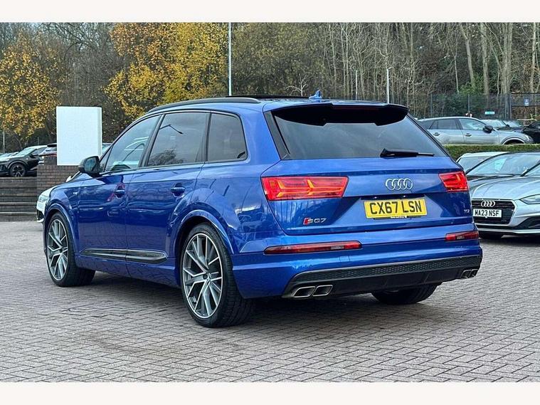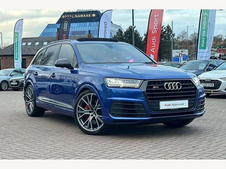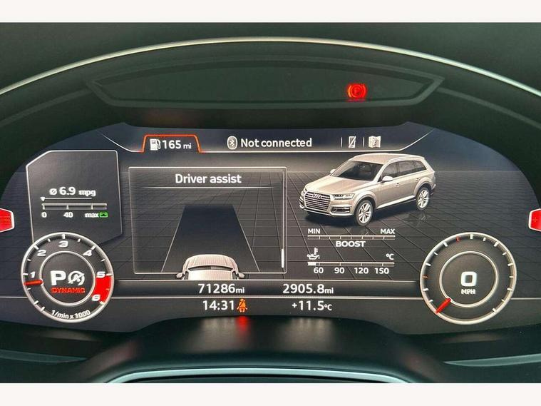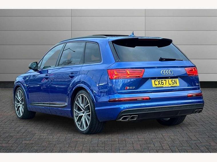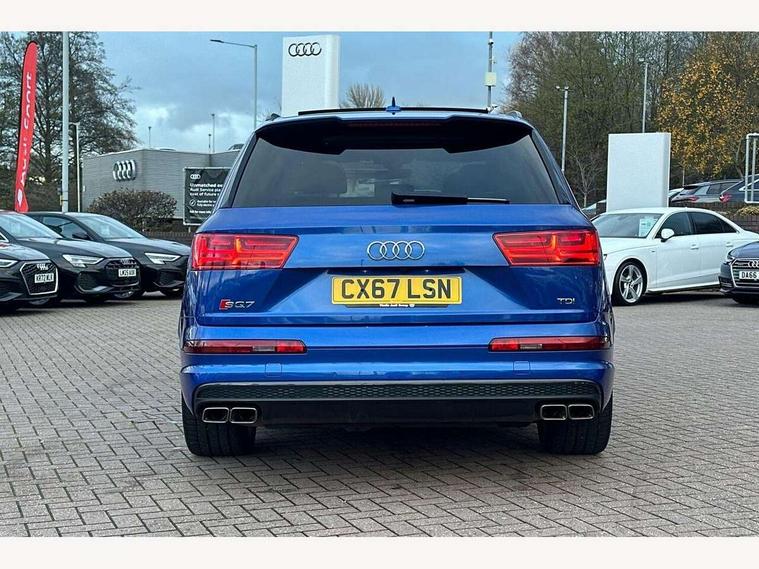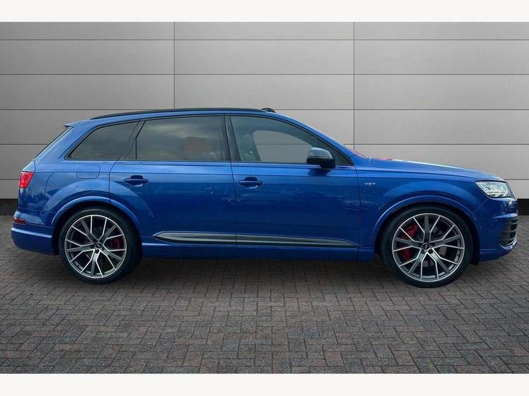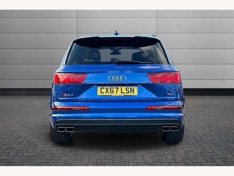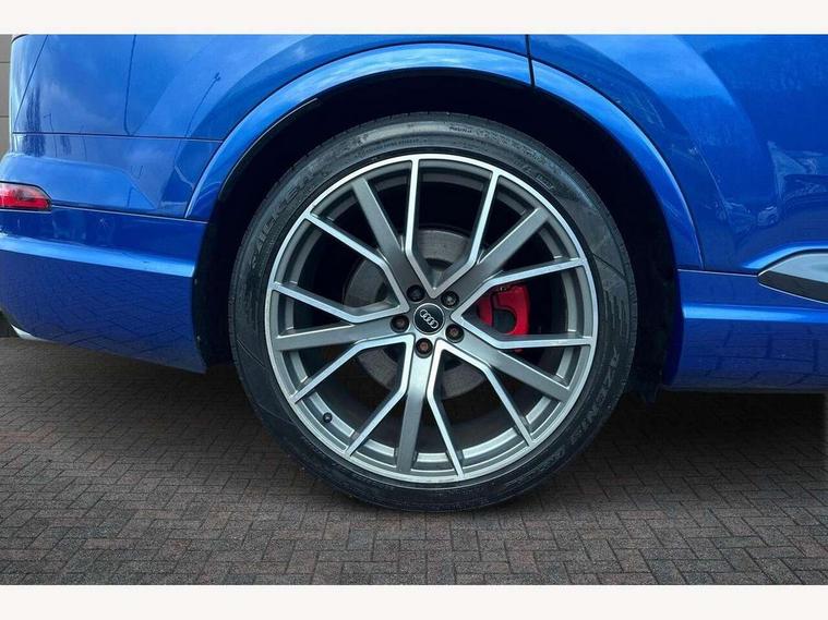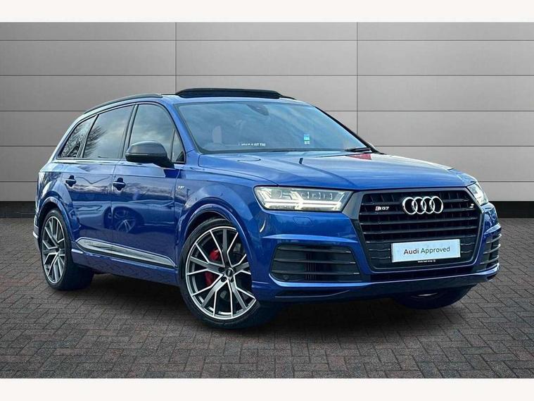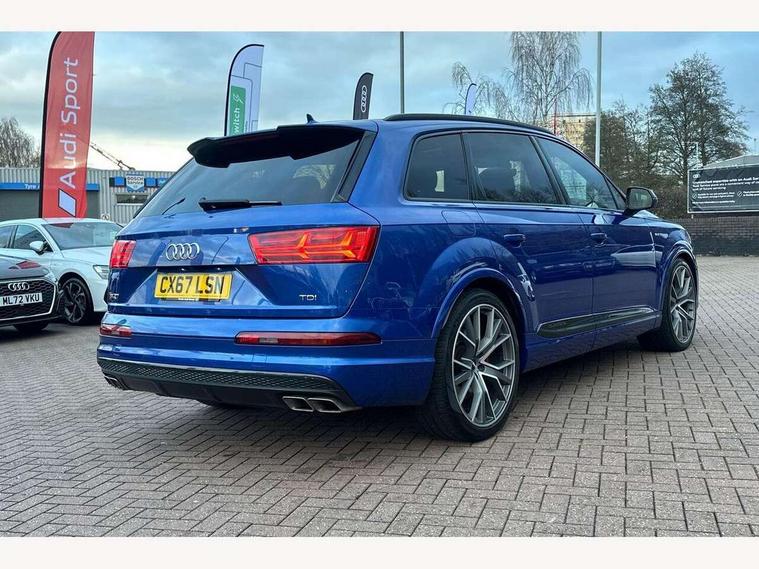 Audi drive select, Audi smartphone interface, Electric release luggage compartment, MMI - Multi Media Interface control system, MMI navigation plus with touch and 8" colour display, DVD, SD card reader, 10GB music storage, Mobile phone preparation with bluetooth interface, Remote electric boot opening/closing, Service interval indicator, Servotronic speed related PAS, Speed limiter, Voice control system, 85 litre fuel tank, Adaptive air suspension, 2 USB ports, Audi music interface, Aux-in socket, DAB digital radio module, MMI radio plus, Acoustic windscreen, Active exhaust sound system, Auto dimming rear view mirror, Body coloured bumpers, Dual branch oval twin exhaust tailpipes, Dynamic rear indicators, Electric front+rear windows, Headlight washers, High beam assist, LED daytime running lights, LED tail lights, Loading sill protector in stainless steel, Platinum grey front lip spoiler, Rain and light sensors, Rear wiper, Roof spoiler, S body styling, 2 cupholders in front centre console, 35/30/35 split fold 2nd row seats, 4 way electrically adjustable lumbar support for drivers seat, 4 way electrically adjustable lumbar support for front passenger seat, Aluminium scuff plates, Door sill trims with S line logo, Electric 3rd row 50/50 split/fold, Electric adjustable front seats, Four zone electronic climate control, Front ashtray and cigar lighter, Front centre comfort armrest with storage + cupholders, Front head restraints, Gearshift paddles, Heated front seats, ISOFIX on front passenger and rear outer seats, Leather gear knob, Rear centre armrest with 2 cupholders, Rear headrests, Stainless steel pedals, Sunvisors with illuminated vanity mirrors, Top tether anchor plate for isofix child seat, Interior light pack - Q7, 3 point seatbelts on all seats, ABS+Electronic Brake force Distribution, Curtain airbags, Driver and passenger airbags, EDL + ASR, Electrically operated child locks on rear doors, Electromechanical parking brake, ESP, Front passenger airbag deactivation, Front side airbags, Hill descent control, Hill hold assist, Seatbelt warning, Traction control, Tyre pressure monitoring system, Warning triangle and first aid kit, Alarm with interior monitoring, Immobiliser, Keyless Go access/ignition system, Locking wheel bolts, Remote central locking, Chrome door inserts, Tyre repair kit,