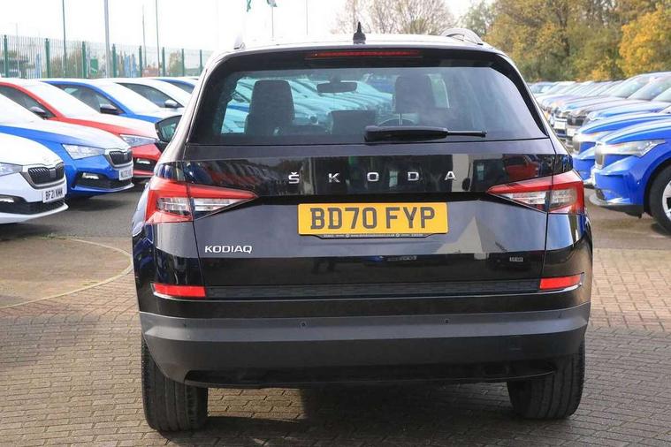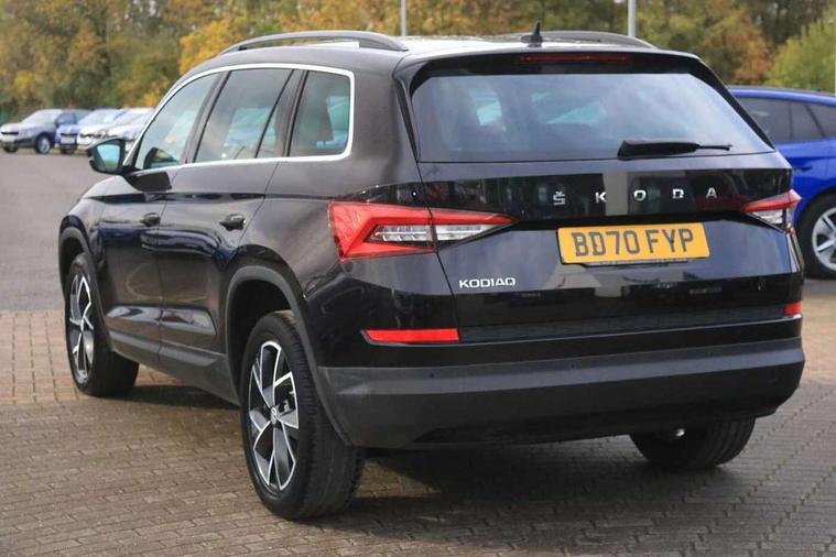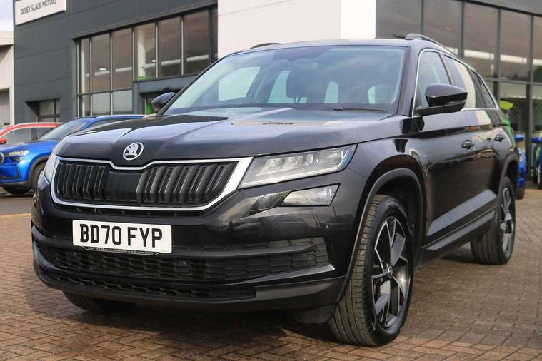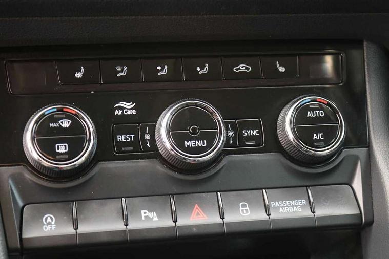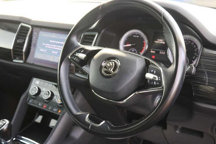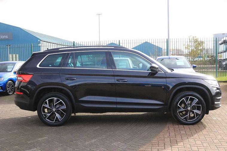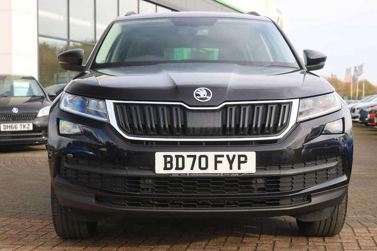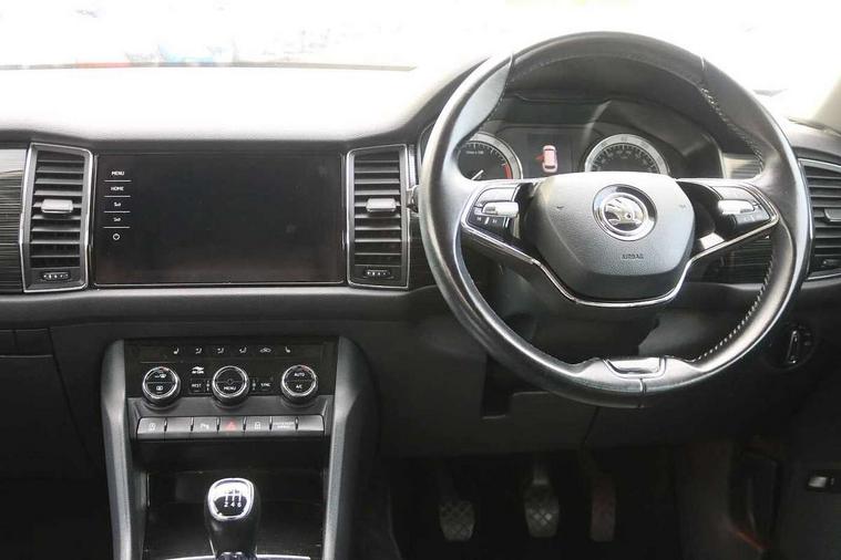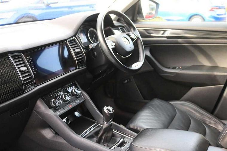 Bluetooth system, Columbus satellite navigation with 9.2" touch screen and integrated Wi-Fi + WLAN and web radio, Digital voice enhancement, ECO Stop/start function, Exterior temperature indicator, Map care, SmartLink plus, Speed limiter, Tailgate unlocking from outside, USB C Port x 2 in front centre console, Bolero Radio, DAB Digital radio, DVD System, Aero front windscreen wipers with intermittent function, Aero rear window wiper, Auto dimming rear view mirror, Automatic activation of hazard warning lights, Black electric window control buttons, Black wheel arch surrounds, Body colour bumpers, Body colour door mirrors and handles, Electric front and rear windows, Electrically adjustable, heated and folding door mirrors, Front and Rear door steps, Full LED Headlights with adaptive front light system and LED daytime running lights, Headlight washers, Heated rear window, Invisible tailpipe, LED front fog lights with static cornering light function, LED rear fog light, LED third brake light in rear spoiler, Light assistant (coming home/tunnel light), Radiator grille frame in matt black with chrome strip, Rain and light sensors, Rear spoiler, Safety reflectors on front and rear doors, Sunset privacy glass, 12V socket in boot, 2 rails with 2 hooks including 4 hooks for net programme, 4 foldable roof handles with rear coat hooks, 4 lashing points on luggage floor, 60:40 foldable rear seat with sliding adjustment and backrest angle adjustment, Bottle holders in door panel in the 1.5 litre front and 1 litre rear, Cargo storage compartments, Centre console with open storage box, cup holder and 12V socket, Chrome headlight control button, Chrome interior door handles, Coat hooks on B pillar, Covered storage compartment on driver side, Front and rear door armrest with black adductor trim, Front and rear height adjustable headrests, Front centre armrest with storage compartment, cup holder and 12V socket, Front courtesy lights, Gear shift lever with chrome frame and black gloss insert, Illuminated and cooled glovebox, Illuminated luggage compartment, Isofix child seat fittings in outer rear seats with top tether, Manually adjustable steering column, Net programme in boot (1x horizontal Net, 2x vertical Nets), Overhead glasses storage compartment, Pollen filter, Rear centre armrest with cupholders, Roll up luggage compartment cover with intermediate position, Small Bags on the inner sides of the front backrests, Storage compartment in lower middle instrument panel with closing, Three rear height adjustable headrests, Ticket holder on A Pillar, Umbrella in door panel, Chrome pack - Kodiaq, Auto door release and activation of warning lights in the event of an accident, Driver and passenger airbags, Electronic parking brake with hill hold control, Emergency rear braking signal, ESC (incl. ABS+MSR+ASR+EDS+HBA+DSR+RBS+MKB), Front and rear three point safety belt on all seats, Front assist includes AEB city/urban, Front passenger airbag deactivation switch, Front side airbags, Fuel cut off safety device, Head and knee airbags, Rear disc brakes, Safety vest holder in door, Seat belt reminder for all seats, Two tone horn, Tyre pressure monitor, Warning lights in front doors, Alarm with interior monitoring and tilt sensor with safe function, Immobiliser, Keyless entry and start system (KESSY), Remote central locking,