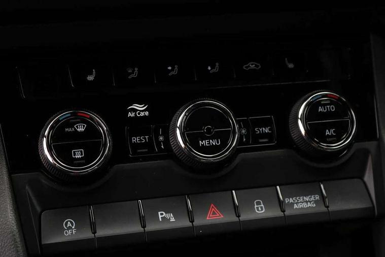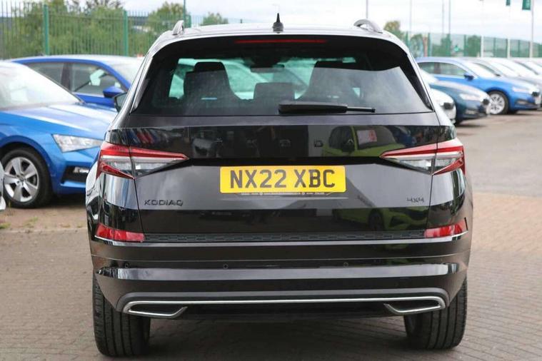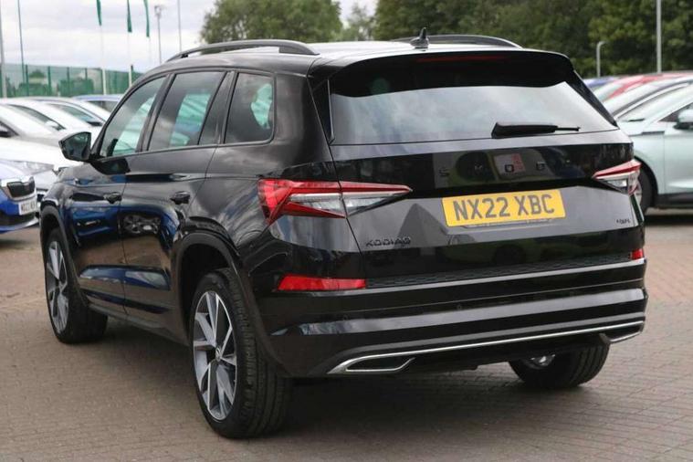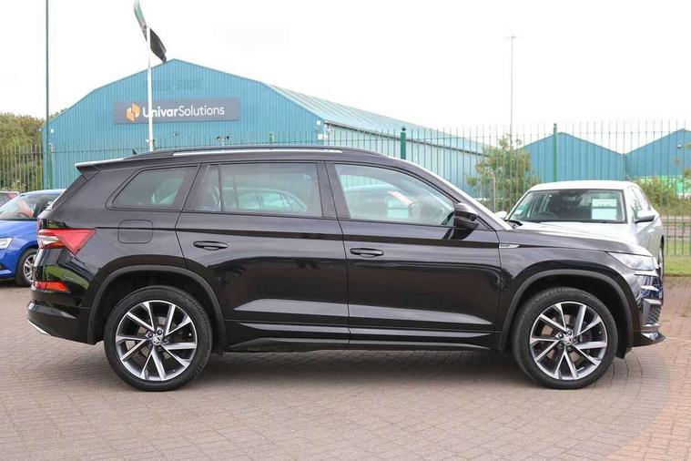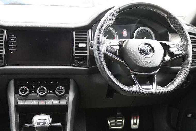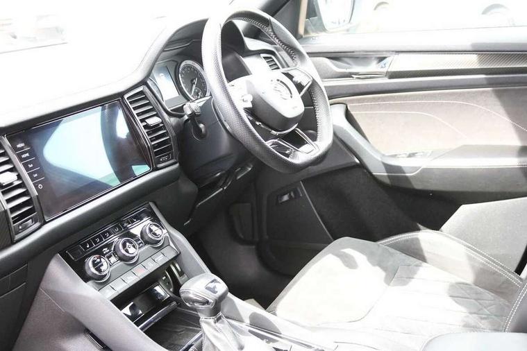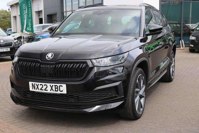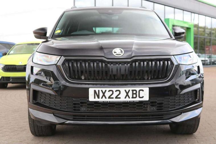 Bluetooth system, Columbus satellite navigation with 9.2" touchscreen, integrated Wi-Fi, web radio, E-call, ECO Stop/start function, Exterior temperature indicator, Progressive steering, Rear view camera, Smartlink wireless for apple carplay and wired for android auto, Speed limiter, Tailgate unlocking from outside, USB C Port x 2 in front centre console, Wireless charging, 8 Speakers, DAB Digital radio, Aero front windscreen wipers with intermittent function, Aero rear window wiper, Auto dimming rear view mirror, Black roof rails, Black sports styling including front grille and window surrounds, Black wheel arch surrounds, Body colour bumpers, Body colour door handles, Electric adjustable/heated/folding door mirrors, driver side auto dimming with boarding sports and memory function, Electric front and rear windows, Extended rear spoiler with finlets in gloss black, Front fog lights, Full LED matrix headlights with AFS (adaptive front light system), cornering function and AWL (all weather lighting system), Gloss black door mirrors, Headlight washers, Heated rear window, Invisible tailpipe, LED daytime running lights, LED rear fog light, LED third brake light in rear spoiler, Light assistant (coming/leaving home/tunnel light), Off-road style lower front bumper element, Privacy glass, Rain and light sensors, Rear diffuser, Rear LED lights (high functionality) with welcome effect and dynamic indicators, Rear side wing doors, Safety reflectors on front and rear doors, Sportline badge on front fender, Sports front and rear bumpers including lower rear chrome strip, Tailgate lettering in Black, Window control switches with black trim, Without engine designation, 12V socket in boot, 2 rails with 2 hooks, 2 seat bench in 3rd row, 3 seat bench in 2nd row, 4 foldable roof handles with rear coat hooks, 60:40 foldable rear seat with sliding adjustment and backrest angle adjustment, Aluminium pedals, Black roof headlining, Bottle holders in door panel in the 1.5 litre front and 1 litre rear, Cargo storage compartments, Chrome headlight control button, Chrome interior door handles, Coat hooks on B pillar, Covered storage compartment on driver side, Decorative door sills in the front and rear, Front centre armrest with storage compartment, cup holder and 12V socket, Front courtesy lights, Gear shift lever with chrome frame and black gloss insert, Grey stitching in front and rear armrests and door armrests + door inserts, Height adjustable front headrests, Illuminated and cooled glovebox, Illuminated luggage compartment, Isofix child seat fittings in outer rear seats with top tether, Manually adjustable steering column, Microsuede door panels, Net programme in boot (1x horizontal Net, 2x vertical Nets), Overhead glasses storage compartment, Pollen filter, Rear centre armrest with cupholders, Single front passenger seat, Sliding trunk cover, Small Bags on the inner sides of the front backrests, Sports seats, Sunvisors with illuminated vanity mirrors, Three rear height adjustable headrests, Ticket holder on A Pillar, Umbrella in door panel, Variable boot floor, LED Interior light pack - Kodiaq, Auto door release and activation of warning lights in the event of an accident, Child locks on rear doors, Driver and front passenger airbag with knee airbag and front passenger airbag deactivation, Electronic parking brake with hill start assist, Emergency rear braking signal, ESC (incl. ABS+MSR+ASR+EDS+HBA+DSR+RBS+MKB), Front assist with autonomous emergency braking, Front side airbags with curtain airbags, Fuel cut off safety device, Height adjustable front 3 point seatbelts + pretensioners, Hill hold control, Rear disc brakes, Safety vest holder in door, Seat belt reminder for all seats, Three point rear seat belts, Two tone horn, Tyre pressure monitor, Alarm with interior monitoring and tilt sensor with safe function, Anti-theft wheel bolts, Immobiliser, Keyless entry and start system (KESSY), Remote central locking with 2 keys, Black air vent surround, Carbon finish dashboard and door inserts, Grey stitching in dashboard, 20" Vega Anthracite alloy wheels, Temporary spare wheel (space saver),