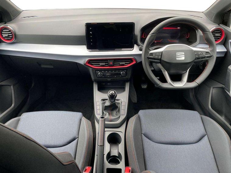 'Lights On' Reminder warning buzzer, 8" Digital cockpit, 9.2" touchscreen navigation system with type C USB socket, Voice control and DAB/AM/FM radio, Auto start and stop system, Bluetooth audio streaming with handsfree system, Digital clock, E-call, Full link smartphone integration with mirror link, wireless apple carplay, Google android auto + USB Type C cable for apple and android devices, Lane assist, Low fuel warning light, Outside temperature gauge, Power Steering, Rear parking sensor, Seat connect plus with safety, service, remote and online, SEAT drive profiles and ECO function, SEAT logo boot release, Speed limiter, Traffic sign recognition, Trip computer, Sports suspension, Auxiliary input socket, Radio/MP3 player, SD card slot, Steering wheel mounted controls, Anti theft roof antenna, Auto dimming rear view mirror, Automatic rain sensing wipers, Black door mirror caps, Body colour bumpers, Body colour door handles, Brilliant black window surrounds, Dark tinted rear windows, Electric adjustable/heated/folding door mirrors, Electric front windows, Electric headlight adjustment, Electric rear windows, Front/rear fog lights, FULL LED automatic headlights with dynamic headlight range control, coming and leaving home, LED daytime running lights, LED 3rd brake light, LED tail lights, Rear roof spoiler with FR twin exhausts, Rear side wing doors, Rear wiper, 3 seat bench in 2nd row, 60/40 split folding rear seat, Ambient interior lighting, Chrome detailing and black headlining, Cloth upholstery, Dual zone climate control with combination filter, Front courtesy lights, Front cupholders x 2, Front reading lights, Gear shift indicator, Glovebox, Height adjustable front and rear headrests (five), Height adjustable front seats, Height/reach adjust steering wheel, Illuminated air vent surrounds, Illuminated boot, Instrument lighting with brightness control, Isofix, Leather multifunction flat bottomed sports steering wheel, Passenger sunvisor, Single front passenger seat, Sports seats, Sunvisors with mirror and driver side card holder, Safety and driving pack (S) - Ibiza, 3 point seatbelts on all 3 rear seats, ABS, Active front headrests, Child locks on rear doors, Electronic stability control, Energy recovery system, Front driver and passenger side airbags with curtain airbag and front passenger airbag deactivation, Hill hold control, Multi-Collision braking, Seat belt reminder for front and rear seats, Tiredness recognition system, Tyre pressure monitoring system, Locking wheel bolts, Perimeter alarm and interior monitoring with backup horn and tow away protection, Remote central locking + deadlocks, 17" Alloy wheels in Brilliant silver,