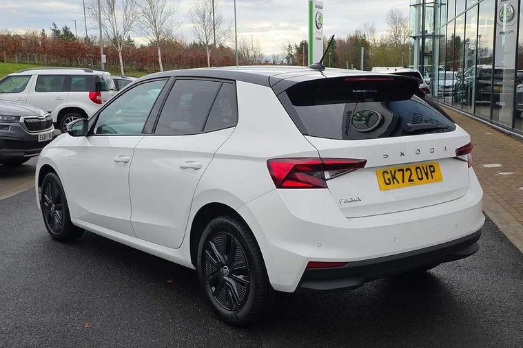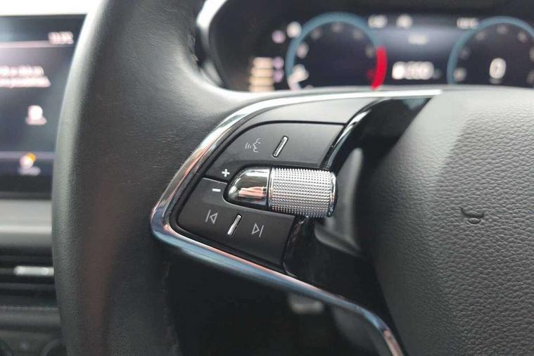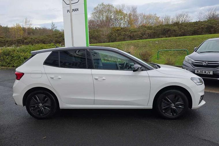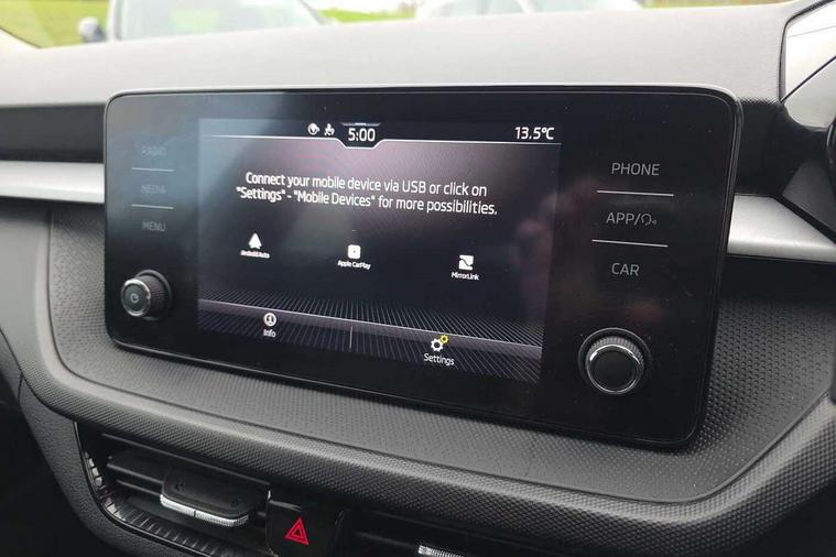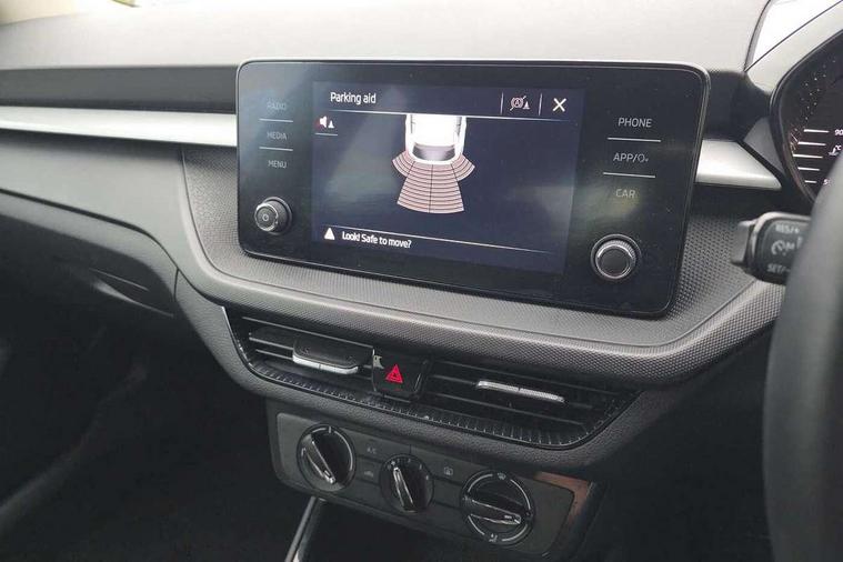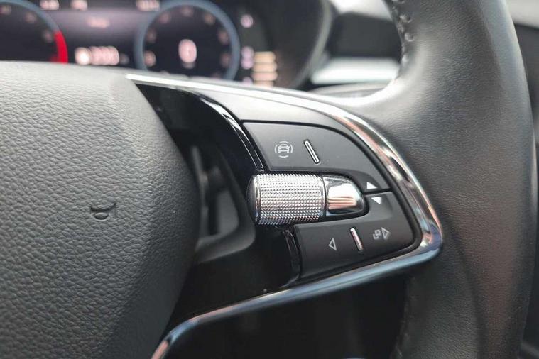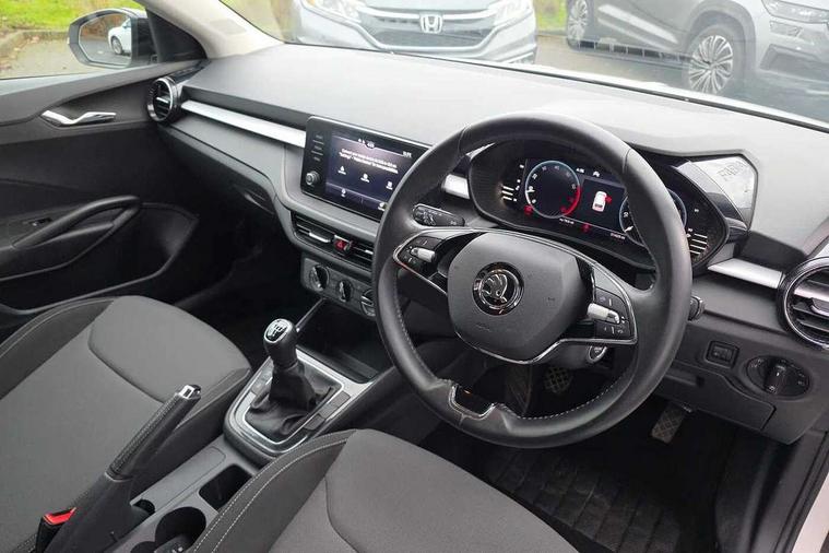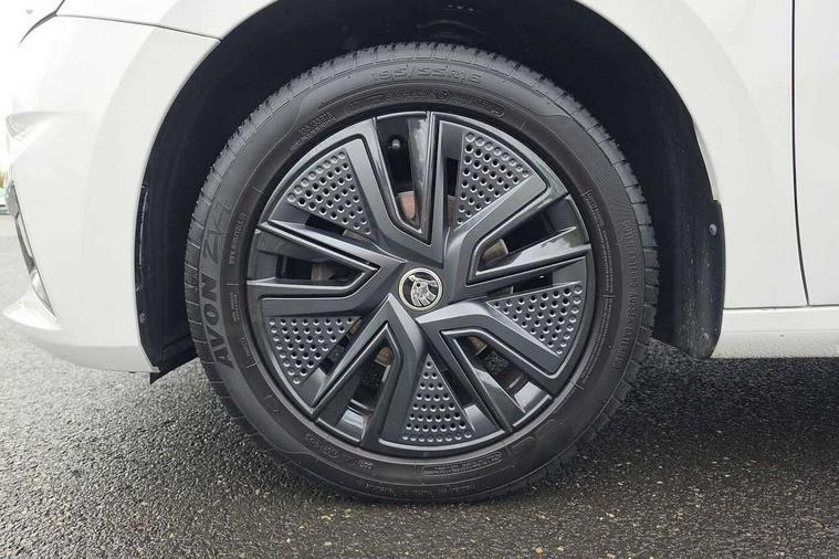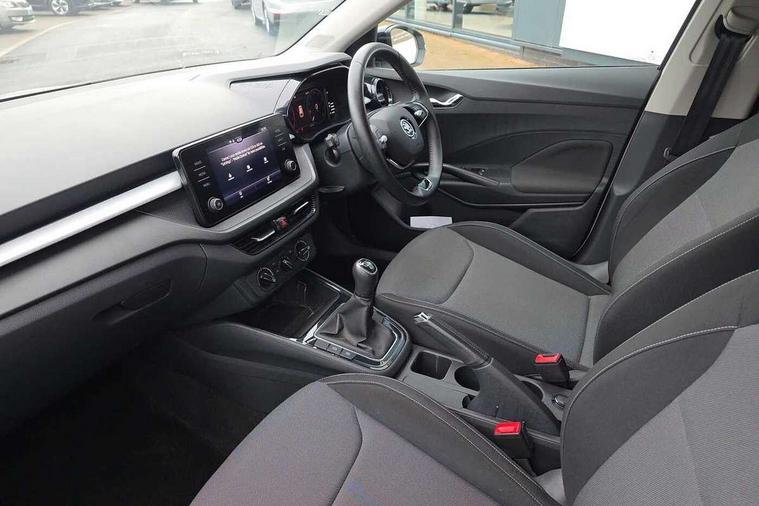 Bluetooth connection, Driver alert system - DAS, Electromechanical power steering, Exterior temperature gauge, Lane assist including road edge detection, Service interval indicator, Virtual cockpit with 10.25" colour display, 2x USB-C in the front (for data transmission and charging), 6 Speakers (4 in front and 2 in rear), Auxiliary socket for external MP3 player, Bolero radio with 8" colour display, DAB digital radio reception, Basic rear lights, Body coloured bumpers, Dimming rear view mirror with black frame, Door mirror integrated indicators, Electrically adjustable and heated door mirrors, Electrically adjustable front windows with function auto up/down, Front window wiper intermittent control, Headlight range control - Automatic, Ice scraper in fuel cap, LED daytime running lights with coming and leaving home feature, Mechanical adjustable rear windows, Privacy glass, Rear LED fog light, Rear side wing doors, Rear window wiper with washing nozzles, Roof mounted spoiler, SKODA tailgate lettering in chrome, Third brake light, 3 rear headrests, Backrest split and folding, Central console with fixed cup holder and storage box, Chrome handbrake release button, Fabric upholstery, Gearshift knob/handle in leather, Grain satin black interior door handles, Hand brake lever handle in leather, Height adjustable front headrests, Height adjustable steering wheel, ISOFIX and TopTether anchorage points to the outer rear seats, ISOFIX and TopTether on the front passenger seat, Luggage compartment lighting, Pollen filter, Rear seat bench unsplit, Single front passenger seat, Storm grey headlining, Sun visors with mirror and airbag label on passenger side, Ticket holder, Umbrella in drivers door, 3-point height adjustable front seats belts with pretensioner and force limiter, Automatic warning lights in case of crash, Driver and passengers airbag with switch off function, e-Call+, ESC including ABS, MSR, ASR, EDS, HBA and XDS, Front and rear seat belt warning, FRONT ASSIST (AEB City and AEB Inter Urban), Front side airbags, Head airbags, One tone horn, Pedestrian protection, Three rear 3-points safety seat belts with pretensioner and force limiter including stop function for outer rear seat belts, Tyre pressure monitoring system, Anti-theft alarm system including immobiliser, interior monitoring, backup horn, and towing protection, Anodized cross line upper decorative trim, Colour Edition air vents, Grain satin black central console cover, Grain satin black lower decorative trim, Satin black door and side trim panel in front, Anti-theft wheel bolts protection, Super-low rolling resistance tyres,