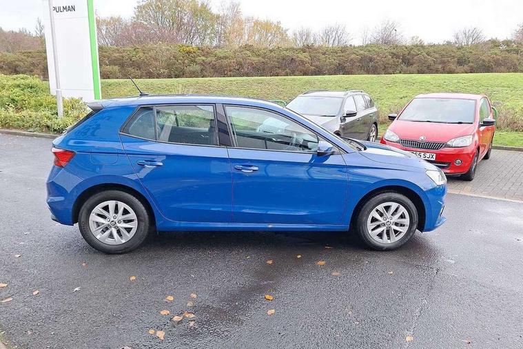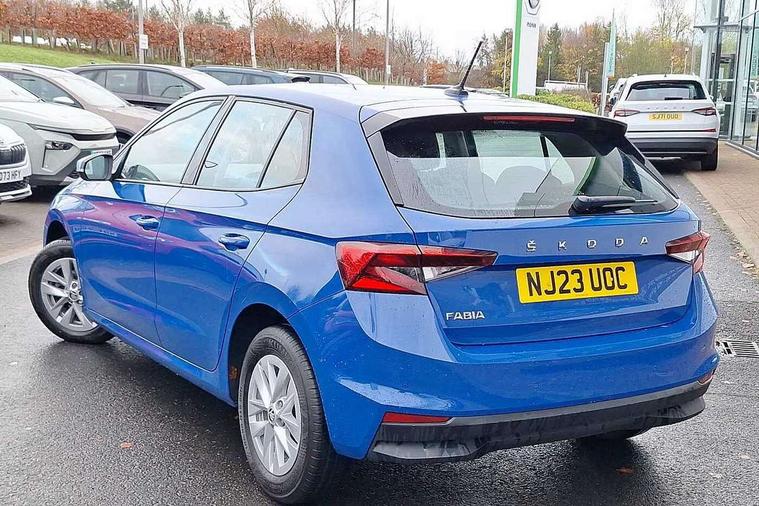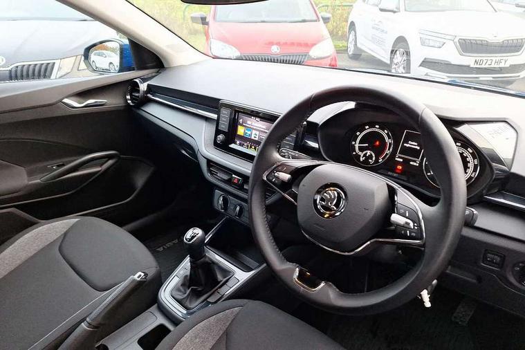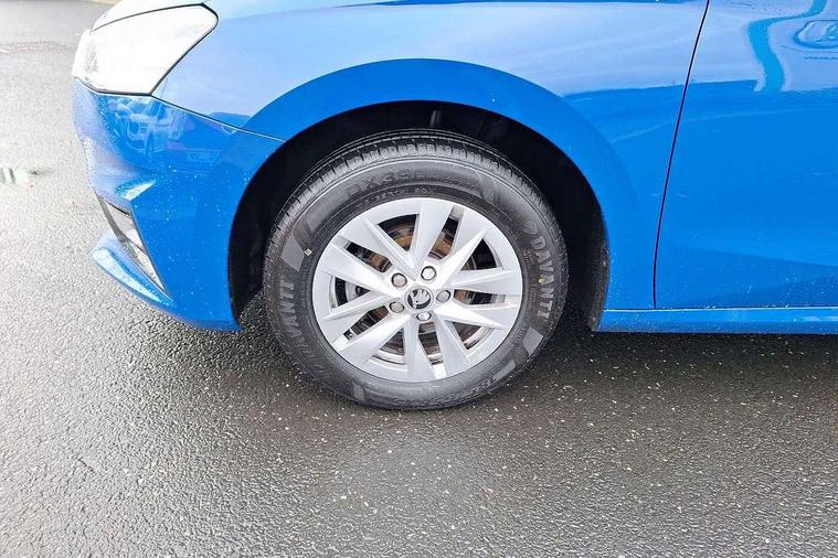 Bluetooth connection, Driver alert system - DAS, Electromechanical power steering, Exterior temperature gauge, Lane assist including road edge detection, Multifunction trip computer in black and white, Service interval indicator, Speed limiter, 2x USB-C in the front (for data transmission and charging), 4 speakers in front, Auxiliary socket for external MP3 player, DAB digital radio reception, Radio Swing with 6.5" colour display, Basic LED Headlights, Basic rear lights, Body colour door mirrors, Body coloured bumpers, Dimming rear view mirror with black frame, Door mirror integrated indicators, Electrically adjustable and heated door mirrors, Electrically adjustable front windows with function auto up/down, Front fog lights, Front window wiper intermittent control, Headlight range control - Automatic, Ice scraper in fuel cap, LED daytime running lights with coming and leaving home feature, Mechanical adjustable rear windows, Rain sensor, Rear LED fog light, Rear side wing doors, Rear window wiper with washing nozzles, Roof mounted spoiler, SKODA tailgate lettering in chrome, Third brake light, 2 reading lights in front and 2 reading lights in rear, 2 spoke leather multifunction steering wheel, 3 rear headrests, Backrest split and folding, Central console with fixed cup holder and storage box, Chrome handbrake release button, Fabric upholstery, Gearshift knob/handle in leather, Grain satin black interior door handles, Hand brake lever handle in leather, Height adjustable front headrests, Height adjustable front seats, Height adjustable steering wheel, ISOFIX and TopTether anchorage points to the outer rear seats, ISOFIX and TopTether on the front passenger seat, Luggage compartment lighting, Manual air conditioning, Manually adjustable lumbar support in front seats, Pollen filter, Rear seat bench unsplit, Single front passenger seat, Storm grey headlining, Sun visors with mirror and airbag label on passenger side, Ticket holder, 3-point height adjustable front seats belts with pretensioner and force limiter, Automatic warning lights in case of crash, Driver and passengers airbag with switch off function, e-Call+, ESC including ABS, MSR, ASR, EDS, HBA and XDS, Front and rear seat belt warning, FRONT ASSIST (AEB City and AEB Inter Urban), Front side airbags, Head airbags, One tone horn, Pedestrian protection, Three rear 3-points safety seat belts with pretensioner and force limiter including stop function for outer rear seat belts, Tyre pressure monitoring system, Anti-theft alarm system including immobiliser, interior monitoring, backup horn, and towing protection, Central locking with radio remote control, interior controls, SAFE function and 2 foldable keys, Black painted air vents, Glossy black decorative trim, Grain satin black central console cover, Grain satin black lower decorative trim, Satin black door and side trim panel in front, Anti-theft wheel bolts protection, Super-low rolling resistance tyres,