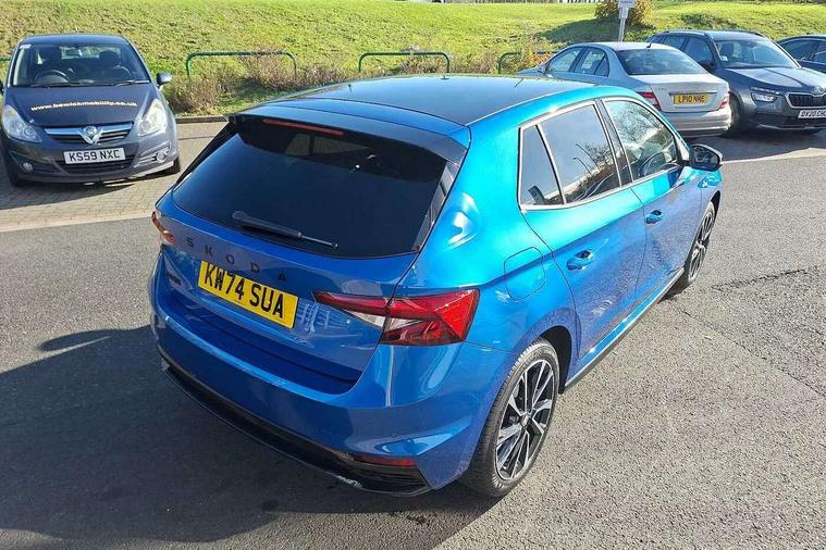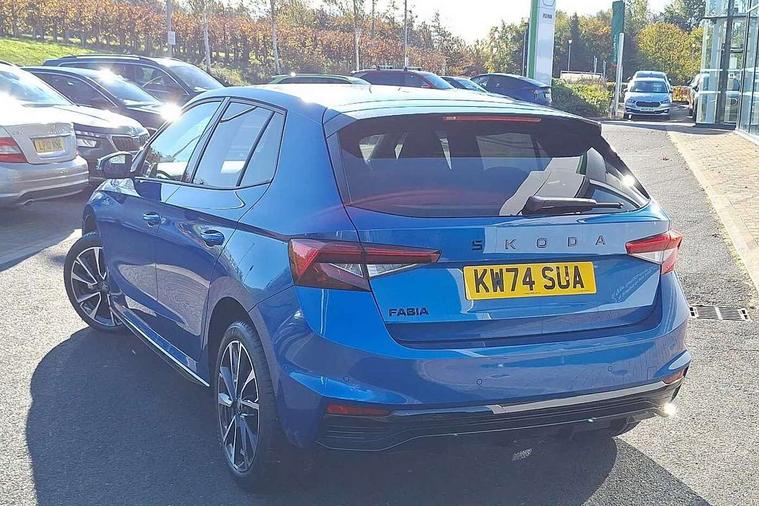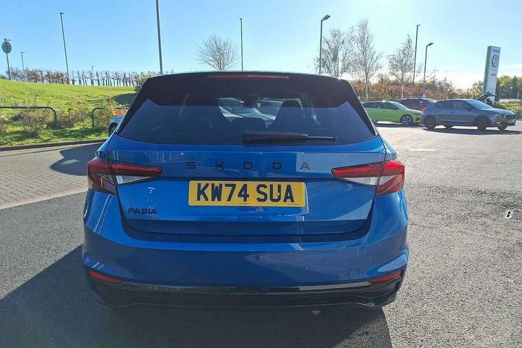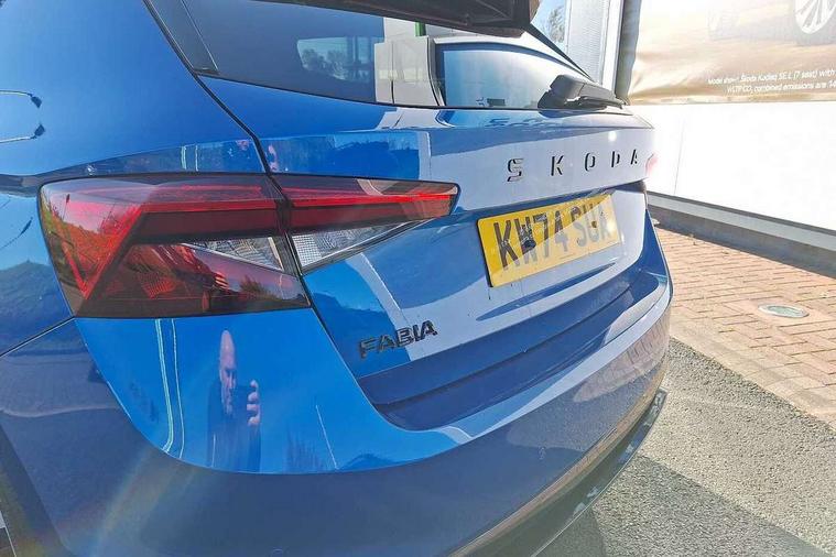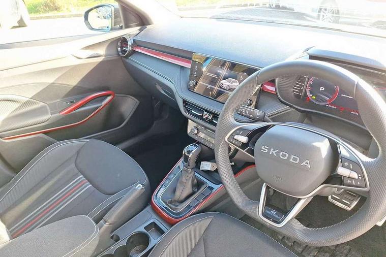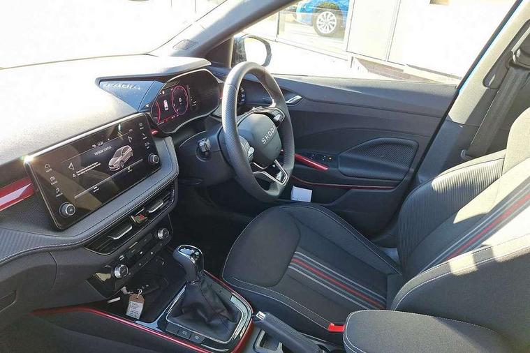 Advanced driver attention and drowsiness monitor, Bluetooth connection, Electromechanical power steering, Exterior temperature gauge, Service interval indicator, Traffic sign recognition, Virtual cockpit with 10.25" colour display, Wireless SmartLink for Apple CarPlay and Android Auto, 6 Speakers (4 in front and 2 in rear), Auxiliary socket for external MP3 player, DAB digital radio reception, Auto dimming rear view mirror, Black radiator grille, Body coloured bumpers, Door mirror integrated indicators, Front and rear electric windows, Front window wiper intermittent control, Headlight range control - Automatic, Ice scraper in fuel cap, LED daytime running lights with coming and leaving home feature, LED rear lights, Monte Carlo badging, Privacy glass, Rear LED fog light, Rear side wing doors, Rear window wiper with washing nozzles, Roof mounted spoiler, SKODA tailgate lettering in black, Sports bumpers, Third brake light, 2 reading lights in front and 2 reading lights in rear, 3 rear headrests, Aluminium pedals, Backrest split and folding, Black headlining, Central console with removable cup holder and storage box, Chrome handbrake release button, Door sills with fabia badging, Dual zone air conditioning with climatronic electronic control, Fabric/artificial leather upholstery, Front centre armrest, Front sports seats, Gearshift knob/handle in leather, Hand brake lever handle in leather, Height adjustable front headrests, Height adjustable front seats, Height adjustable steering wheel, ISOFIX and TopTether anchorage points to the outer rear seats, ISOFIX and TopTether on the front passenger seat, Luggage compartment lighting, Manually adjustable lumbar support in front seats, Metallic painted red central console cover, Metallic red interior door handles, Pollen filter, Rear seat bench unsplit, Single front passenger seat, Sun visors with mirror and airbag label on passenger side, Textile floor mats, Ticket holder, Umbrella in drivers door, 3-point height adjustable front seats belts with pretensioner and force limiter, Automatic warning lights in case of crash, Driver and passengers airbag with switch off function, e-Call+, ESC including ABS, MSR, ASR, EDS, HBA and XDS, Front and rear seat belt warning, FRONT ASSIST (AEB City and AEB Inter Urban), Front side airbags, Head airbags, Hill hold control, One tone horn, Pedestrian protection, Three rear 3-points safety seat belts with pretensioner and force limiter including stop function for outer rear seat belts, Tyre pressure monitoring system, Anti-theft alarm system including immobiliser, interior monitoring, backup horn, and towing protection, Central locking with radio remote control, interior controls, SAFE function and 2 foldable keys, Carbon effect door and side trim panels, Carbon effect lower decorative trim with white stitching, Monte carlo air vents, Red metallic upper decorative trim, Anti-theft wheel bolts protection, Super-low rolling resistance tyres,