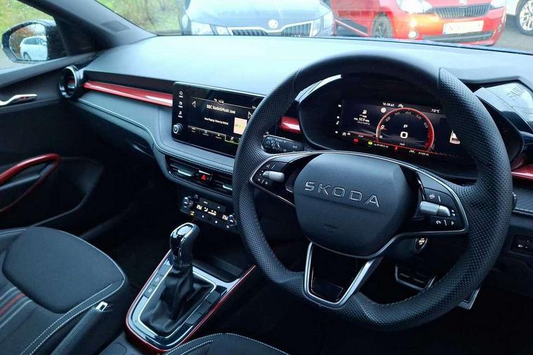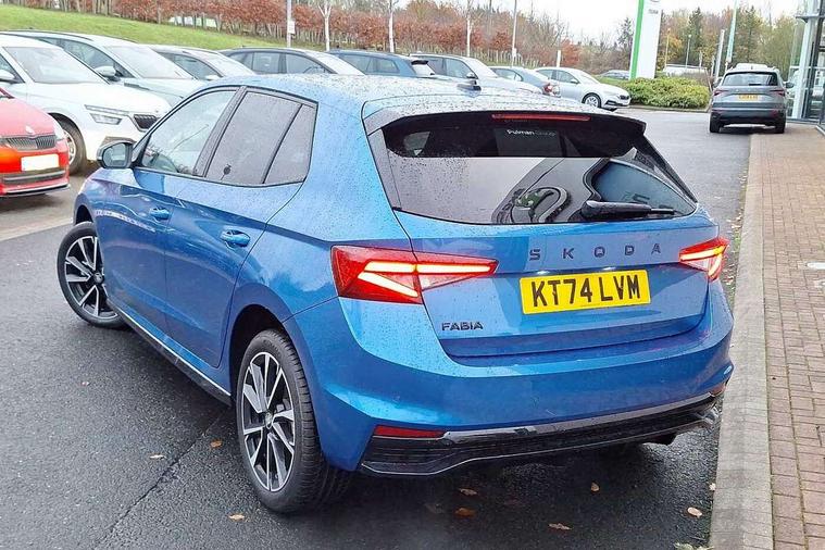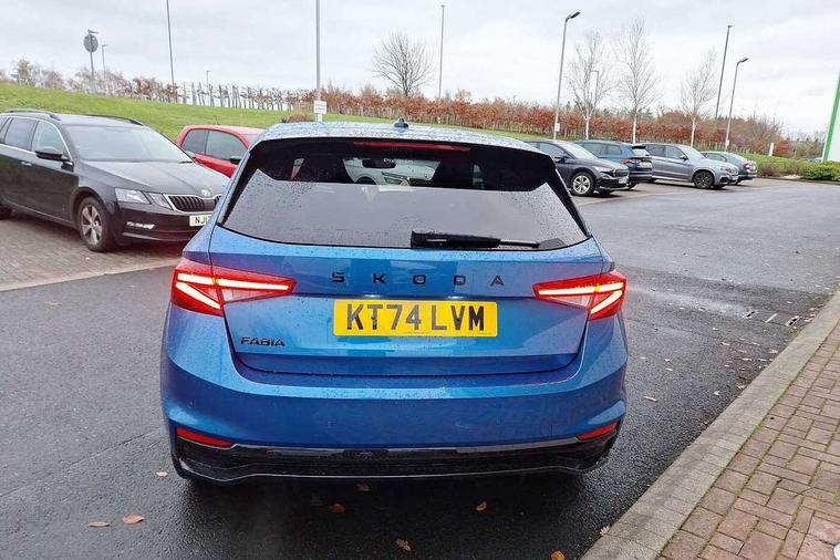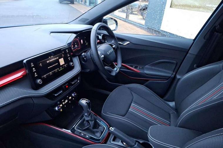 Advanced driver attention and drowsiness monitor, Bluetooth connection, Electromechanical power steering, Exterior temperature gauge, Service interval indicator, Traffic sign recognition, Virtual cockpit with 10.25" colour display, Wireless SmartLink for Apple CarPlay and Android Auto, 6 Speakers (4 in front and 2 in rear), Auxiliary socket for external MP3 player, DAB digital radio reception, Auto dimming rear view mirror, Black radiator grille, Body coloured bumpers, Door mirror integrated indicators, Front and rear electric windows, Front window wiper intermittent control, Headlight range control - Automatic, Ice scraper in fuel cap, LED daytime running lights with coming and leaving home feature, LED rear lights, Monte Carlo badging, Privacy glass, Rear LED fog light, Rear side wing doors, Rear window wiper with washing nozzles, Roof mounted spoiler, SKODA tailgate lettering in black, Sports bumpers, Third brake light, 2 reading lights in front and 2 reading lights in rear, 3 rear headrests, Aluminium pedals, Backrest split and folding, Black headlining, Central console with removable cup holder and storage box, Chrome handbrake release button, Door sills with fabia badging, Dual zone air conditioning with climatronic electronic control, Fabric/artificial leather upholstery, Front centre armrest, Front sports seats, Gearshift knob/handle in leather, Hand brake lever handle in leather, Height adjustable front headrests, Height adjustable front seats, Height adjustable steering wheel, ISOFIX and TopTether anchorage points to the outer rear seats, ISOFIX and TopTether on the front passenger seat, Luggage compartment lighting, Manually adjustable lumbar support in front seats, Metallic painted red central console cover, Metallic red interior door handles, Pollen filter, Rear seat bench unsplit, Single front passenger seat, Sun visors with mirror and airbag label on passenger side, Textile floor mats, Ticket holder, Umbrella in drivers door, 3-point height adjustable front seats belts with pretensioner and force limiter, Automatic warning lights in case of crash, Driver and passengers airbag with switch off function, e-Call+, ESC including ABS, MSR, ASR, EDS, HBA and XDS, Front and rear seat belt warning, FRONT ASSIST (AEB City and AEB Inter Urban), Front side airbags, Head airbags, Hill hold control, One tone horn, Pedestrian protection, Three rear 3-points safety seat belts with pretensioner and force limiter including stop function for outer rear seat belts, Tyre pressure monitoring system, Anti-theft alarm system including immobiliser, interior monitoring, backup horn, and towing protection, Central locking with radio remote control, interior controls, SAFE function and 2 foldable keys, Carbon effect door and side trim panels, Carbon effect lower decorative trim with white stitching, Monte carlo air vents, Red metallic upper decorative trim, Anti-theft wheel bolts protection, Super-low rolling resistance tyres,