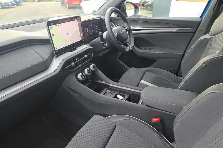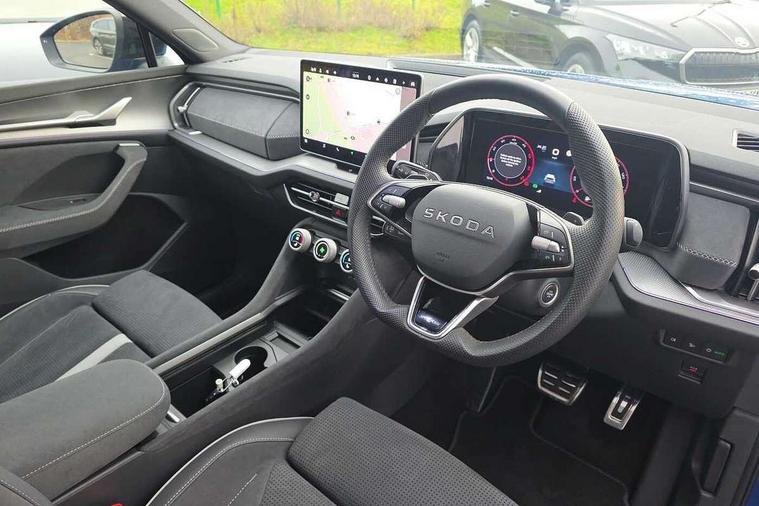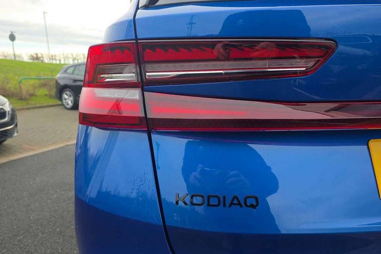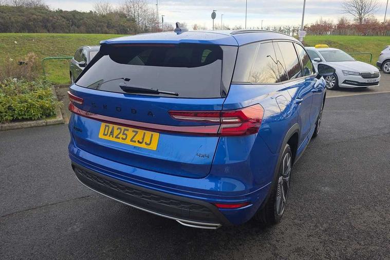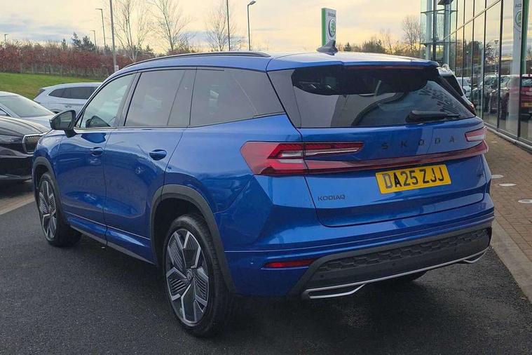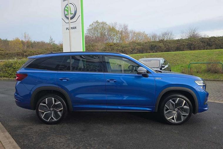 13" satellite navigation touchscreen display, Blind spot detection with door exit warning, Bluetooth system, ChatGPT functionality, Driver alert - Fatigue and drowsiness monitor, Dry display cleaner, Emergency call, Front and rear parking sensors, Front cross traffic assist, Lane assist, Off road modes, PAS, Rear traffic assist, Tailgate unlocking from outside, Traffic sign recognition, USB C Port x 2 in front centre console, Virtual Cockpit - 10.25" digital display, Voice control system, Wireless charging for two smartphones (15W) with cooling function, Wireless SmartLink for Apple CarPlay and Android Auto, Stop/start function, 2x USB-C in the rear, DAB Digital radio, Aero front windscreen wipers with intermittent function, Auto dimming rear view mirror, AWL (all weather lighting) and all weather light with cornering function, Black diffuser and decorative tailpipe with a unique dark chrome finish, Black roof rails, Black sports styling including front grille and window surrounds, Black wheel arch surrounds, Body colour door handles, Cornering light and poor weather light, Electric folding /adjustable/separted heated/folding door mirrors, auto dimming with boarding sports and memory function, Electric front and rear windows, Exterior black decorative trims, Front and rear sports bumpers including lower rear chrome strip, Gloss black door mirrors, Gloss black window frame and D pillar, Heat insulating glass in windshield, Heated rear window, Ice scraper in fuel tank cap, LED daytime running lights, LED third brake light in rear spoiler, Light assistant with automatic headlight control and coming home feature, Logo projection in door mirrors, Privacy glass, Rear roof spoiler, Rear side wing doors, Rear window wiper, Red decorative strip between rear LED lights, Safety reflectors on front and rear doors, Sportline badge on front fenders, Tailgate lettering in Black, Unique dark chrome design logo on alloy wheels, Window control switches with black trim, Windscreen wipers with rain sensor, Without engine designation, 1.5l bottle holder points in all door, 1x centre rear reading light, 2 seat bench in 3rd row, 3 configurable smart dials with 32mm coloured display, 3 seat bench in 2nd row, 4 foldable roof handles with rear coat hooks, Aluminium pedals, Ambient interior lighting - Dashboard, front-door stowage compartments, front and rear door panels and footwell lighting, Automatic gear selector on steering column, Chrome interior door handles, Driver/front passenger reading lights, Fabric headlining, Fixed bench 40:60:40 split folding backrests, Front and rear floor mats, Front centre armrest with jumbo box storage compartment, cup holder and 12V socket, Front sport seats, Height adjustable front headrests, Interior black decorative trims, Isofix child seat fittings in outer middle row rear seats and front passenger with top tether, Manually adjustable steering column, Pollen filter, Rear centre armrest with cupholders, Rear seat boot backrest release, Single front passenger seat, Skoda lettering on steering wheel, Storage pocket including mobile phone pockets on the backs of the front seats, Sunvisors with illuminated vanity mirrors, Three rear height adjustable headrests, Ticket holder on A Pillar, Tri zone climate control, Umbrella in door panel x1 made from sustainable materials, Upper and lower glovebox with card holder and coin compartment, USB C port by rear view mirror for charging only (15W), Acoustic package - Kodiaq, Performance package - Kodiaq, Sportline design selection pack - Kodiaq, Auto door release and activation of warning lights in the event of an accident, Driver and front passenger airbag with knee airbag and front passenger airbag deactivation, Electric child locks, Electronic parking brake, ESC (incl. ABS+EMD+MSR+ASR+EDL+HBA+DSR+RBS+ESBS+MCB+TSA+XDS), Front assist with braking reaction to vehicles, pedestrians and cyclists, Front disc brakes, Fuel cut off safety device, Height adjustable front 3 point seatbelts + pretensioners, Hill hold assist, Junction assist with automatic emergency braking, Rear disc brakes, Safety vest holder in door, Seat belt reminder for all seats, Three point rear seat belts, Two tone horn, Tyre pressure monitor, Alarm with interior monitoring and tilt sensor with safe function, Anti-theft wheel bolts, Immobiliser, Remote central locking with 2 keys, 20" Rila anthacite polished alloy wheel with black matte aero covers,