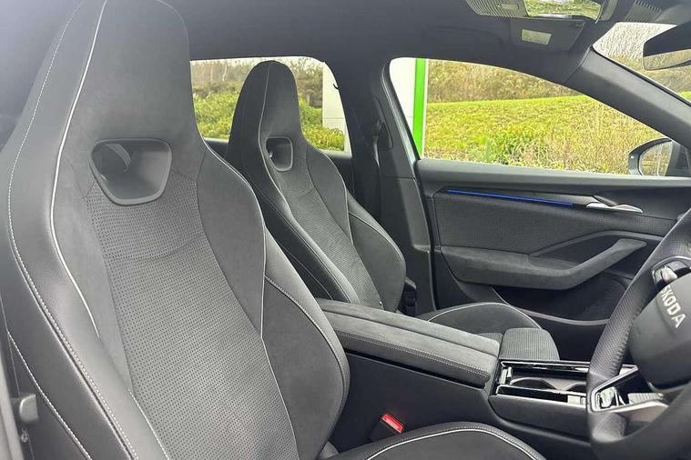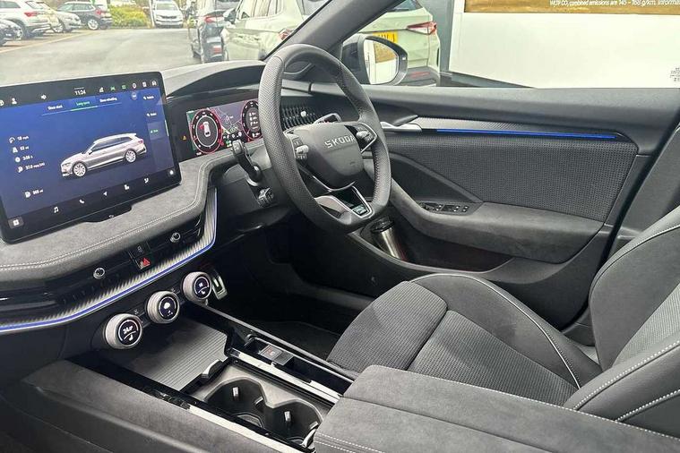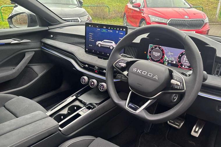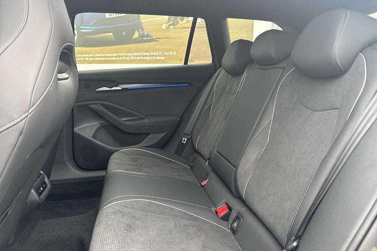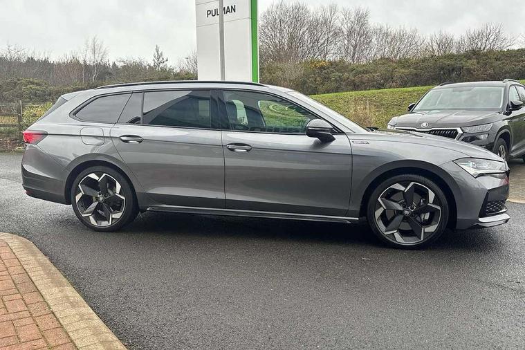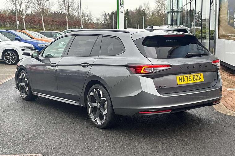 13" touchscreen display with satellite navigation, 4x USB-C ports (2x in front centre console and 2x in rear) (45W), Adaptive cruise control with speed assist, lane assist plus and traffic tram assist, Blind spot detection with door exit warning, Bluetooth system, CareConnect and Emergency Call, ChatGPT functionality, Driver fatigue sensor, Front assist with extended predictive pedestrian protection, Front cross traffic assist, PAS, Quick start all heating software functionality, Stop/start engine system, Traffic sign recognition, Turn assist with evasive assistance, Virtual Cockpit - 10.25" digital display, Voice control system, Washer for rear camera, Wireless charging for one smartphone (15W) with cooling function, Wireless smartlink apple carplay, SmartLink+ android auto, Dynamic chassis control plus with progressive dynamic steering, DAB Digital radio, Display cleaner, FM radio connection, Web radio connection, Acoustic side windows and interior noise suppression, Backdrop lighting, Black exterior styling window and grille surrounds, Black roof rails, Body colour door handles, Dynamic range control with poor weather light and integrated fog light, Electrically adjustable, heated, folding and driver side auto-dimming door mirrors with memory function, integrated indicators and logo projection, Frameless auto-dimming rear view mirror with USB-C, Gloss black door mirrors, Ice scraper in fuel tank cap, LED 3rd brake light, Light assist with High beam control, Light assistant (coming/leaving home/tunnel light), Privacy glass, Rear fog lights (x2), Rear roof spoiler, Rear side wing doors, Rear windscreen wiper, Skoda lettering in black, Sportline badging, Sports bumpers, Windscreen wipers with rain sensor, 12V socket 1x centre console 1x boot, 14-way electrically adjustable, memory, front seats with 4-way pneumatic lumbar support, and extendable thigh support with smart comfort entry aid, 2x cargo elements in boot, 2x light in boot, 3 seat bench in 2nd row, 4x foldable bag hooks in boot, 60:40 Split folding rear seats, Aluminium pedals, Bottle holders in the front doors 1.5 litre bottle and rear 1.5 litre bottle, Cup holder in front with easy open mat, Front armrest with storage box, Front sports seats, Heated and ventilated front seats, Height adjustable front and rear head restraints, Illuminated glovebox, Interior lights with control switches, Isofix child seat fittings in outer rear and front passenger seats, LED front and rear reading lights, Single front passenger seat, Skoda lettering on steering wheel, Storage compartment with cover, Storage pockets on back of front seats, Sun visors with illuminated vanity mirrors, Ticket holder on A Pillar, Tri zone climate control, Umbrella in driver's door, Light and view package - Superb, Transport package - Superb Estate, 3 rear seatbelts, 8 Airbags - Front driver and passenger, front side driver and passenger, centre, curtain front and rear, drivers knee, Crew protect assist, Driver and passenger seatbelts with warning light, Electronic parking brake, ESC including ABS, EBV, MSR, ASR, EDS, HBA, DSR, RBS, CBC, multi-collision brake (MKB) and Auto hold, Hill hold assist, Power operated child lock in rear doors, Alarm with interior monitoring tilt sensor and back up horn, Backrest remote release from trunk, Electronic engine immobiliser, Keyless start/stop, Remote central locking with SAFE system, Third key, Walk away locking, Decorative front door sills, 19" Torcular polished black alloy wheels with anti theft wheel bolts,