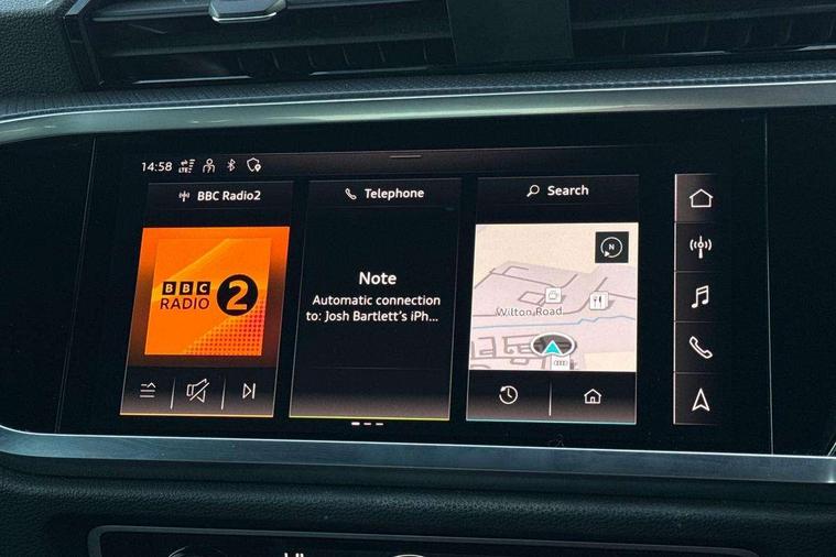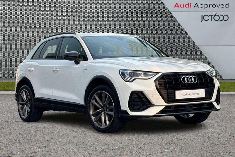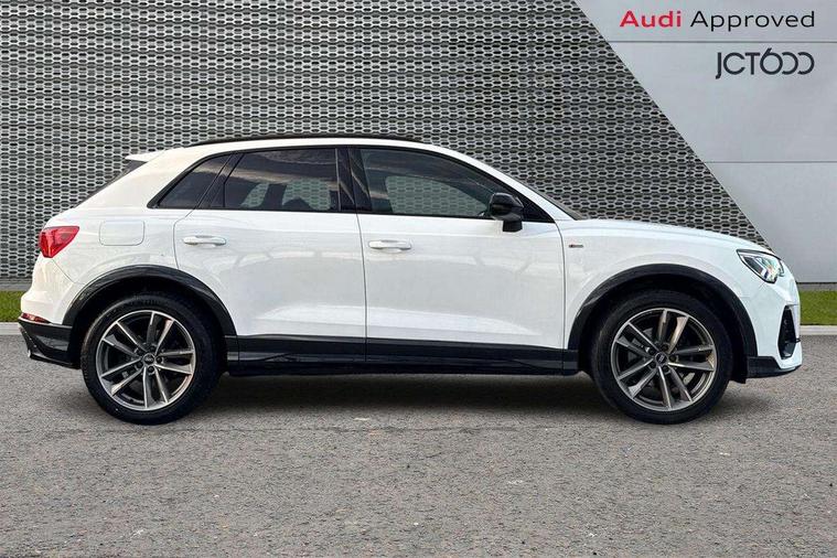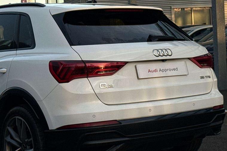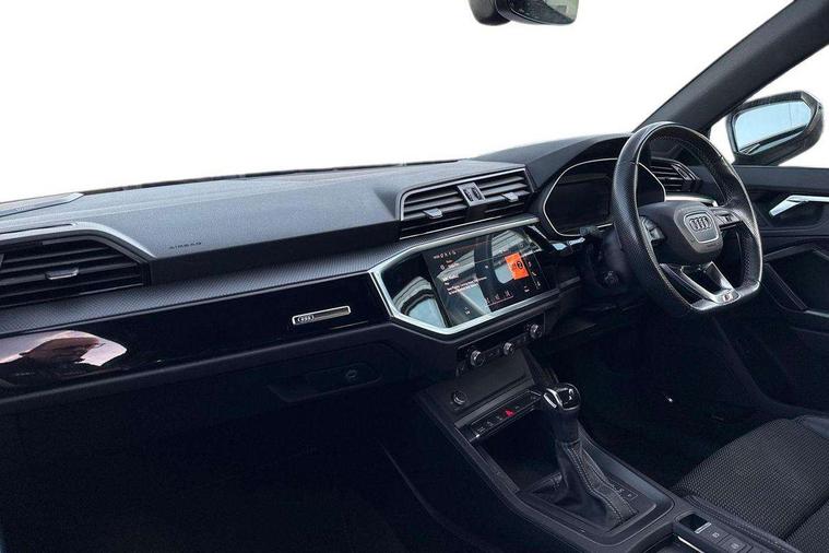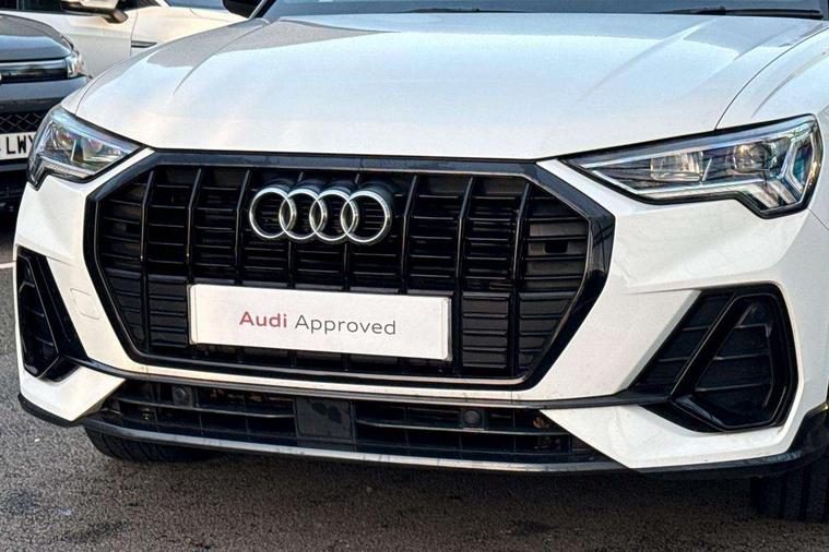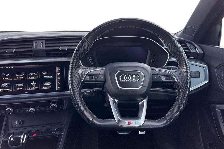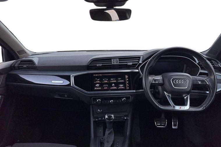 Amazon alexa Integration, Audi connect safety and service (e-call), Audi drive select, Audi lane departure warning, Audi smartphone interface includes wireless Apple carplay/Android Auto, Audi Virtual Cockpit - 10.25" display, Bluetooth interface, Camera based traffic sign recognition, Cruise control + speed limiter, MMI Navigation Plus with high resolution 10.1 inch touchscreen colour display, Power operated tailgate, Progressive steering, Rear parking sensors, Service interval indicator, Start stop system with recuperation, Voice control system with natural language interaction, 48V Mild hybrid technology, Sports suspension, 2 USB-C ports with charge and data functions, 6 passive loudspeakers, DAB digital radio module, Acoustic windscreen, Auto dimming frameless rear view mirror, Black roof rails, Electrically folding, adjustable and heated door mirrors with integrated LED side indicators and kerb view function for passenger side, Front and rear electric windows, Front fog lights, Grille vertical bars in aluminium silver/Matt, High gloss black finish B and C pillars, LED headlights with LED daytime running lights and dynamic rear indicator, LED rear lights, Privacy glass dark tinted rear and rear-side windows (from B-pillar backwards), Rain and light sensors, Rear diffuser strip in matt titanium black, S line bumpers in contrasting Manhattan grey, 12V socket in rear centre console, 3 spoke flat bottomed high multi-function leather sport steering wheel with gearshift paddles, 40:20:40 folding with manual adjustment for 60:40 forwards/backwards position and backrest angle, Adjustable rear seat bench/backrest with centre armrest and cupholder, Black cloth headlining, Dual zone electronic climate control, Front and rear black floor mats with contrast stitching in rock grey, Front and rear headrests, Front and rear roof module including reading lights, Front centre armrest, Glove compartment lighting, Height and reach adjustable steering wheel, Illuminated door sill trims with S logo, ISOFIX child seat mounting for front passenger with airbag deactivation and outer rear seat including top tether attachment point for outer rear seats, Luggage compartment light, Manual front seats with height adjustment, Perforated leather gearknob, Stainless steel luggage compartment sill finisher, Stainless steel pedals, Tool kit, Black styling pack - Q3, Non smoking pack - Q3, 3x3 point rear seatbelts, 6 airbags - Driver, front passenger, curtain and side windows, Electrically operated child locks on rear doors, Electromechanical parking brake, Electronic stabilisation control including ABS, ASR and EDL, Hill descent control, Hill hold assist, Pre sense basic, Seatbelt monitoring, Tyre pressure warning, Warning triangle and first aid kit, Anti theft alarm, Anti theft wheel bolts, Audi pre-sense front with pedestrain and cyclist recognition, Remote central locking, Leatherette door armrest, MMI touch colour display in glass look, black with surround in aluminium look, Piano black inlay, Tyre repair kit,