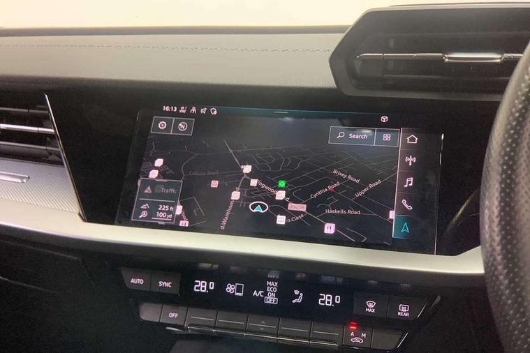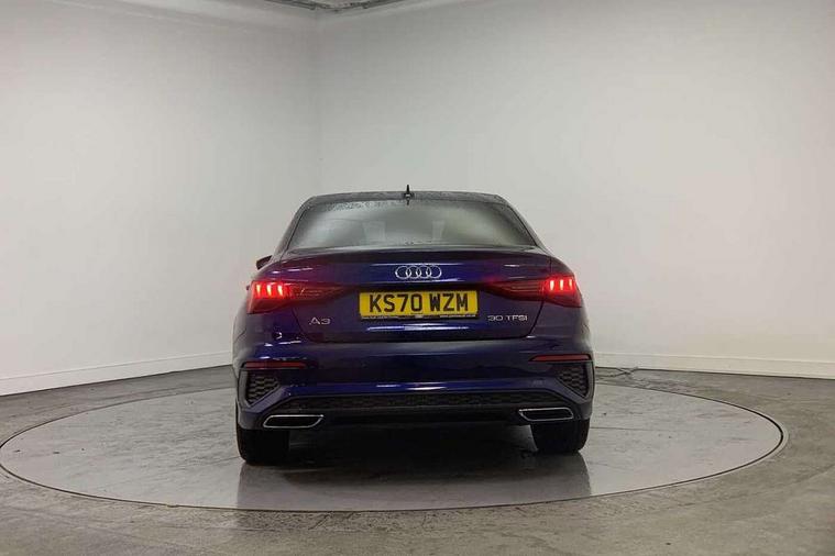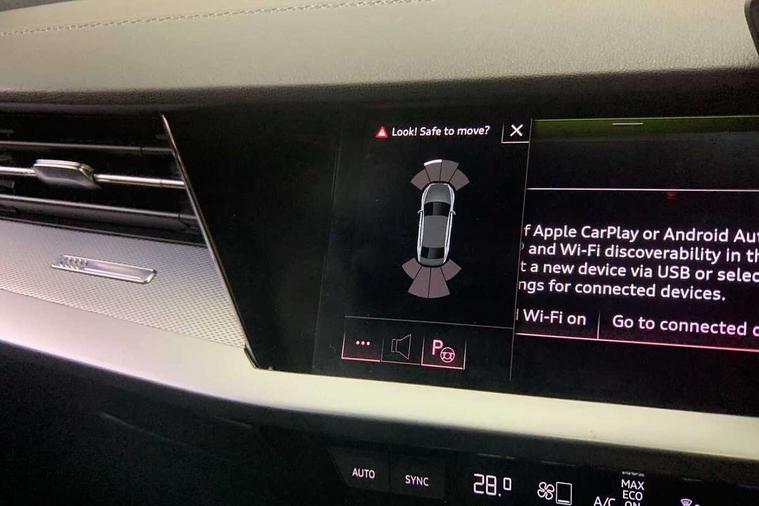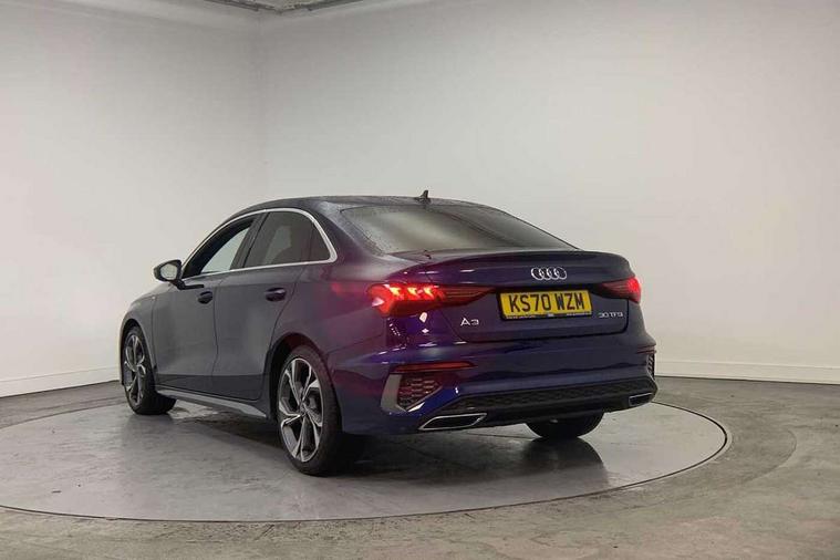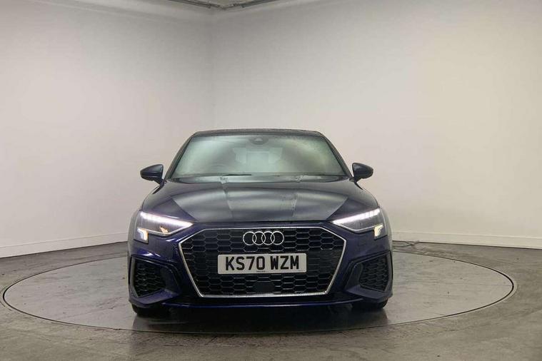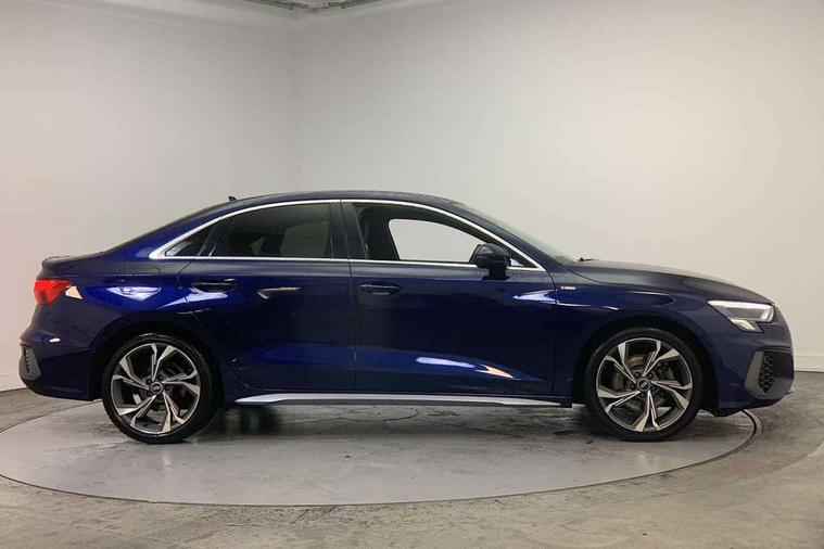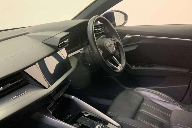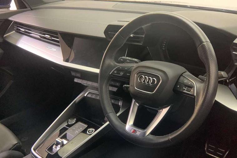 Aluminium air vent surrounds, Aluminium trim elements, Dark spectrum aluminium inlays, accent surfaces in the dashboard and centre console in platinum grey silk effect paint finish, Aluminium interior elements pack - A3 Saloon, S line styling pack - A3 Saloon, Anti theft alarm, Anti-theft wheel bolts, Electronically operated child lock, Immobiliser, Remote control central locking, 2x USB Type C ports (for charging and data transfer), 6 passive loudspeakers, CD player, DAB Digital radio, 3x3 point rear seat belts, Driver and front passenger airbag with passenger airbag deactivation, Electronic Stabilisation Control (ESC) including ABS, ASR and EDL, First aid kit with warning triangle and 2 safety vests, Front side airbags with head airbags and interaction airbag, Hill hold assist, Pre-sense front with pedestrian and cyclist detection, Seatbelt monitoring, Tyre pressure loss indicator, Acoustic glass windscreen, Aluminium window trim, Auto dimming frameless rear view mirror, Body colour exterior mirrors, Electrically adjustable/heated/folding/dimming door mirrors with kerb view includes integrated LED indications + kerb view function for passenger side, Front electric windows, Illuminated door sills with aluminium inserts at the front with S logo, LED daytime running lights, Light and rain sensors, Model and engine designation badges at rear, Privacy glass - dark tinted rear window, rear door and side windows, Rear electric windows, S line bumpers, S roof spoiler, 12V socket and storage compartment in front centre console, 40/20/40 split folding rear seat bench with cupholder, Black cloth headlining, Dual zone electronic climate control, Front and rear centre armrest in leather, Front and rear headrests, Front/rear floor mats, Height and reach adjustable steering wheel, Interior lighting - glove compartment light and right hand side, Luggage compartment floor covering, Manual boot compartment lid, Manually adjustable front seats, Seat side bolsters, Stainless steel pedals and front footrest, Twin leather upholstery with front sports seats S embossed logo, Audi connect emergency call and service, Audi drive select (Auto, Comfort, Dynamic and Individual), Audi smartphone interface, Audi Virtual Cockpit - 10.25" digital and colour instrument cluster, Automatic start/stop system with recuperation, Bluetooth interface, Collision avoidance assistant, Electromechanical power speed sensitive steering, Lane departure warning system, MMI Navigation Plus with high resolution 10.1" colour touch screen display, Service indicator, Voice control system with natural language interaction,