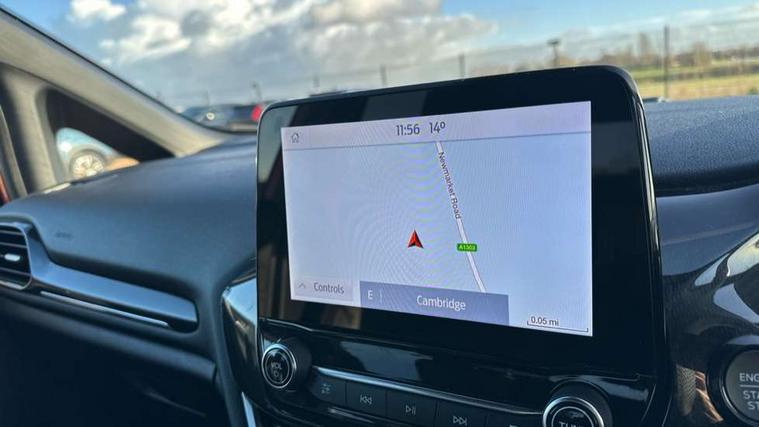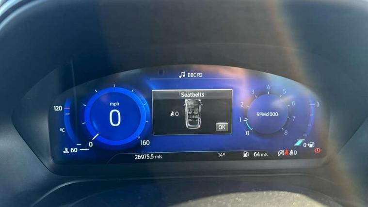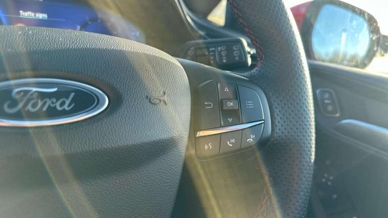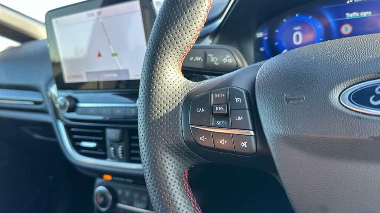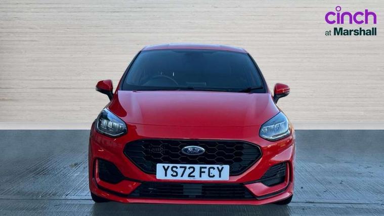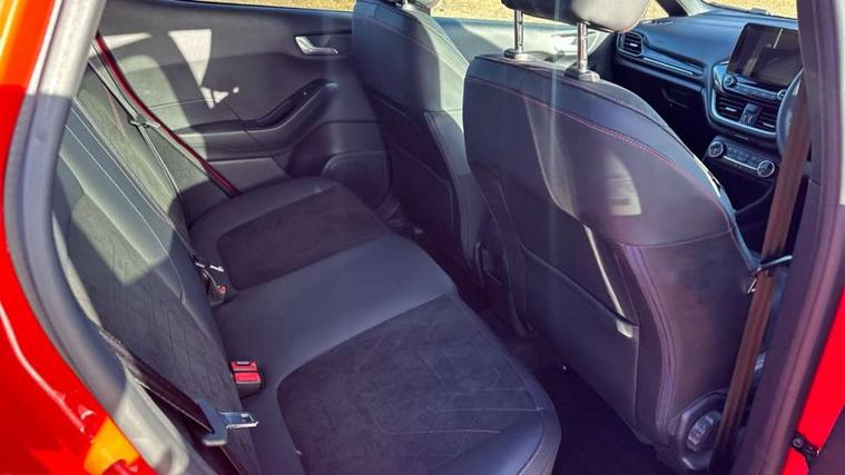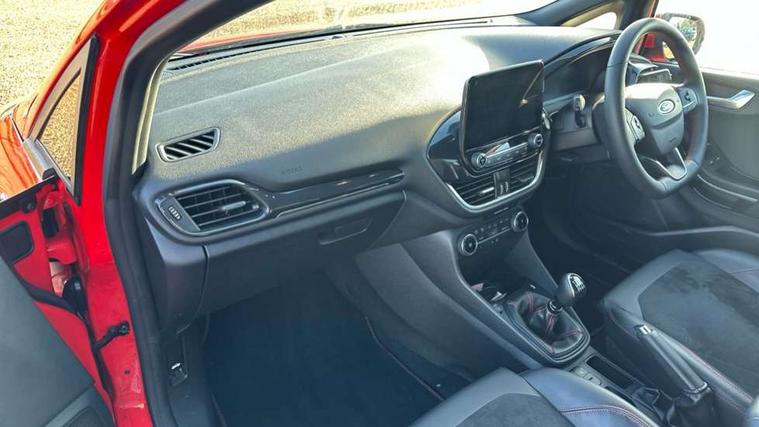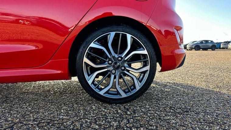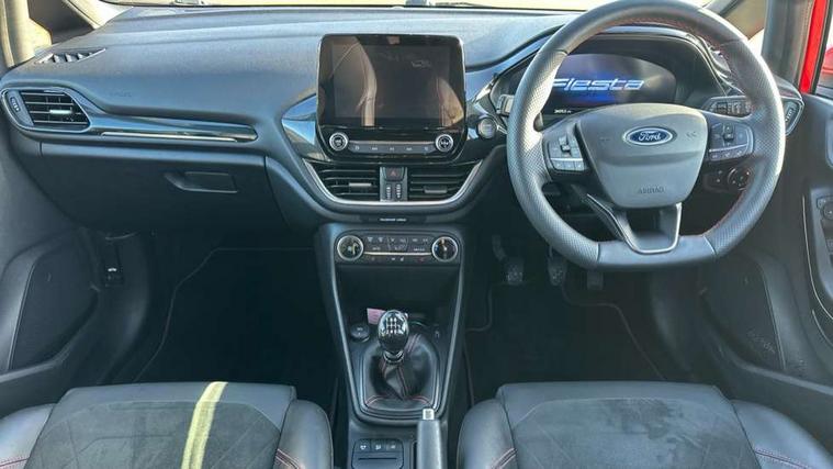 4.2" TFT instrument cluster screen, Bluetooth system, Electric power steering, Ford easy fuel, Rear parking distance sensors, Selectable drive modes (Normal, Sport, Track), Traffic sign recognition, Trip computer, Sports suspension, 2 USB ports, Auxiliary input socket, B&O Premium audio system with 8" touchscreen, 10 speakers, 360 degree sound system, Ford SYNC 3 navigation system and Ford pass connect, DAB Digital radio, Steering wheel mounted controls, Auto high beam, Body colour bumpers, Body colour door handles, Body colour large rear spoiler, Body coloured electrically operated and heated door mirrors with side indicators, Cornering front fog lights, Electric front windows/one touch facility, Electric rear windows, LED Night signature to rear lights, Power foldable door mirrors with puddle lights, Quickclear heated windscreen, Rain sensing wipers and auto dimming rear view mirror, Rear privacy glass, Rear wiper, Unique ST-Line upper grille & full bodystyling kit with ST-Line wing badges, 3 spoke flat bottomed leather steering wheel, 60/40 split folding rear seat, Adjustable head restraints, Black headlining, Boot carpet, Centre console with opening armrest, 2x cupholders, 12v and USB, Chrome inner door handles, Drivers and Passenger lumbar support, EATC - Electronic Auto Temperature control, Footwell illumination, Front floor mats in velour, Front map reading lights, Front seat and rear pockets, Height adjustable passenger seat, Illuminated glovebox, Leather gaiter, LED ambient lighting, Load area light, Manual 4-way driver seat adjust, Overhead console with sunglasses holder, Pollen filter, Rake/reach adjustable steering wheel, Sensico wrapped steering wheel, Sports front seats, NCAP Pack - Fiesta, ST-Line X Trim Pack - Fiesta, 3 point seatbelts on all rear seats, ABS+EBA, Curtain airbags, Driver and passenger airbags, Drivers knee airbag, Electronic stability control with hill start assist, Front passenger airbag deactivation, Front side airbags, Seatbelt warning, Two tone horn, Tyre pressure monitoring system, Ford keyfree system with Keyless entry and keyless start, MyKey system, Remote central locking & engine immobiliser, Thatcham Cat.1 alarm, 18" 5 spoke alloy wheels with rock metallic machined finish,