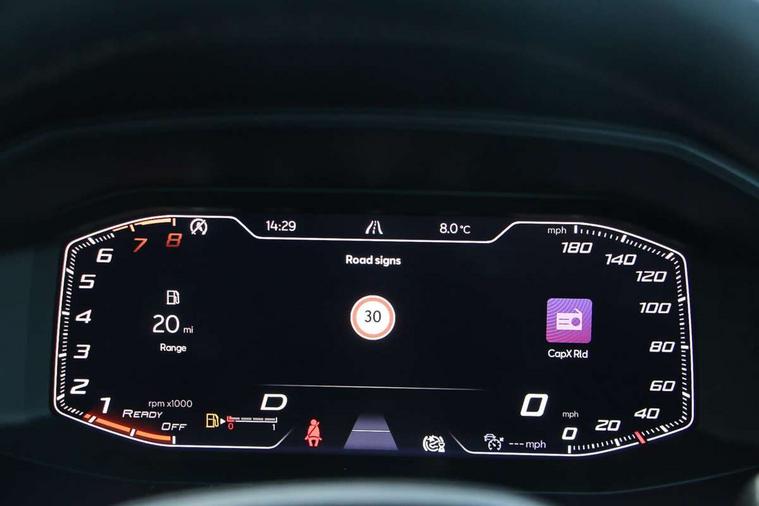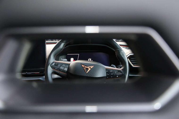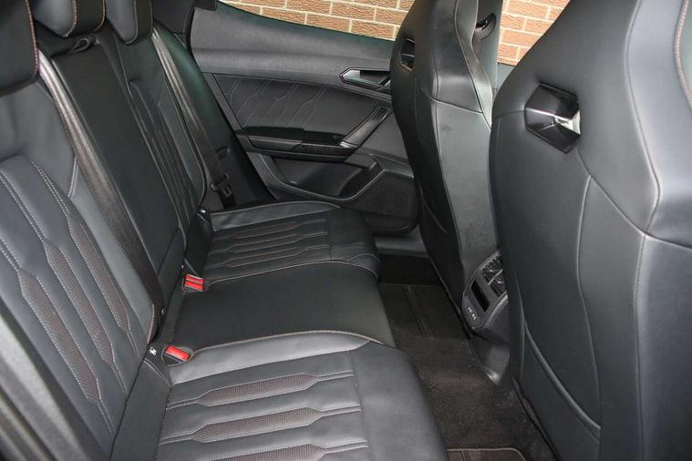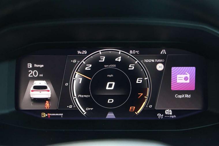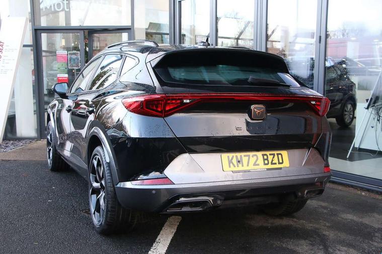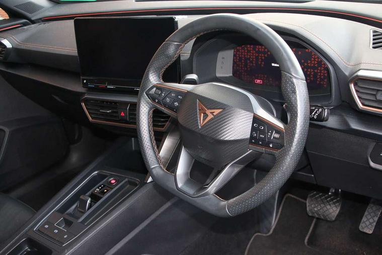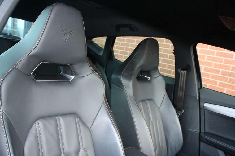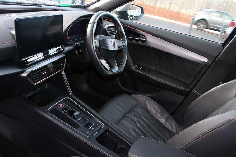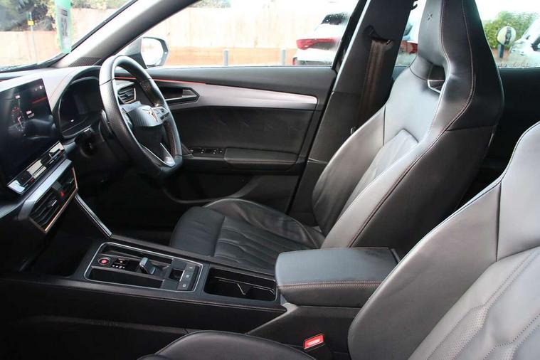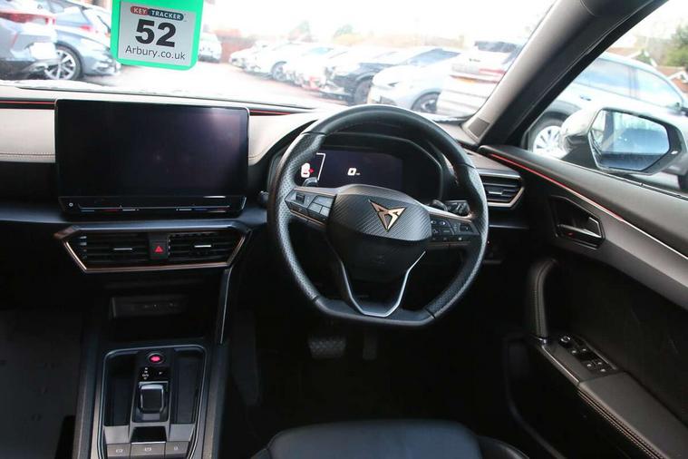 Digital cockpit and configurable dashboard, Driver alert system, Driving profile selection, Forward collision warning with automatic braking, Lane assist, Navigation system with 12'' Touchscreen Display, Park assist (inc front/rear parking sensors), PAS, Predictive adaptive cruise control with speed limiter, Rear view camera, RPM, trip computer, outside temp gauge, instrument light brightness, low fuel warning light, lights on reminder, gearshift indicator, Service interval indicator, Start/stop system with regenerative braking, Voice control system, Wireless apple carplay, Wireless phone charger, Electronic locking differential and dynamic traction support, Standard suspension, 2 front and 2 rear USB type C sockets, Auxiliary input socket, DAB radio, Auto dimming rear view mirror, Body colour door handles, Body coloured bumpers, Dark grey wing mirror, Daytime running light with automatic headlight control and coming home feature, Dynamic headlight range control, Electric front/rear windows, Electrically adjustable heated and folding door mirrors with memory function, Front fog lamps with cornering function, Gloss black roof rails and window surrounds, LED Headlights, LED Taillights with dynamic indicator, Rain sensing wipers, Rear diffuser with black simulated exhaust pipes, Rear side wing doors, Rear wash/wipe, Third brake light, Tinted rear windows, Welcome lights, 12v power supply in centre console, 12V socket, 12v socket in loadspace, 2 front and 2 rear reading lights, 230V socket, 3 seat bench in 2nd row, 60/40 split rear bench seat with armrest and mechanical seat release, Black headlining, Dust/pollen filter, Front and rear head restraints, Front centre armrest, Height/reach adjust steering wheel, Illuminated interior front door sills, Illuminated sunvisor with mirror, Isofix, Leather multi function heated steering wheel with gear shift paddles, Luggage tie-down hooks, Single front passenger seat, Three zone climate control with control panel in rear, Variable luggage/load compartment floor, Wraparound lighting, Genuine Nappa leather Pack - Cupra, 3 point seatbelts on all rear seats, ABS, Brake control system - ESC and brake booster, Child proof door locks, Driver and front passenger airbags with front passenger airbag de-activation, Electronic parking brake, Front and rear disc brakes, Front side curtain airbags, Hill hold control, Public e-call, Seat belt reminder for front and rear seats, Tyre pressure monitoring system, Anti theft alarm system, Keyless entry and start system (KESSY), Locking wheel bolts, Copper and aluminium interior detailing, 19" 'Exclusive' machined sport matte black and silver alloy wheels,