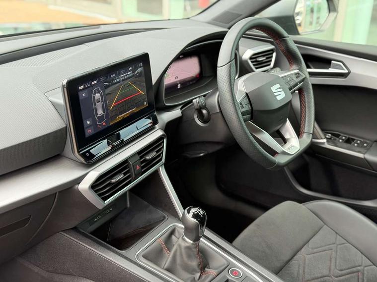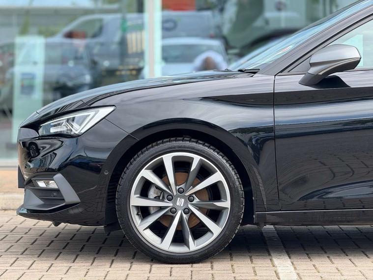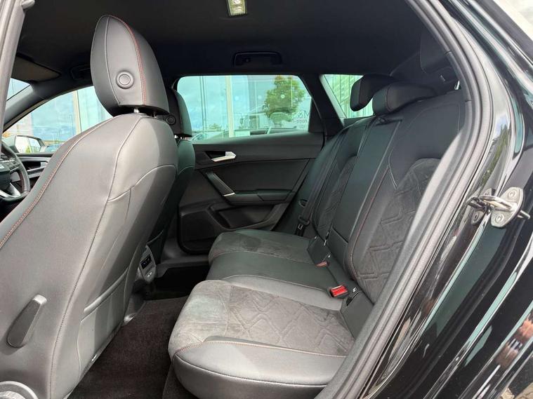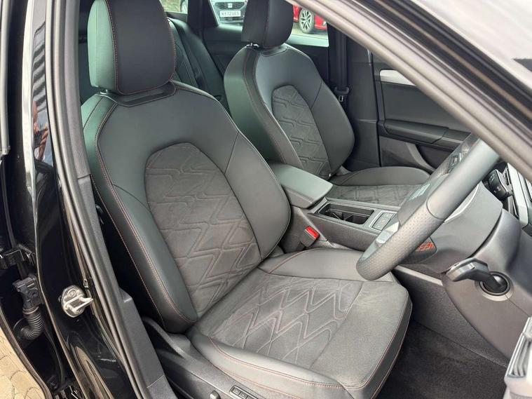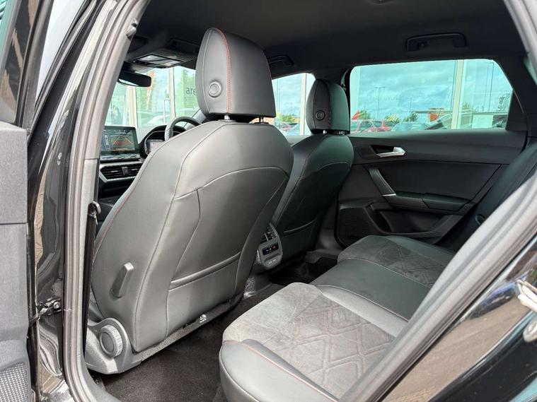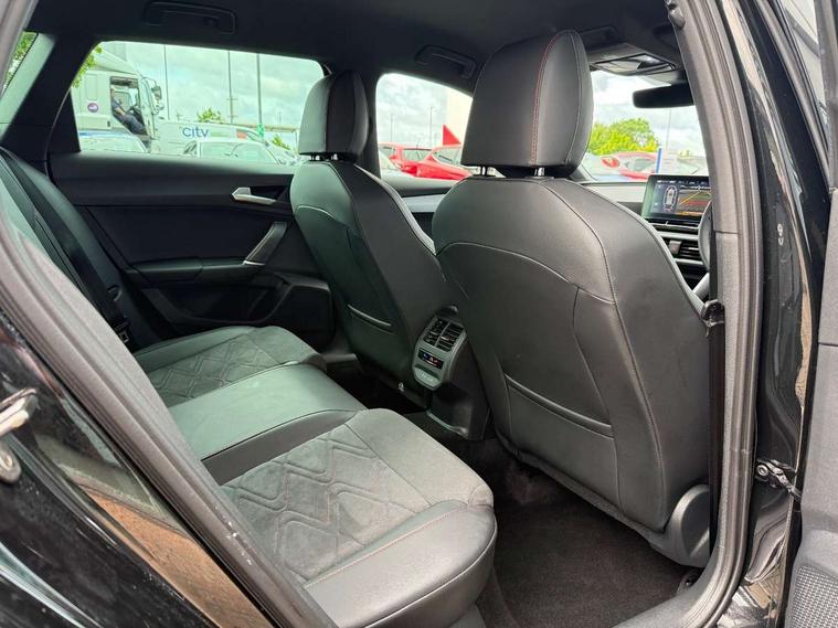 Digital cockpit, E-call, Four x USB Type C ports, Front assist with forward collision warning braking reaction to vehicles, pedestrians and cyclists, Full link smartphone integration with Mirror Link, wireless Apple CarPlay and wired Google Android Auto, Lane assist, Lockable tailgate, Park assist (inc front/rear parking sensors), Power assisted speed sensitive electro-mechanical steering, Rear view camera, RPM, trip computer, outside temp gauge, instrument light brightness, low fuel warning light, lights on reminder, gearshift indicator, SEAT drive profile with 4 modes (Eco/Normal/Sport/Individual), throttle response, Service interval indicator, Start/stop system with regenerative braking, Sports suspension, XDS electronic differential lock and dynamic traction support, 7 speakers, Auxiliary input socket, Auto dimming rear view mirror, Body colour door handles, Body coloured bumpers, Dark tinted rear windows, Door mirror LED indicator lights, Dynamic headlight range control, Electric adjustable/heated/folding door mirrors with memory, Electric front/rear windows, FR sports bumper, Illuminated front door sill, LED front fog lamps, LED Headlights with dynamic turn signals, LED tail lights and rear fog lights with rear coast to coast lighting, Matt black roof rails, Rear side wing doors, Rear wash/wipe, Separate daytime running light with automatic headlight control and coming home feature, Third brake light, Welcome light silhouette from exterior mirrors, Windshield wiper intermittent control with light/rain sensor, 12v power point in centre console, 3 seat bench in 2nd row, 60/40 split rear bench seat with armrest, Ambient lighting with glovebox, footwell and single monocolour, Black headlining, Dust/pollen filter, Electric driver lumbar support + passenger manual lumbar support, Front and rear height adjustable headrests, Front and rear reading lights X 4, Front centre armrest, Front seatback storage pockets, Heated front seats, Heated leather steering wheel with leather gearstick, Height/reach adjust steering wheel, Interior wraparound lighting (FR), ISOFIX points in outer rear seats with top tether anchorage points, Luggage tie-down hooks, Microsuede cloth upholstery, Power driver seat with memory and manual height adjustable passenger seat, Single front passenger seat, Sliding boot cover, Sunvisors with covered illuminated mirror, Three zone climate control, Tool kit, Media system plus with navigation - Leon, 3 point seatbelts on all rear seats, ABS, Brake control system - ESC and brake booster, Child proof door locks, Driver and front passenger airbags with front passenger airbag de-activation, front side and curtain airbags, Electronic parking brake, Extended safety system - seat belt tensioner, window closure and hazard lights, Hill hold control, Rear disc brakes, Seat belt reminder for front and rear seats, Tiredness recognition system, driver alert system, Tyre pressure monitoring system, Anti theft alarm system with interior monitoring in cab, backup horn and towing protection, KESSY Go (Keyless start), Locking wheel bolts, Wireless phone charging, Chrome interior detailing, 18" Performance machined alloy wheels with 92Y tyres,