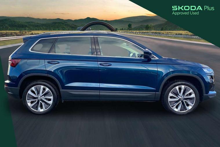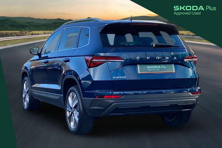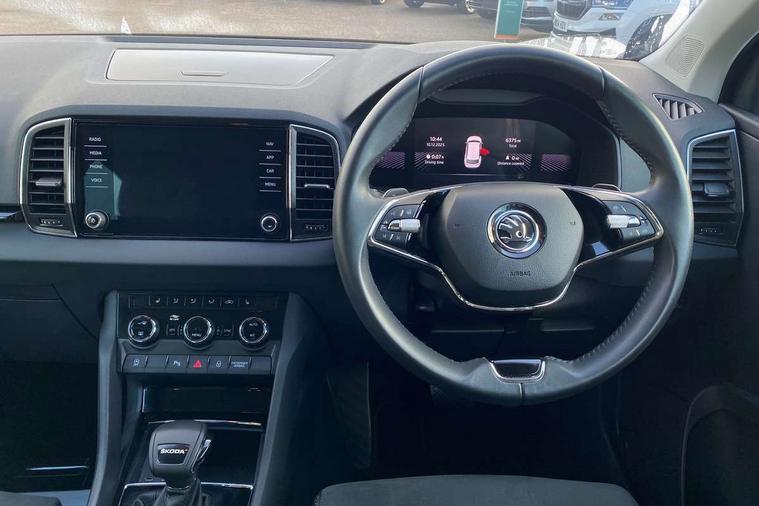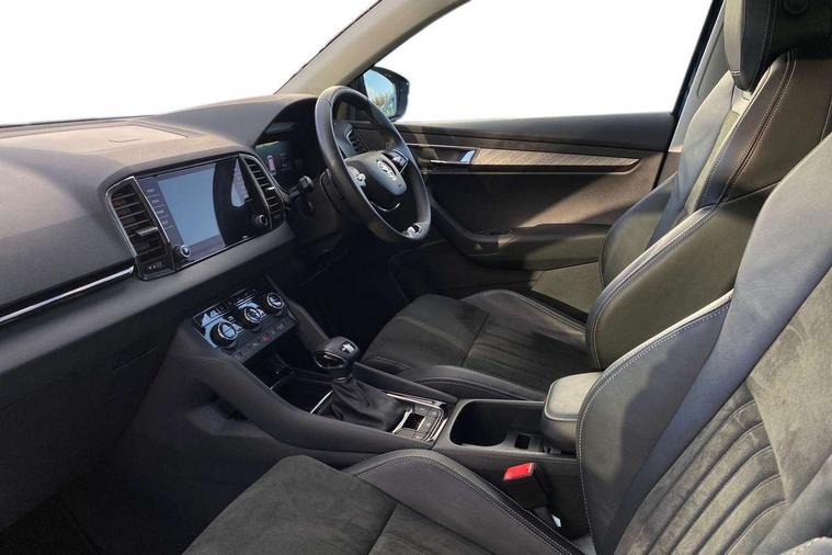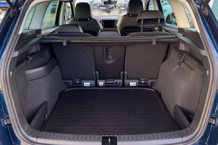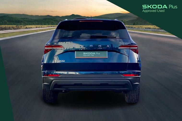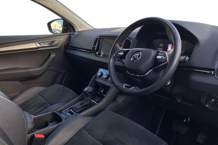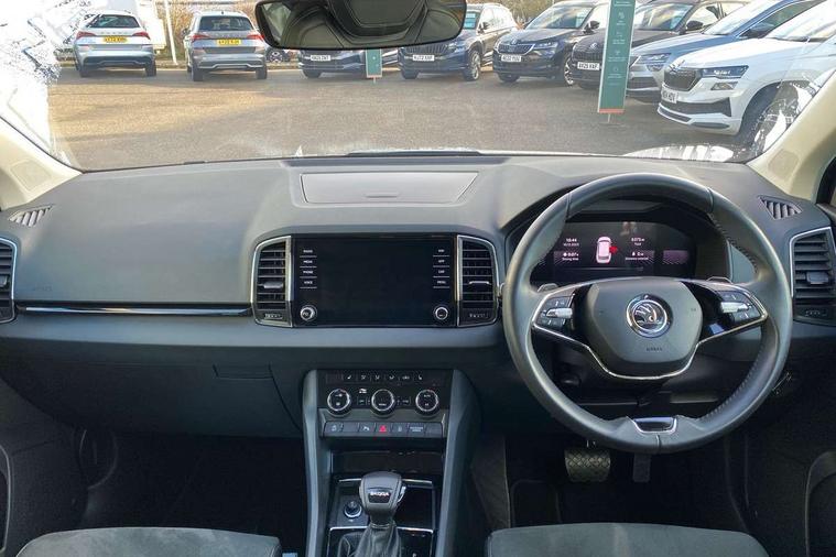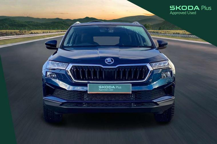 8" Digital display, Care connect, Driver fatigue sensor, Emergency services call system, Outside temperature gauge, Service interval indicator, SmartLink wireless for Apple and wired for Android, Start/stop system with regenerative braking, USB C Port x 2 in front centre console, 8 Speakers, DAB radio with Bluetooth, USB connection, Acoustic glass, Aero front windscreen wipers with intermittent function, Auto dimming rear view mirror with light and rain sensors, Black electric window control buttons, Body colour door mirrors and handles, Dynamic headlight range control with cornering light function, Electric front and rear windows with child proof lock, Heated rear windscreen, LED daytime running lights, LED rear lights with high functionality welcome effect and dynamic indicators, Light assistant (coming/leaving home/tunnel light), Plastic scuff plates, Privacy glass, Rear side wing doors, Rear spoiler, Rear window wiper with washer system and intermittent control, Safety reflectors on front doors, 1.5 litre bottle holders in driver and front passenger door panels, 12V socket in boot, 12v socket in front centre armrest with storage compartment and rear air vents, 2 spoke leather heated multifunction steering wheel with DSG paddles, 2 x Tablet holder, 3 rear height adjustable headrests, 3 seat bench in 2nd row, 4 foldable roof handles with rear coat hooks, Black floor carpet, Chrome inner door handles, Double sided boot floor, Foldable hooks in the boot, Front head restraints, Height adjustable front three point seats belts with tensioners, Height/reach adjust steering wheel, Ice scraper, Illuminated glovebox, Illuminated luggage compartment, Isofix child seat preparation for front passenger seat, Isofix child seat preparation outer rear, Manual lumbar support for front seats, Pen holder, Pollen filter, Rear boot cover, Rear reading lights, Rubbish bin door, Safety vest holder, Single front passenger seat, Storage box in upper central dashboard closed, Sunvisors with illuminated vanity mirrors, Textile floor mats, Ticket holder, VarioFlex seats with standard rear seat release, Boot pack - Karoq, Design Pack - Karoq, Parking pack - Karoq, Automatic door unlocking in case of crash, Automatic fuel cut off in case of crash, Child locks on rear doors, Driver airbag, Electronic parking brake with auto hold function, Emergency rear braking signal, ESC including ABS, MSR, ASR, EDS, HBA, DSR, RBS, MKB and traction control, Front side airbags, Hill hold control, Knee airbags, Passenger airbag with switch-off function, Pedestrian monitor, Seatbelt reminder signalisation and pretensioner for all seats, Three point seatbelts rear, Two tone horn, Tyre pressure display, Tyre pressure monitor, Alarm with interior monitoring, back up horn and tilt sensor with safe function, Electronic engine immobiliser, Keyless entry and start/stop, Remote central locking with 2 remote folding keys, Chrome framed air vents, 18" Miran alloy wheels in black, Anti-theft wheel bolts protection, Tool kit,