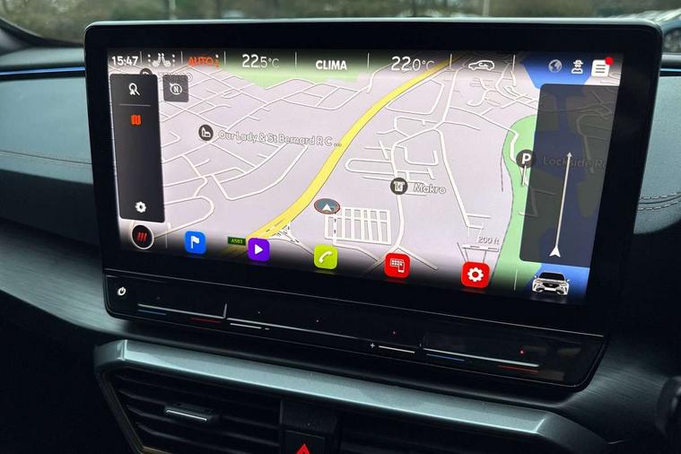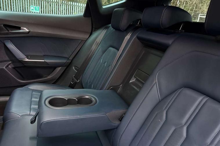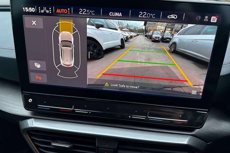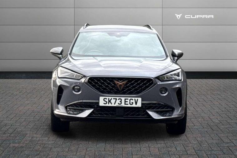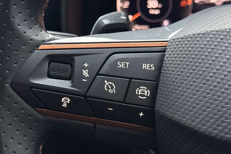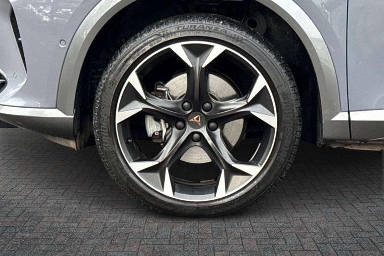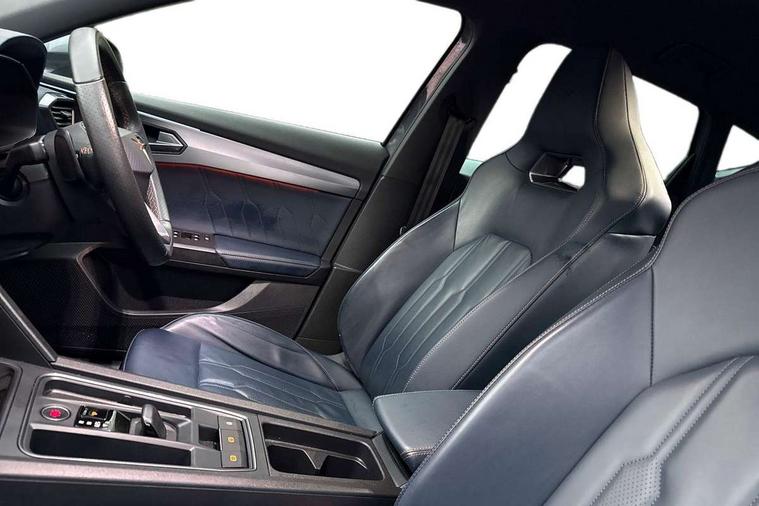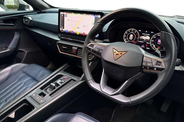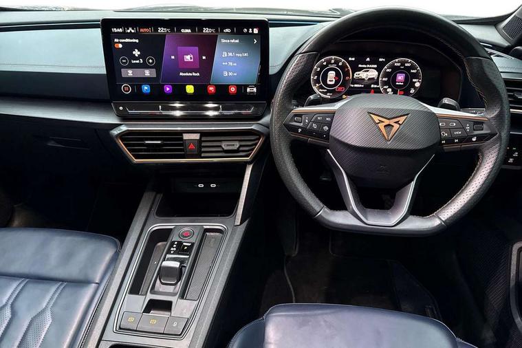 Digital cockpit and configurable dashboard, Driver alert system, Driving profile selection, Forward collision warning with automatic braking, Lane assist, Navigation system with 12'' Touchscreen Display, Park assist (inc front/rear parking sensors), PAS, Predictive adaptive cruise control with speed limiter, Rear view camera, RPM, trip computer, outside temp gauge, instrument light brightness, low fuel warning light, lights on reminder, gearshift indicator, Service interval indicator, Start/stop system with regenerative braking, Voice control system, Wired Android Auto, Wireless apple carplay, Wireless phone charger, Electronic locking differential and dynamic traction support, Standard suspension, 2 front and 2 rear USB type C sockets, Auxiliary input socket, DAB radio, Auto dimming rear view mirror, Body colour door handles, Body coloured bumpers, Dark grey wing mirror, Daytime running light with automatic headlight control and coming home feature, Dynamic headlight range control, Electric front/rear windows, Electrically adjustable heated and folding door mirrors with memory function, Front fog lamps with cornering function, Gloss black roof rails and window surrounds, LED Headlights, LED Taillights with dynamic indicator, Rain sensing wipers, Rear diffuser with black simulated exhaust pipes, Rear side wing doors, Rear wash/wipe, Third brake light, Tinted rear windows, Welcome lights, 12v power supply in centre console, 12V socket, 12v socket in loadspace, 2 front and 2 rear reading lights, 230V socket, 3 seat bench in 2nd row, 60/40 split rear bench seat with armrest and mechanical seat release, Black headlining, Dust/pollen filter, Front and rear head restraints, Front centre armrest, Height/reach adjust steering wheel, Illuminated interior front door sills, Illuminated sunvisor with mirror, Isofix, Leather multi function heated steering wheel with gear shift paddles, Luggage tie-down hooks, Single front passenger seat, Three zone climate control with control panel in rear, Variable luggage/load compartment floor, Wraparound lighting, Genuine Nappa leather Pack - Cupra, 3 point seatbelts on all rear seats, ABS, Brake control system - ESC and brake booster, Child proof door locks, Driver and front passenger airbags with front passenger airbag de-activation, Electronic parking brake, Front and rear disc brakes, Front side curtain airbags, Hill hold control, Public e-call, Seat belt reminder for front and rear seats, Tyre pressure monitoring system, Anti theft alarm system, Keyless entry and start system (KESSY), Locking wheel bolts, Copper and aluminium interior detailing, 19" 'Exclusive' machined sport matte black and silver alloy wheels,