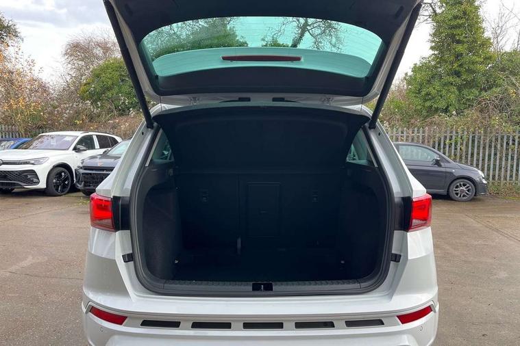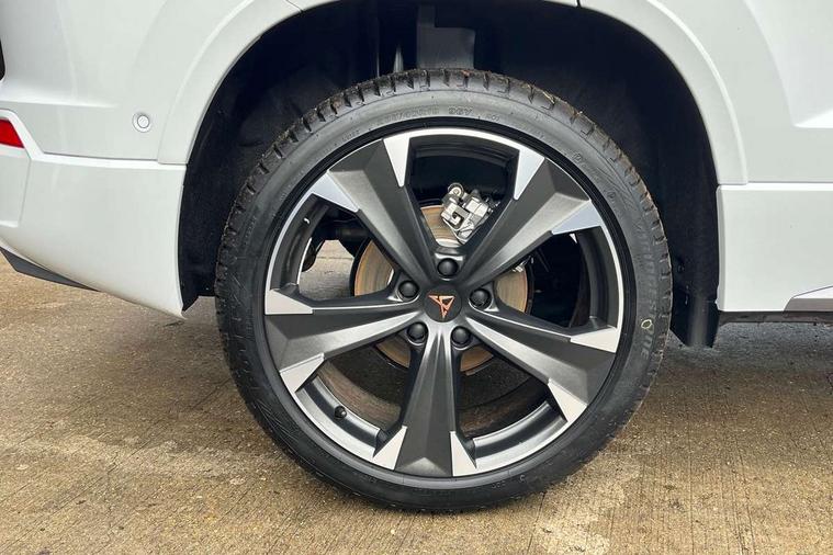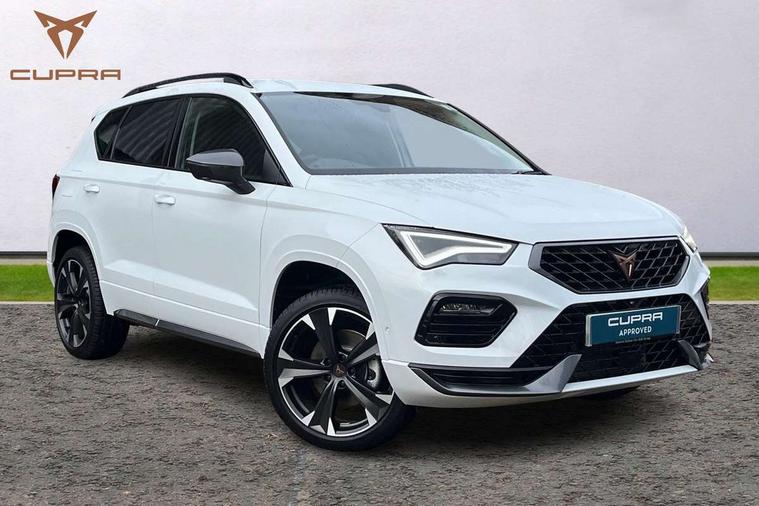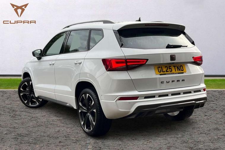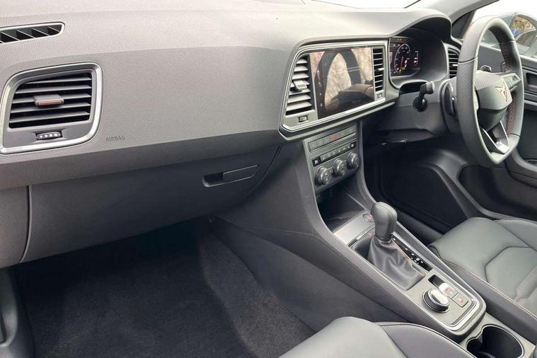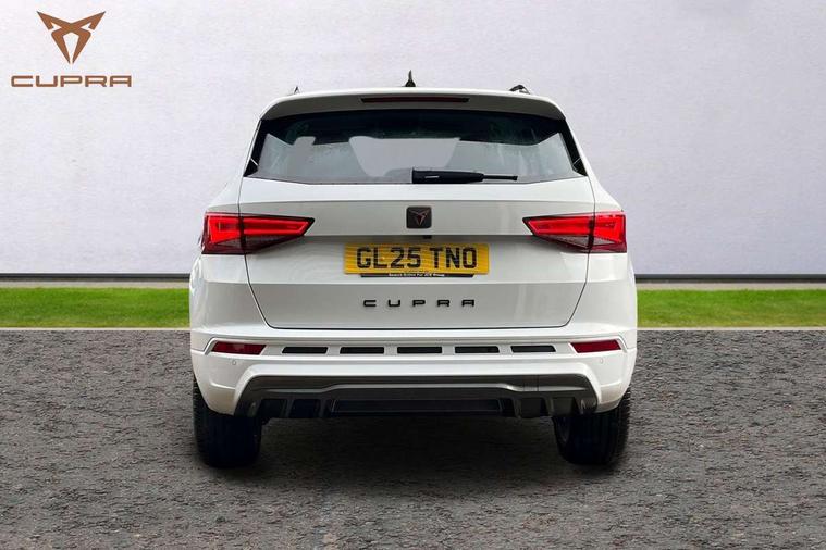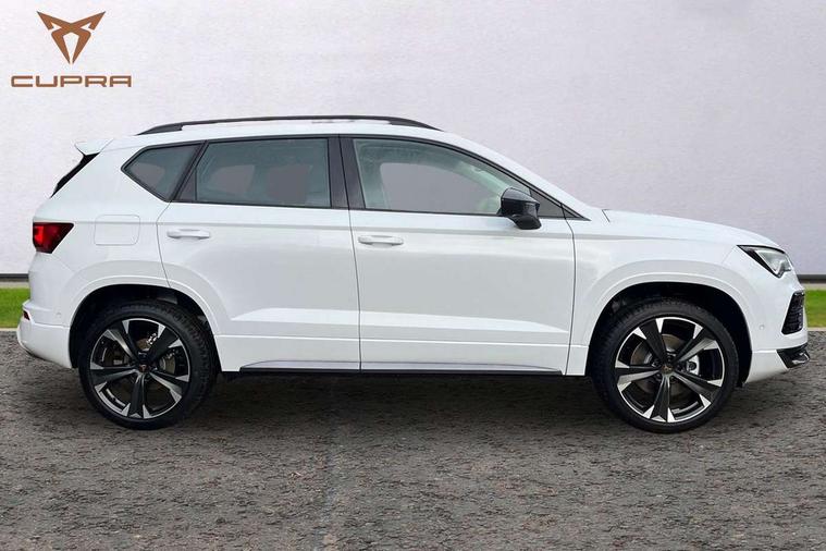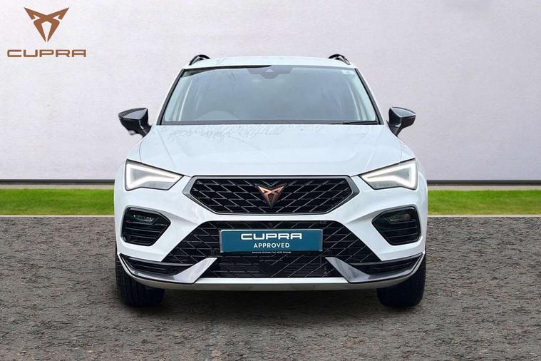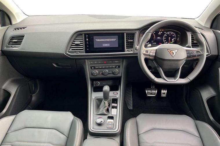 Cruise control system with speed limiter, Digital cockpit, Driving profile selection and conventional shock absorber, E-call, Electric tailgate with virtual pedal, Outside temperature gauge, Progressive power assisted steering, Rear view camera, Self parking functionality (includes front and rear parking sensors), Trip computer, wired and wireless full link smartphone integration, Wireless phone charger, Front and rear shock absorption, chassis with increased ride height, Steering wheel mounted audio/phone controls, Body colour bumpers with dark aluminium diffusor, Body coloured wheel arch surrounds, Dark tinted rear windows, Daytime running lights, Door mirrors with welcome CUPRA light silhouette, Dynamic headlight range control with self adjusting whilst driving, Electric adjustable/heated/folding door mirrors, Front and rear electric windows, Front grille frame in chrome, Full LED headlamps with lens and LED front fog lamps with cornering function, Gloss black door mirrors, Gloss black roof rails, Gloss black side mouldings, Gloss black side window trim, Illuminated aluminium front door sill, LED rear tail lights with dynamic indicators, Rear fog lights, Rear side wing doors, Rear spoiler, Rear wash/wipe, Specific CUPRA design front bumper, Standard rear exhaust tailpipes, Third brake light, 12V socket in front, 3 seat bench in 2nd row, 60/40 split folding rear seat, Aluminium pedals, Cupra steering wheel emblem, Dual zone climate control, Electric driver seat with memory function, Front and rear head restraints, Front centre armrest, Front seat back storage pockets, Grey roof lining, Heated front seats, Heated steering wheel, Height adjustable driver and passenger seat with lumbar adjustment, ISOFIX points in outer rear seats with top tether anchorage points, Leather sport bucket seats, Leather steering wheel and gear knob, Multicoloured ambient lighting with LED interior illumination, Pedal cluster, Rear armrest and easy back seat release mechanism from boot, Single front passenger seat, Sports steering wheel, Steering wheel mounted gearshift paddles, Storage compartment in roof console for sunglass, Storage compartment under driver's seat, Convenience pack - Ateca, Interior lighting pack - Ateca, Navigation system plus pack with DAB - Ateca, Safety and driving pack - Ateca, 3x3 point rear seatbelts, ABS, Traction control system (TCS), Electronic stability control (ESC) and Electronic differential lock system (XDS), Airbags - Driver and front passenger airbag with deactivation, front side, two curtain and driver's knee airbags, Black brake callipers with CUPRA logo, Electric parking brake with auto hold function, Front and rear seatbelt reminder, Front assist with autonomous emergency braking, Hill hold control, Manual rear child locks, Single tone horn, Tiredness recognition system, Tyre pressure monitoring system, Alarm, Keyless entry, Locking wheel bolts, 19" Sport machined alloy wheels 36/3 in black/silver,