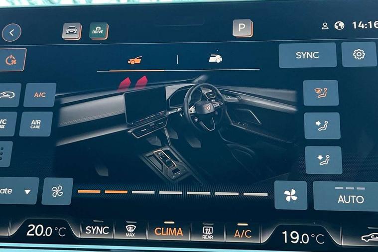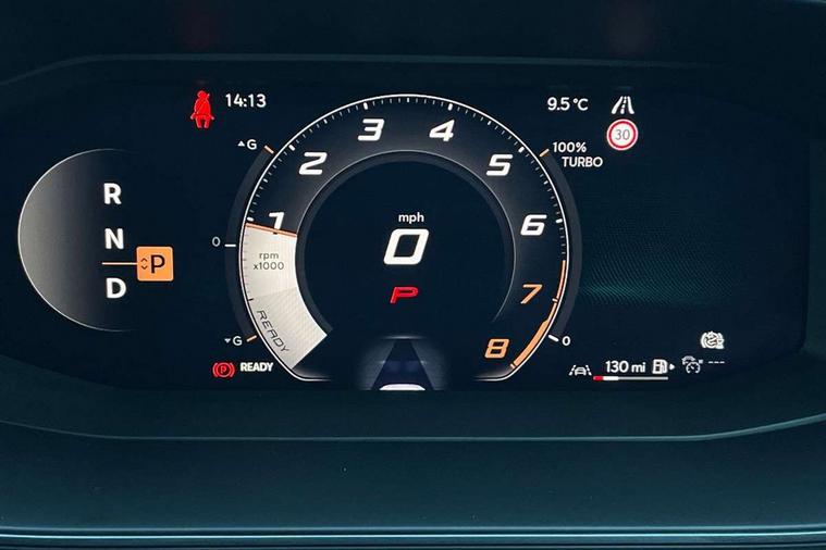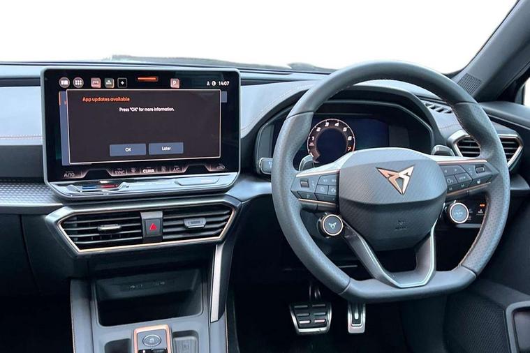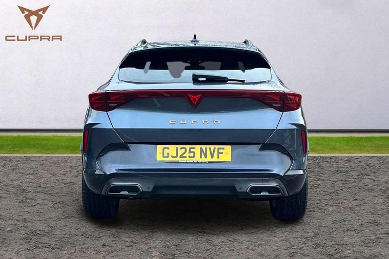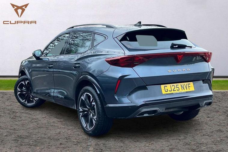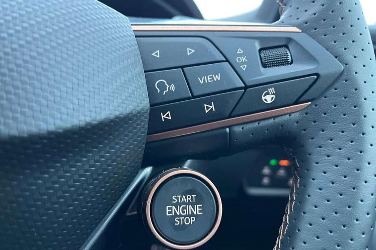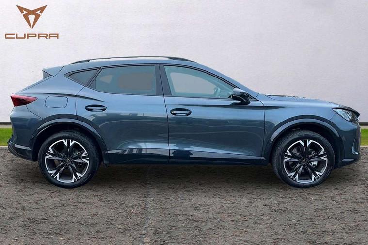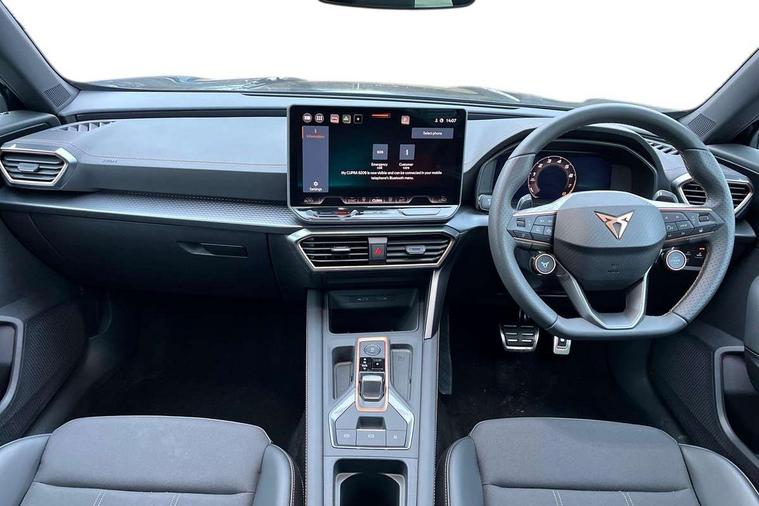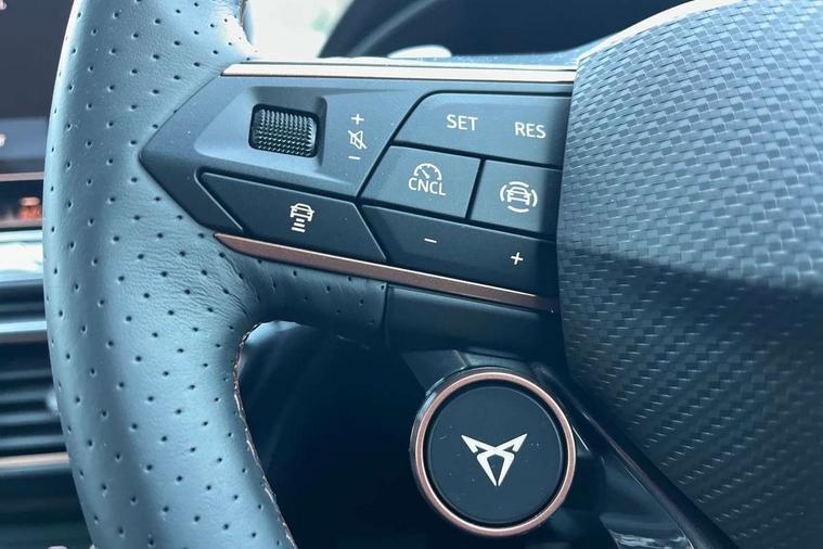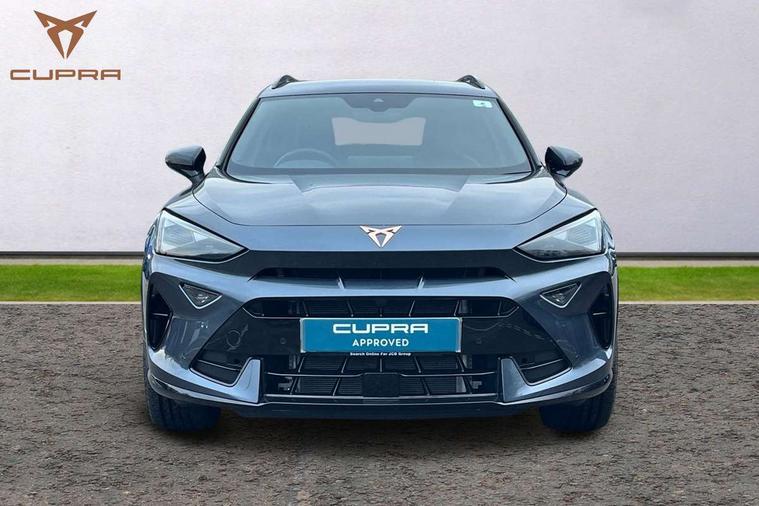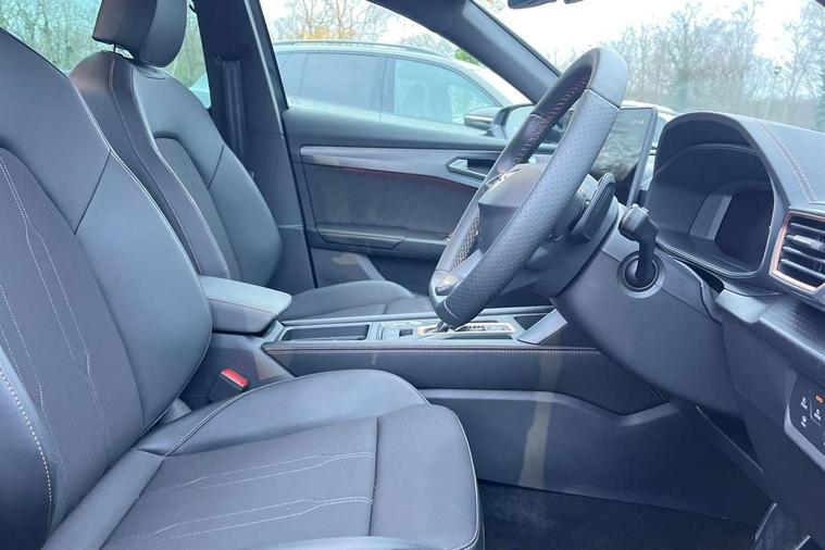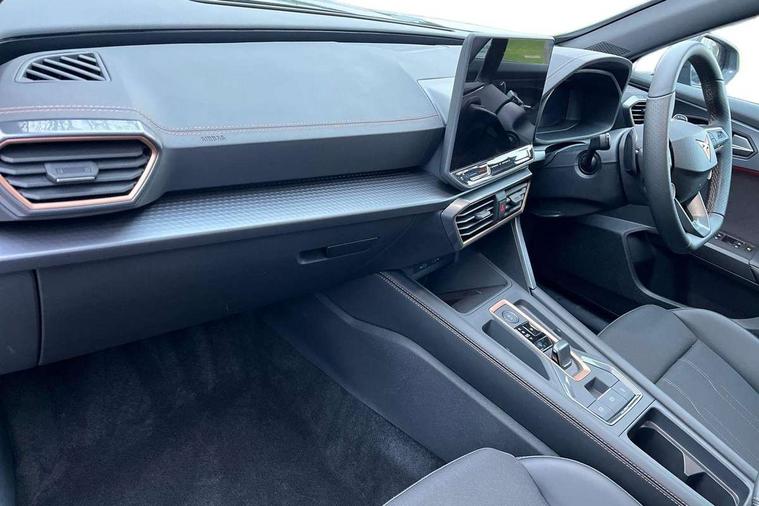 10.25" digital cockpit and configurable dashboard, Adaptive cruise control with follow-to-stop and speed limiter, Advanced driver alert system, Driving profile selection, Dynamic road sign display, Emergency steering support with turn assist, Forward collision warning with automatic braking, Front and rear parking sensors, Full link phone integration, Lane assist, Progressive steering, RPM, trip computer, outside temp gauge, instrument light brightness, low fuel warning light, lights on reminder, gearshift indicator, Service interval indicator, Start/stop system with regenerative braking, Voice control system, Wired Android Auto, Wireless apple carplay, Wireless phone charger, CUPRA sport suspension, Electronic locking differential and dynamic traction support, 2 front and 2 rear USB type C sockets, 7 speakers, Media system with navigation, 12.9" touchscreen display, voice control, DAB, steering wheel mounted controls, Auto dimming rear view mirror, Body colour door handles, Body coloured bumpers, Dark grey wing mirror, Daytime running light with automatic headlight control and coming home feature, Door panel ambient lighting, Dynamic headlight range control, Electric front/rear windows, Electrically adjustable, heated and folding door mirrors, Gloss black roof rails and window surrounds, High beam assist, LED 3rd brake light, LED front fog lamps with cornering function, LED Headlights, LED Taillights with dynamic indicator, Rain sensing wipers, Rear diffuser with black simulated exhaust pipes, Rear fog lights, Rear side wing doors, Rear wash/wipe, Tinted rear windows, Welcome lights (within exterior mirror housing), 12V socket, 2 front and 2 rear reading lights, 3 seat bench in 2nd row, 60/40 split rear bench seat with armrest and mechanical seat release, Black headlining, Black interior roof lining, Cupra sports pedals, Dust/pollen filter, Front and rear head restraints, Front centre armrest, Heated supersports multifunction leather steering wheel with satellite buttons and gear shift paddles, Height/reach adjust steering wheel, Illuminated aluminium doorsteps, Illuminated interior front door sills, Illuminated sunvisor with mirror, Interior ambient lighting, Isofix, Manually adjustable height and lumbar support for front seats, PVC/Cloth upholstery with copper stitching + Sport seats, Satellite steering wheel, Single front passenger seat, Storage pockets on rear of front seats, Three zone climate control with control panel in rear, Variable luggage/load compartment floor, 3 point seatbelts on all rear seats, ABS, Brake control system - ESC and brake booster, Child proof door locks, Driver and front passenger airbags with front passenger airbag de-activation, Electronic parking brake, Front and rear disc brakes, Front side curtain airbags, Hill hold control, Public e-call, Seat belt reminder for front and rear seats, Tyre pressure monitoring system, Anti theft alarm system, Central locking system Keyless Go, Locking wheel bolts, Copper and aluminium interior detailing, 18" Sonora machined silver alloy wheels,