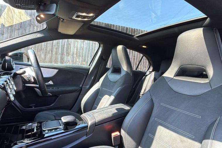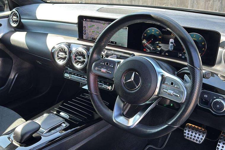 Ultrasonic sensors positioned in the front and rear bumpers, 10.25" Digital instrument cluster display screen, 10.25" media display, 180 degree rear view camera with parking guidelines, Active parking assist with visual and audible warning of detected obstacles, Attention assist, Brake pad wear indicator warning light, Car wash mode, Cruise control + speed limiter, Direct steering, Dual bluetooth interfaces, DYNAMIC SELECT with a choice of driving modes (ECO, Comfort, Sport and Individual), ECO start/stop function, Fluid level warning indicator for fuel, oil, coolant and washer fluid, Hard-disk navigation, Hey Mercedes Voice activation, Lamp failure indicator, Mercedes me connect including emergency call system, accident recovery, breakdown management and maintenance, Mercedes me remote services, Outside temperature gauge, Owners manual in English, Pre-installation for car sharing, Preinstallation for Mercedes Benz link, Service indicator (ASSYST), Smartphone integration with Apple CarPlay and Android auto, Speed limit assist, Speed sensitive power steering, Trip computer, Wireless charging, Lowered comfort suspension, Rear axle torsion beam, 2 USB ports (type C) in rear stowage compartment and one in front of center console, 6 speakers, MBUX multimedia system with DAB digital radio and touchpad including satellite navigation, Mercedes-Benz sound system - 100W, 4 Electric Front and Rear windows, Adaptive brake lights, Black chrome plated tailpipe trim, Body colour bumpers, Body colour door handles, Body colour side skirt, Diamond radiator grille with pins in black and black louvre, Edition badging on the front wings, Electric adjustable and heated door mirrors with integrated LED side indicators, Headlamp assist automatic headlamp activation, Heated glass rear windscreen + timer control, LED high performance headlamps with integrated LED daytime running lights, LED tail lamp, LED third brake light, Panoramic sliding sunroof, Privacy glass, Radio aerial, Rain sensing windscreen wipers with two sensitivity settings, Rear fog lights, Rear wiper, 3 Spoke flat bottom leather multi function steering wheel with perforated leather in grip area, 40:20:40 split folding rear seats, Artico man-made leather/ Dinamica microfiber upholstery, Auto Mercedes-Benz child seat recognition sensor, Black air vents with surround in silver chrome, Black roof lining, Brushed stainless steel sports pedals with rubber studs, Floor mats with black top stitching and embroidered edition logo and piping in light grey, Floor mats with stitched edging and AMG lettering, Front centre armrest with storage compartment, Front door sills with Mercedes Benz lettering, Front seat backs luggage nets, Front seat cushion length adjustment, Galvanished gear shift paddles on steering wheel, Heated front seats, Height/reach adjustable steering column, Interior lighting - 64 colour Ambient lighting, Interior mirror with reading lamps in black and frameless, ISOFIX and top tether child seat fixing points in two outer rear seats, Rear head restraints, Seat occupancy sensor for front passenger seat, Sports seats with integrated headrests, Stowage compartment in centre console with retractable cover, Sunvisors with illuminated vanity mirrors, Touchpad on center console, Twin front cupholders, Two zone thermotronic luxury automatic climate control, Light and sight pack - A Class, Mirror package - A Class, Night pack - A Class Exclusive Edition, Seat comfort pack - A Class, 3 rear 3 point seatbelts, ABS with Brake Assist, Active bonnet, Active brake assist includes forward collision warning system with autonomous braking, Adaptive brake assist with hold function and hill start assist, Black seatbelts, Bonnet with power domes, Childproof locks manually operated for rear doors and electrically operated for rear power windows, Crash responsive emergency lighting, Driver and passenger head and side airbags, Drivers knee airbag, Dual stage driver/passenger airbags, Electronic parking brake, ESP curve dynamic assist, ESP with ASR, Front and rear seatbelt reminder, Tyre pressure monitoring system, Warning triangle and first aid kit, Window airbags, Alarm system/interior protection/immobiliser, Keyless Go, Remote central locking and crash sensor with emergency opening function, Urban guard vehicle protection system with immobiliser and interior protection, Light longitudinal grain aluminium trim painted, 19" AMG multi spoke light alloy wheels painted in titanium grey with high sheen finish, Summer tyres, Tirefit sealant kit,