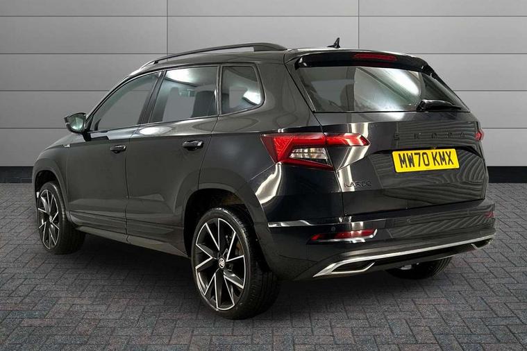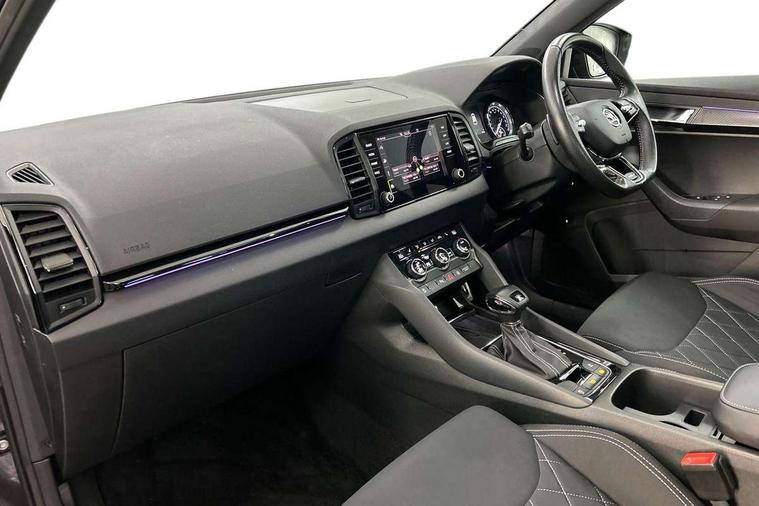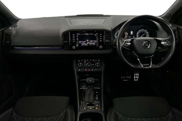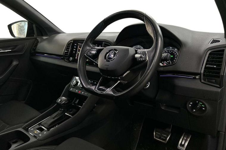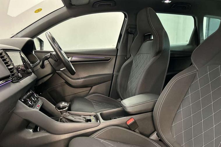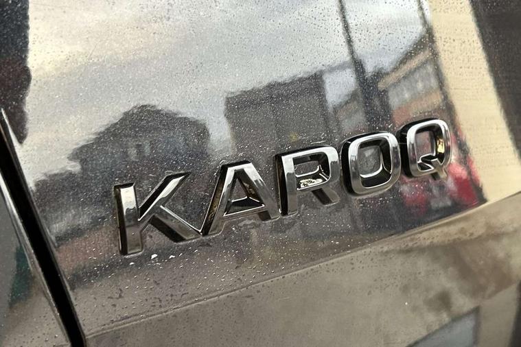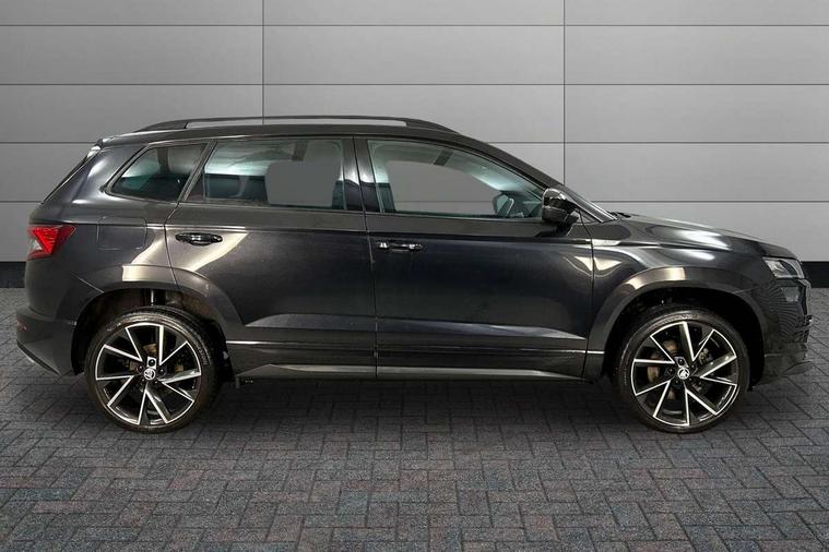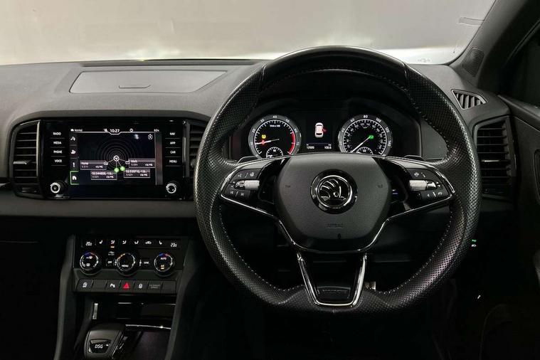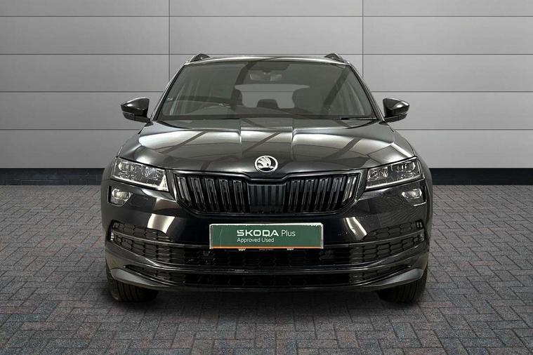 Care connect, Drive mode selector, Driver alert system, Driver fatigue sensor, Driver profile selection, Multifunction colour trip computer, Outside temperature gauge, Rear view camera, Service interval indicator, SmartLink wireless for Apple and wired for Android, Start/stop system with regenerative braking, USB C Port x 2 in front centre console, DAB radio with Bluetooth, SD card slot, USB connection, Wireless charging without wireless aerial connection, Acoustic glass, Aero front windscreen wipers with intermittent function, Automatic headlight control system, Black electric window control buttons, Black roof rails and door mirrors with radiator grille, Body colour door handles, Electric front and rear windows with child proof lock, Front door steps with SportLine logo, Full LED headlights + adaptive front light system + LED daytime running lights and front cornering fog lights, Headlight washers, Heated rear windscreen, LED rear lights with high functionality, Light assistant (coming/leaving home/tunnel light), Panoramic sliding sunroof, Privacy glass, Protective door side sills in body colour, Rear diffuser, Safety reflectors on front doors, Skoda lettering on tailgate in black, Sportline badge on front fender, Sportline decorative inserts with badging, Sports front and rear bumpers, Third brake light, 1.5 litre bottle holders in driver and front passenger door panels, 12V socket in boot, 12v socket in front centre armrest with storage compartment and rear air vents, 2 Folding hooks and nets in boot, 2 Front readings lights for driver and passenger, 3 rear height adjustable headrests, 4 foldable roof handles with rear coat hooks, 4 lashing points on luggage floor, Aluminium pedals, Backrest release, Black roof headlining, Cargo elements in boot, Chrome inner door handles, Door sill scuff plates, Driver and passenger seats height adjust, Front head restraints, Front seat and rear pockets, Height adjustable front three point seats belts with tensioners, Height/reach adjust steering wheel, Ice scraper, Illuminated and cooled glovebox, Illuminated luggage compartment, Isofix child seat preparation outer rear, Manual lumbar support for front seats, Net programme in boot, Pen holder, Pollen filter, Rear boot cover, Rear reading lights, Rear seats fixed folding and divided 60:40, Retractable parcel shelf attachable to tailgate, Safety vest holder, Storage box in upper central dashboard closed, Storage compartment below the passenger seat, Sunvisors with illuminated vanity mirrors, Textile floor mats, Umbrella under passenger seat, LED Interior lighting pack with Skoda welcome logo - Karoq, Airbags - Front side, head, knee and curtain, Automatic door unlocking in case of crash, Automatic fuel cut off in case of crash, Driver airbag, Electronic parking brake with auto hold function, Emergency rear braking signal, ESC including ABS, MSR, ASR, EDS, HBA, DSR, RBS, MKB and traction control, Front assist radar scanning of the space in front of the car with automatic braking, Hill hold control, Passenger airbag with switch-off function, Pedestrian monitor, Seatbelt reminder signalisation and pretensioner for all seats, Three point seatbelts rear, Two tone horn, Tyre pressure display, Tyre pressure monitor, Alarm with interior monitoring, back up horn and tilt sensor with safe function, Electronic engine immobiliser, Keyless entry and keyless start with safe system, Remote central locking with 2 remote folding keys, Black air vent surround, 19" Vega anthracite alloy wheels, Anti-theft wheel bolts protection, Storage on wheel cover,