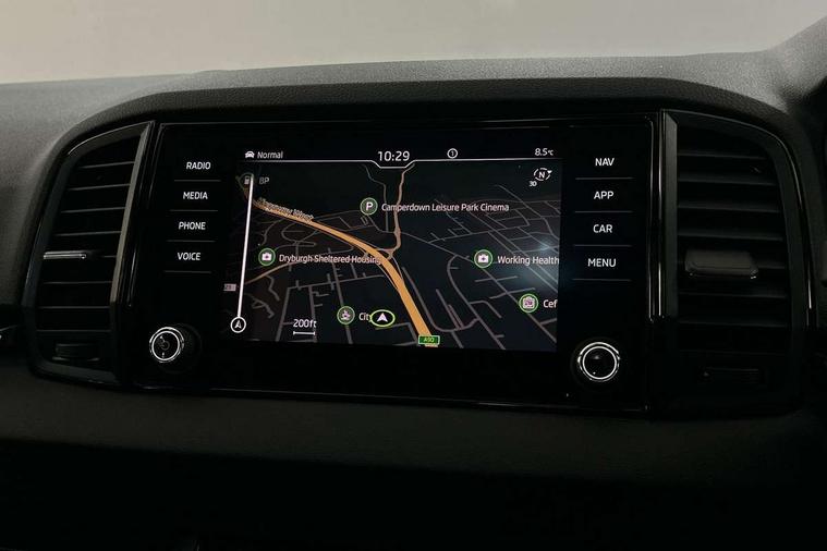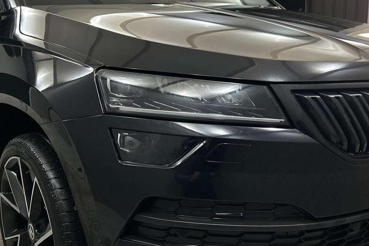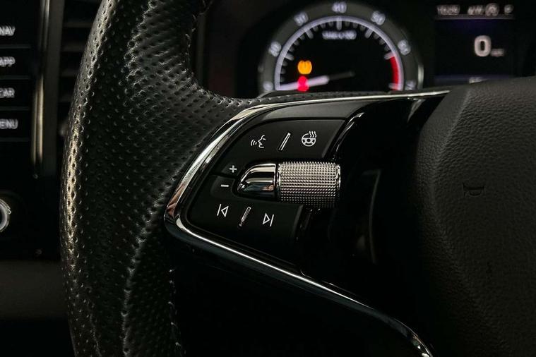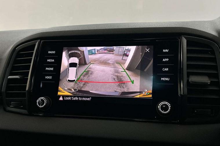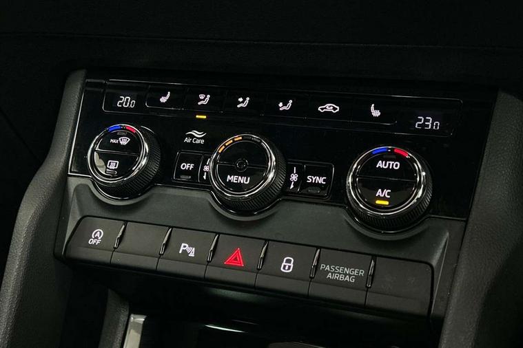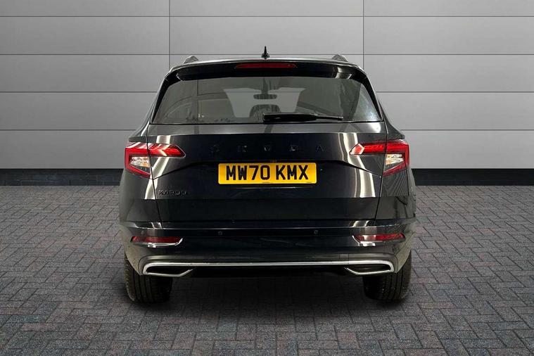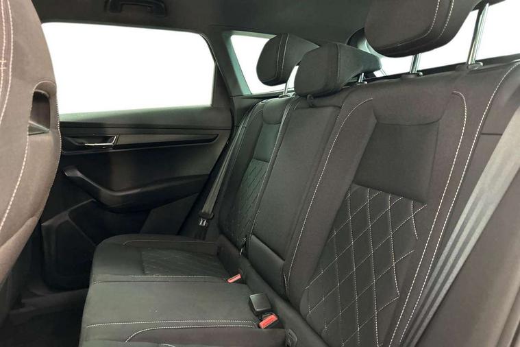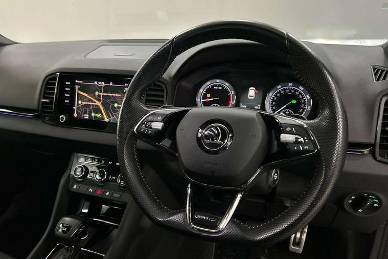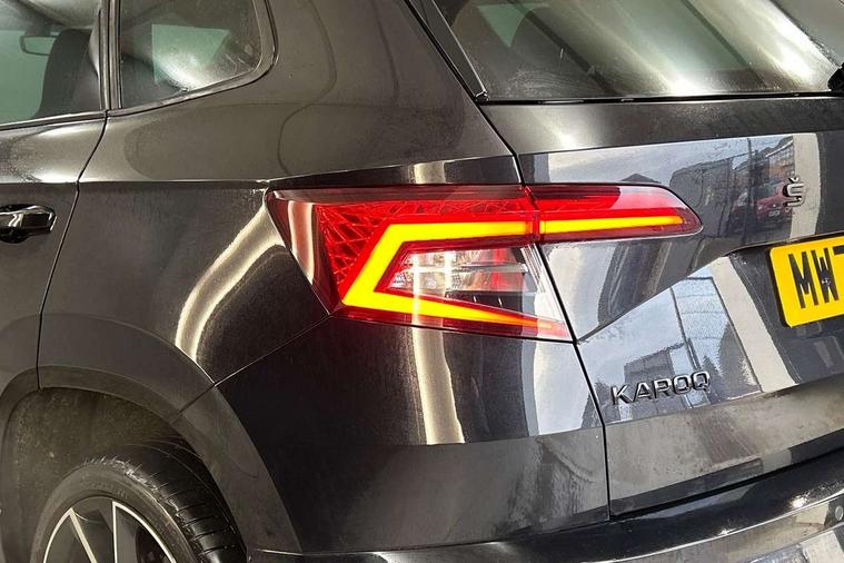 Care connect, Drive mode selector, Driver alert system, Driver fatigue sensor, Driver profile selection, Multifunction colour trip computer, Outside temperature gauge, Rear view camera, Service interval indicator, SmartLink wireless for Apple and wired for Android, Start/stop system with regenerative braking, USB C Port x 2 in front centre console, DAB radio with Bluetooth, SD card slot, USB connection, Wireless charging without wireless aerial connection, Acoustic glass, Aero front windscreen wipers with intermittent function, Automatic headlight control system, Black electric window control buttons, Black roof rails and door mirrors with radiator grille, Body colour door handles, Electric front and rear windows with child proof lock, Front door steps with SportLine logo, Full LED headlights + adaptive front light system + LED daytime running lights and front cornering fog lights, Headlight washers, Heated rear windscreen, LED rear lights with high functionality, Light assistant (coming/leaving home/tunnel light), Panoramic sliding sunroof, Privacy glass, Protective door side sills in body colour, Rear diffuser, Safety reflectors on front doors, Skoda lettering on tailgate in black, Sportline badge on front fender, Sportline decorative inserts with badging, Sports front and rear bumpers, Third brake light, 1.5 litre bottle holders in driver and front passenger door panels, 12V socket in boot, 12v socket in front centre armrest with storage compartment and rear air vents, 2 Folding hooks and nets in boot, 2 Front readings lights for driver and passenger, 3 rear height adjustable headrests, 4 foldable roof handles with rear coat hooks, 4 lashing points on luggage floor, Aluminium pedals, Backrest release, Black roof headlining, Cargo elements in boot, Chrome inner door handles, Door sill scuff plates, Driver and passenger seats height adjust, Front head restraints, Front seat and rear pockets, Height adjustable front three point seats belts with tensioners, Height/reach adjust steering wheel, Ice scraper, Illuminated and cooled glovebox, Illuminated luggage compartment, Isofix child seat preparation outer rear, Manual lumbar support for front seats, Net programme in boot, Pen holder, Pollen filter, Rear boot cover, Rear reading lights, Rear seats fixed folding and divided 60:40, Retractable parcel shelf attachable to tailgate, Safety vest holder, Storage box in upper central dashboard closed, Storage compartment below the passenger seat, Sunvisors with illuminated vanity mirrors, Textile floor mats, Umbrella under passenger seat, LED Interior lighting pack with Skoda welcome logo - Karoq, Airbags - Front side, head, knee and curtain, Automatic door unlocking in case of crash, Automatic fuel cut off in case of crash, Driver airbag, Electronic parking brake with auto hold function, Emergency rear braking signal, ESC including ABS, MSR, ASR, EDS, HBA, DSR, RBS, MKB and traction control, Front assist radar scanning of the space in front of the car with automatic braking, Hill hold control, Passenger airbag with switch-off function, Pedestrian monitor, Seatbelt reminder signalisation and pretensioner for all seats, Three point seatbelts rear, Two tone horn, Tyre pressure display, Tyre pressure monitor, Alarm with interior monitoring, back up horn and tilt sensor with safe function, Electronic engine immobiliser, Keyless entry and keyless start with safe system, Remote central locking with 2 remote folding keys, Black air vent surround, 19" Vega anthracite alloy wheels, Anti-theft wheel bolts protection, Storage on wheel cover,