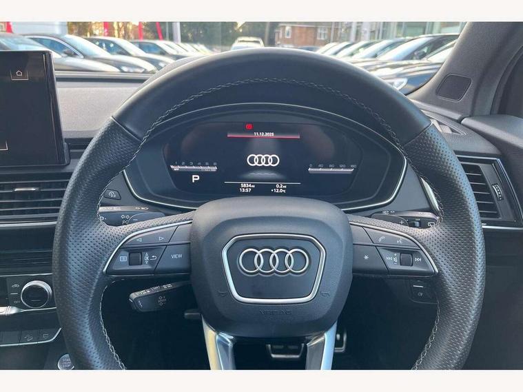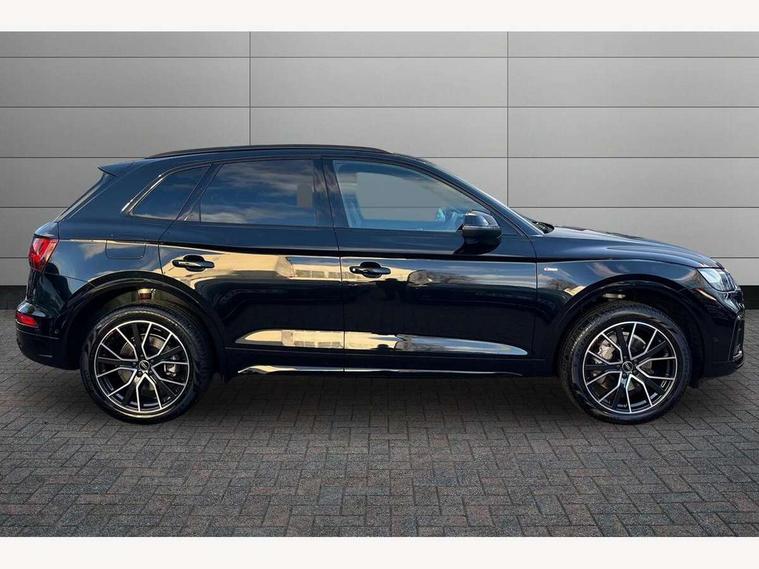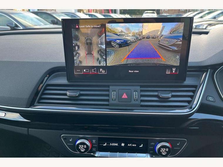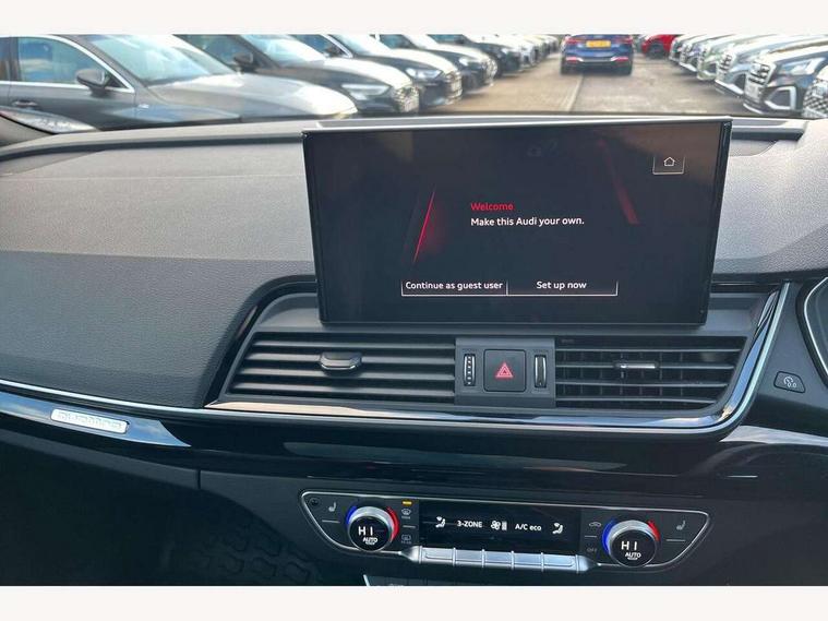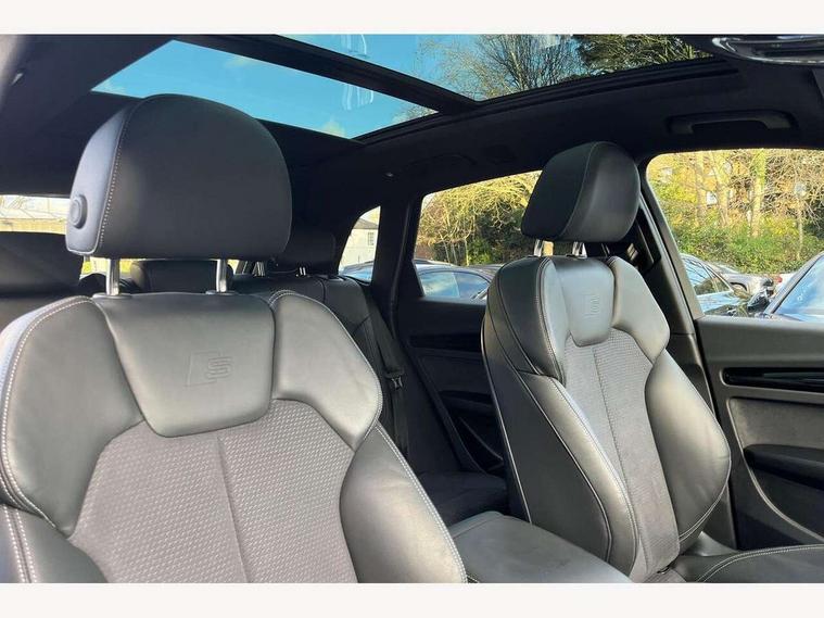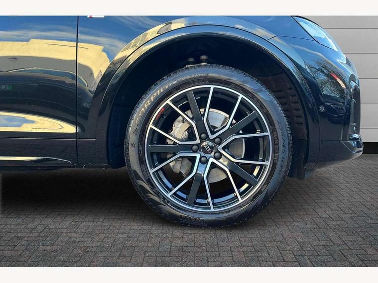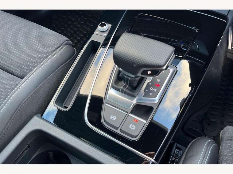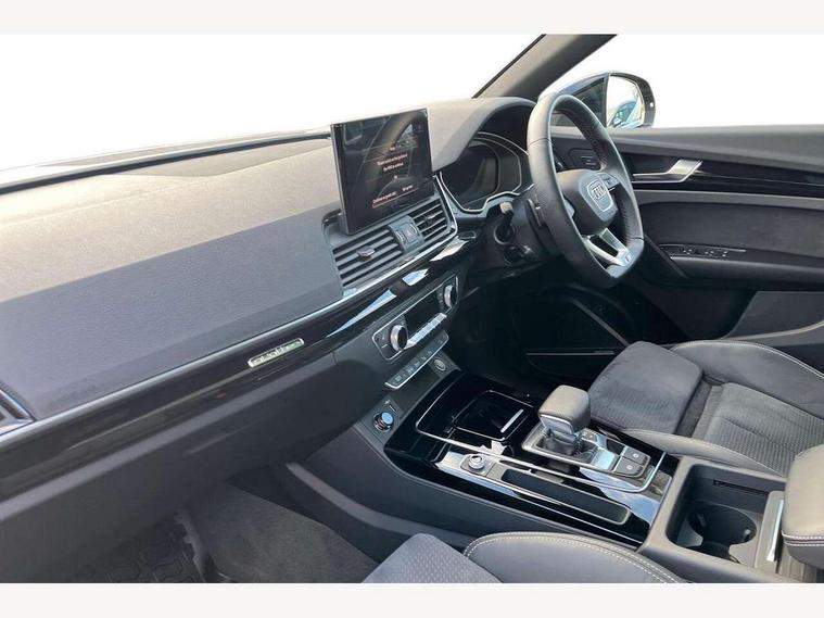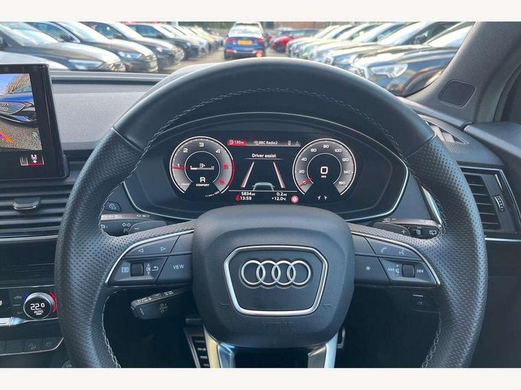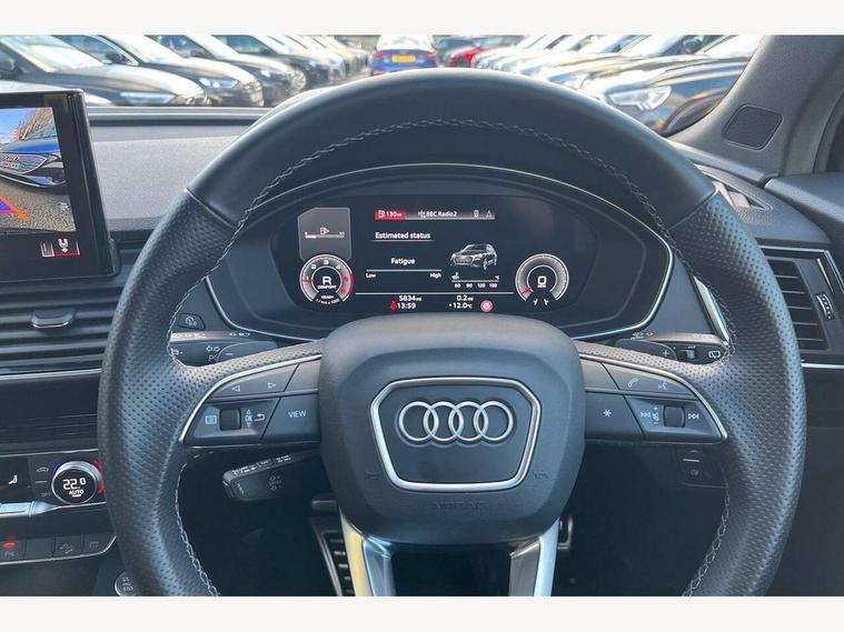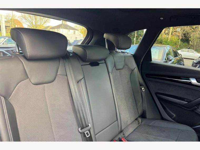 Acoustic front and rear parking sensor, Audi connect safety and service (e-call), Audi drive select, Audi virtual cockpit plus with 12.3" screen and three different layout designs, Audi wireless smartphone interface, Automatic start-stop system with coasting functionality and efficiency programme, Bluetooth interface, Camera based traffic sign recognition, Electro - mechanical power assisted steering, Lane departure warning, MMI navigation plus with 10.1" touch screen, Power tailgate, Reversing camera, Service interval indicator, Voice control system with Audi hotword activation "Hey Audi", Diesel particulate filter, Quattro on demand, S line sports suspension, 2 x USB charging port with aux input socket, 8 loudspeakers, DAB Digital radio, Acoustic windscreen, Auto dimming door mirrors, Auto dimming frameless rear view mirror, Automatic headlight adjustment, Automatic headlights and windscreen wipers, Black roof rails, Black styling with black rings, Body colour bumpers, Body colour rear diffuser with matt aluminium silver surrounds, Body colour underbody protection, Chrome plated exhaust trims, Daytime running lights, Door sills in Selenite silver, Electric adjustable/heated/folding door mirrors, Front air inlet surrounds in aluminium, Front and rear electric windows, Front radiator grille in honeycomb design, LED 3rd brake light, LED headlights and LED tail lights, Loading edge protection in stainless steel, Lower bumpers painted in contrast Manhattan grey, Rear chrome trim strip below lights, Rear privacy glass and rear side windows, Rear side wing doors, Rear wiper, Roof bars, S Line badges on the front wing panels, S Line front and rear bumpers, S Line rear spoiler, S Line side skirts, 3 rear headrests, Black cloth headlining, Comfort front centre armrest, Contrast stitching on seats, steering wheel and gear lever gaiter, Deluxe 3 zone electronic climate control, Front head restraints, Front sport seats with S embossed logo, Front/rear floor mats, Gear lever in black leather, Heated front seats, Height/reach adjustable steering column, Illuminated door sill trims with S logo, Luggage compartment cover, Manual seat adjustment with 4-way electric lumbar support, Single front passenger seat, Stainless steel pedals, Sunvisors with vanity mirrors, Top surface of the rear centre armrest in artificial leather, High gloss pack - Q5, LED interior light pack - Q5, 3 point seatbelts on all seats, 6 airbags - Driver, front passenger, curtain and side airbags, Attention and drowsiness assist, Electrically operated child locks on rear doors, Electromechanical parking brake, Electronic stabilisation control including ABS, ASR and EDL, First aid kit with warning triangle and vests, Front passenger airbag deactivation, Hill descent control, Hill hold assist, ISOFIX child seat mounting for front passenger seat and ISOFIX child seat mounting with Top Tether for outer rear seats, Multi collision brake assist, Pop-up bonnet for pedestrian protection, Pre sense city, Seatbelt monitoring, Tyre pressure warning, Anti theft alarm, Anti-theft wheel bolts, Remote central locking, Remote control key with SAFELOCK and keyless go, Air vents inserts and centre console in gloss black, Tool kit, Tyre repair kit,