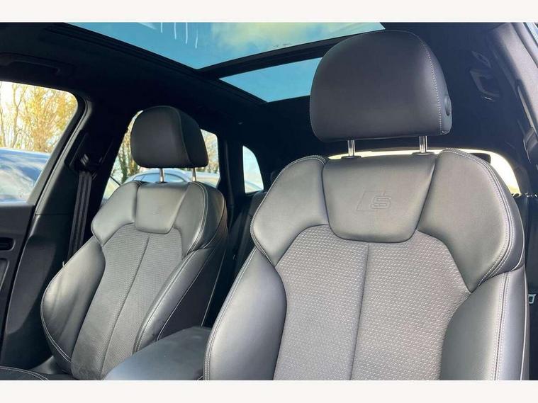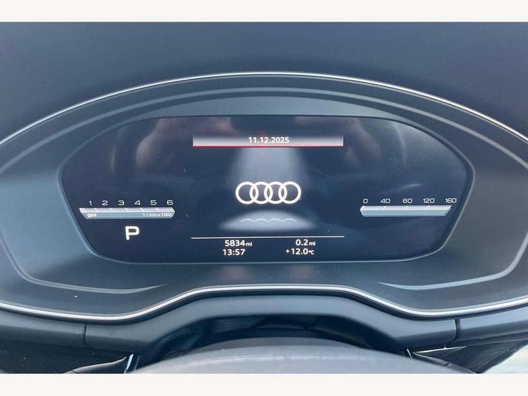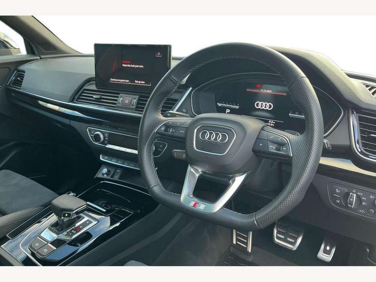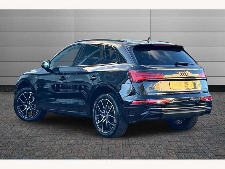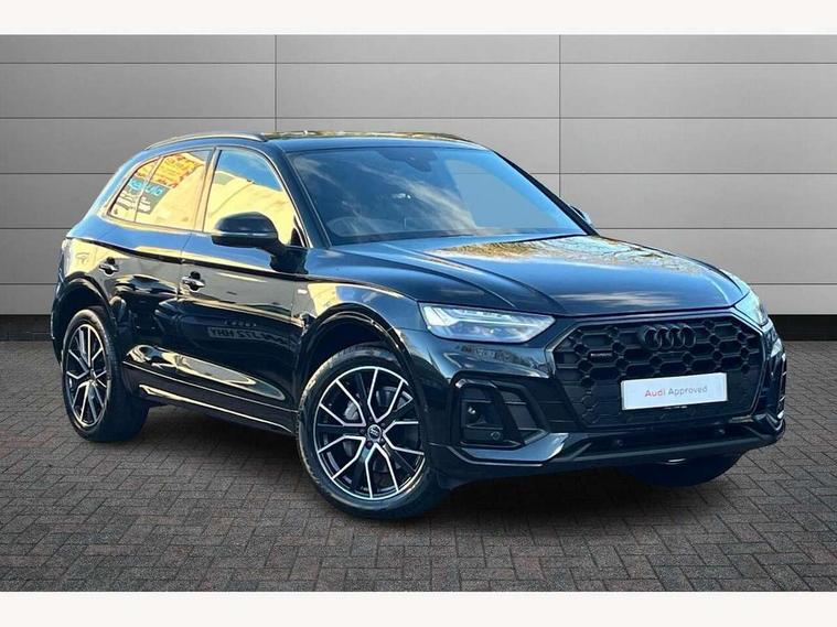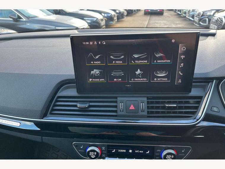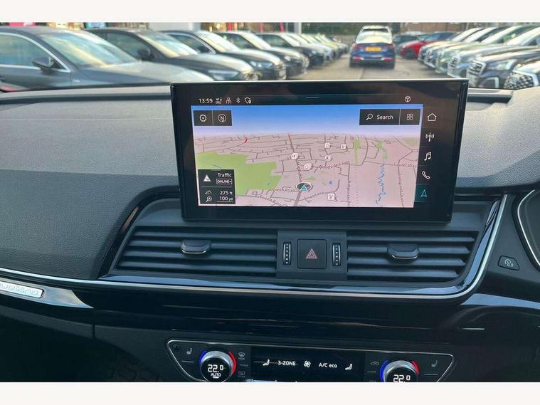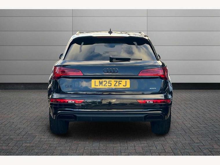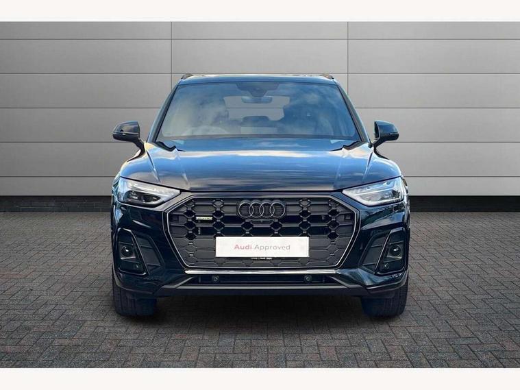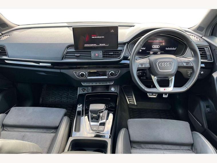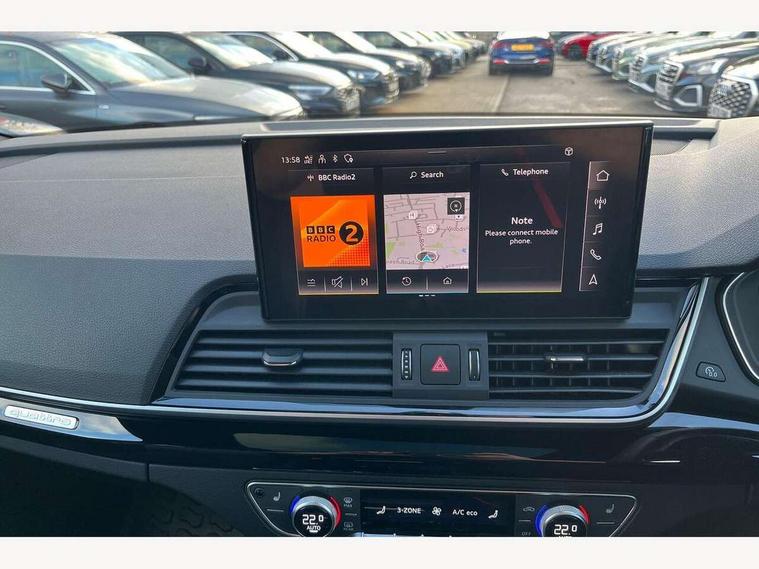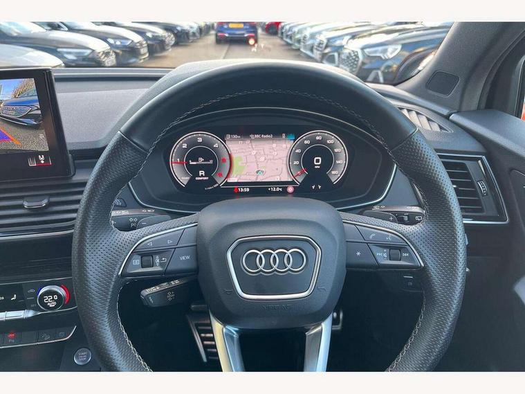 Acoustic front and rear parking sensor, Audi connect safety and service (e-call), Audi drive select, Audi virtual cockpit plus with 12.3" screen and three different layout designs, Audi wireless smartphone interface, Automatic start-stop system with coasting functionality and efficiency programme, Bluetooth interface, Camera based traffic sign recognition, Electro - mechanical power assisted steering, Lane departure warning, MMI navigation plus with 10.1" touch screen, Power tailgate, Reversing camera, Service interval indicator, Voice control system with Audi hotword activation "Hey Audi", Diesel particulate filter, Quattro on demand, S line sports suspension, 2 x USB charging port with aux input socket, 8 loudspeakers, DAB Digital radio, Acoustic windscreen, Auto dimming door mirrors, Auto dimming frameless rear view mirror, Automatic headlight adjustment, Automatic headlights and windscreen wipers, Black roof rails, Black styling with black rings, Body colour bumpers, Body colour rear diffuser with matt aluminium silver surrounds, Body colour underbody protection, Chrome plated exhaust trims, Daytime running lights, Door sills in Selenite silver, Electric adjustable/heated/folding door mirrors, Front air inlet surrounds in aluminium, Front and rear electric windows, Front radiator grille in honeycomb design, LED 3rd brake light, LED headlights and LED tail lights, Loading edge protection in stainless steel, Lower bumpers painted in contrast Manhattan grey, Rear chrome trim strip below lights, Rear privacy glass and rear side windows, Rear side wing doors, Rear wiper, Roof bars, S Line badges on the front wing panels, S Line front and rear bumpers, S Line rear spoiler, S Line side skirts, 3 rear headrests, Black cloth headlining, Comfort front centre armrest, Contrast stitching on seats, steering wheel and gear lever gaiter, Deluxe 3 zone electronic climate control, Front head restraints, Front sport seats with S embossed logo, Front/rear floor mats, Gear lever in black leather, Heated front seats, Height/reach adjustable steering column, Illuminated door sill trims with S logo, Luggage compartment cover, Manual seat adjustment with 4-way electric lumbar support, Single front passenger seat, Stainless steel pedals, Sunvisors with vanity mirrors, Top surface of the rear centre armrest in artificial leather, High gloss pack - Q5, LED interior light pack - Q5, 3 point seatbelts on all seats, 6 airbags - Driver, front passenger, curtain and side airbags, Attention and drowsiness assist, Electrically operated child locks on rear doors, Electromechanical parking brake, Electronic stabilisation control including ABS, ASR and EDL, First aid kit with warning triangle and vests, Front passenger airbag deactivation, Hill descent control, Hill hold assist, ISOFIX child seat mounting for front passenger seat and ISOFIX child seat mounting with Top Tether for outer rear seats, Multi collision brake assist, Pop-up bonnet for pedestrian protection, Pre sense city, Seatbelt monitoring, Tyre pressure warning, Anti theft alarm, Anti-theft wheel bolts, Remote central locking, Remote control key with SAFELOCK and keyless go, Air vents inserts and centre console in gloss black, Tool kit, Tyre repair kit,