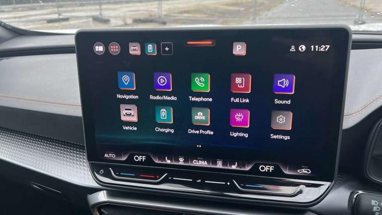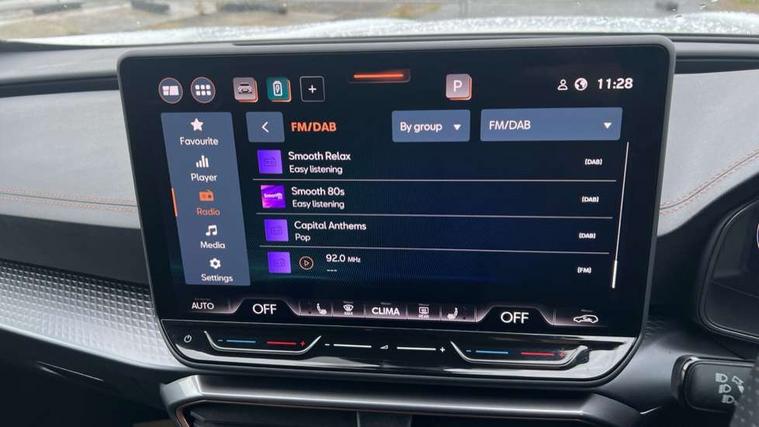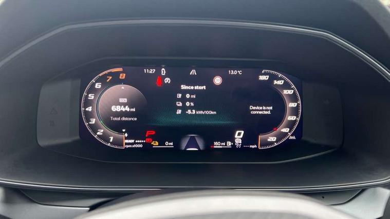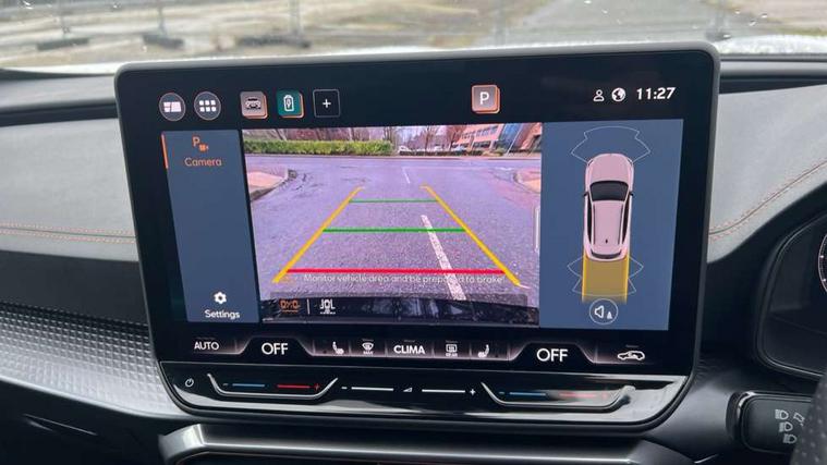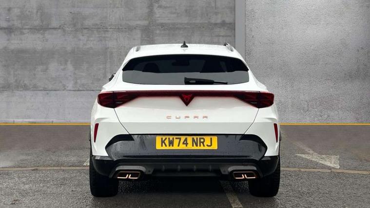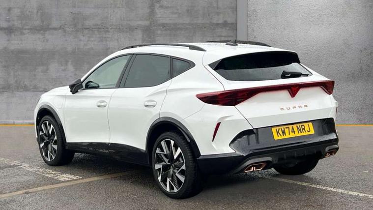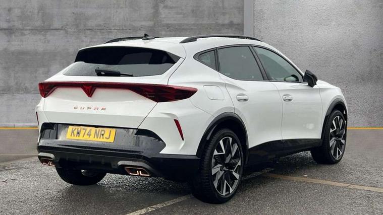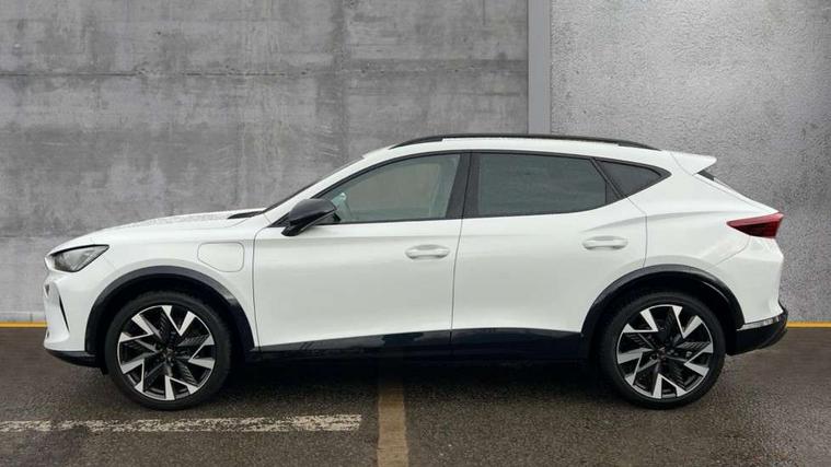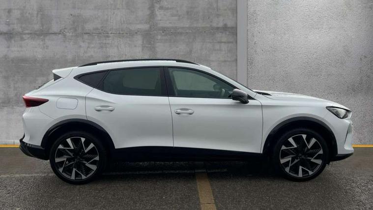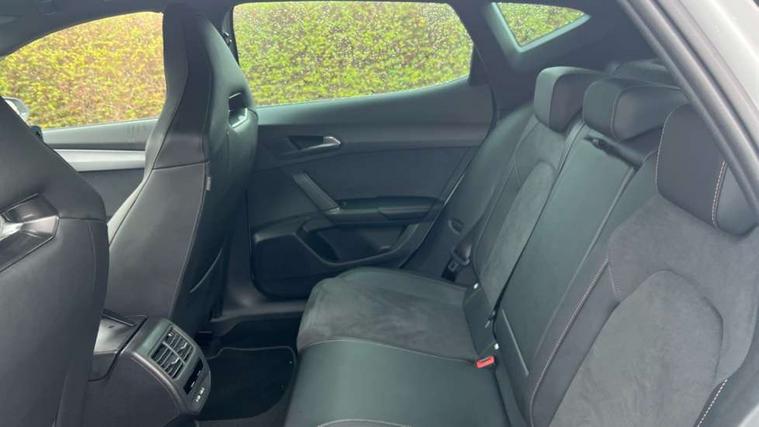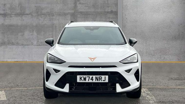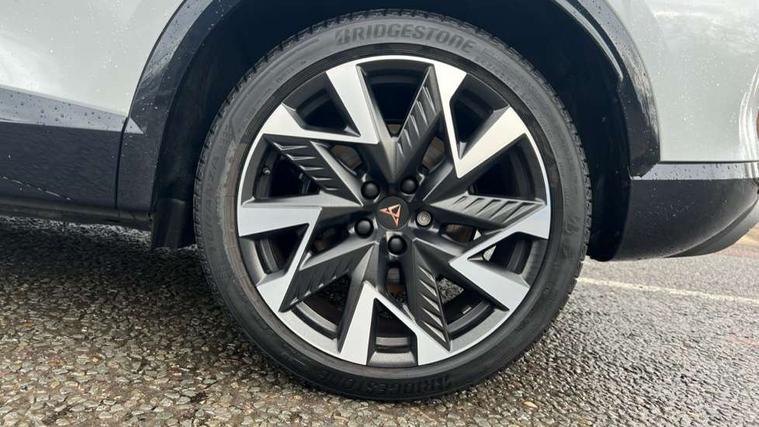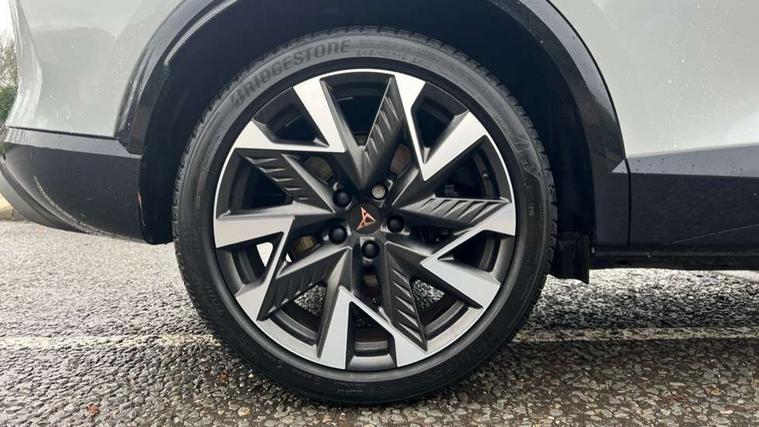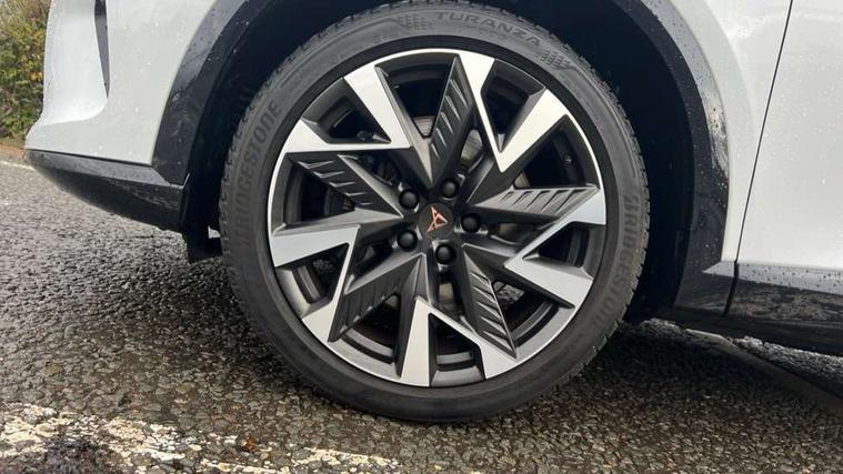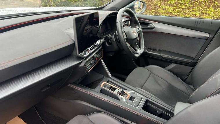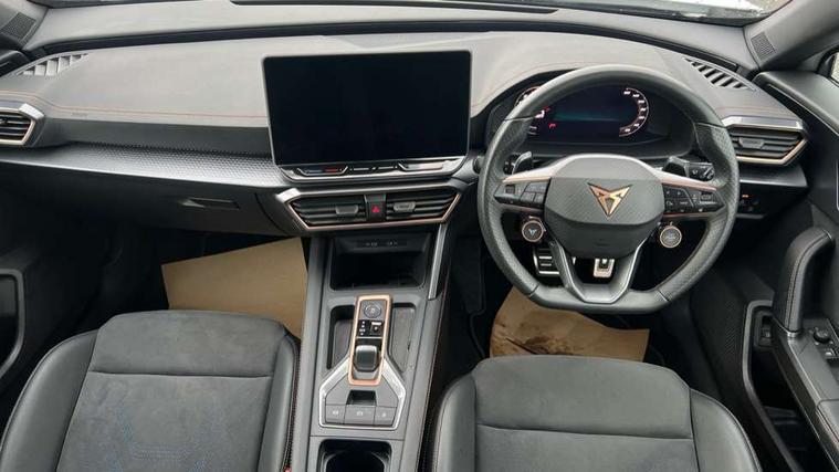 10.25" digital cockpit and configurable dashboard, Adaptive cruise control with follow-to-stop and speed limiter, Advanced driver alert system, Dynamic chassis control with driving profile selection (Comfort, Sport, CUPRA, Individual), Dynamic road sign display, Emergency steering support with turn assist, Forward collision warning with automatic braking, Front and rear parking sensors, Full link phone integration, Lane assist, Rear view camera, RPM, trip computer, outside temp gauge, instrument light brightness, low fuel warning light, lights on reminder, gearshift indicator, Service interval indicator, Speed sensitive power steering, Start/stop system with regenerative braking, Virtual pedal and electric tailgate, Voice control system, Wired Android Auto, Wireless apple carplay, Wireless phone charger, 10 amp mode 2 charging cable, 32 amp mode 3 charging cable, Adaptive chassis control with continuous operation, CUPRA sport suspension, Electronic locking differential and dynamic traction support, 2 front and 2 rear USB type C sockets, Media system with navigation, 12.9" touchscreen display, voice control, DAB, steering wheel mounted controls, Auto dimming rear view mirror, Body colour door handles, Body coloured bumpers, Dark grey wing mirror, Daytime running light with automatic headlight control and coming home feature, Door panel ambient lighting, Dynamic headlight range control, Electric front/rear windows, Electrically adjustable heated and folding door mirrors with memory function, Gloss black roof rails and window surrounds, High beam assist, LED 3rd brake light, LED front fog lamps with cornering function, LED Taillights with dynamic indicator, Matrix LED headlights with multifunction camera, Rain sensing wipers, Rear diffuser with copper simulated exhaust pipes, Rear fog lights, Rear side wing doors, Rear wash/wipe, Tinted rear windows, Welcome lights (within exterior mirror housing), 12V socket, 2 front and 2 rear reading lights, 3 seat bench in 2nd row, 60/40 split rear bench seat with armrest and mechanical seat release, Black headlining, Black interior roof lining, Cupra sports pedals, Dust/pollen filter, Electrically adjustable front seats with lumbar support and memory function, Front and rear head restraints, Front centre armrest, Heated front seats, Heated supersports multifunction leather steering wheel with satellite buttons and gear shift paddles, Height/reach adjust steering wheel, Illuminated aluminium doorsteps, Illuminated interior front door sills, Illuminated sunvisor with mirror, Isofix, Leather dashboard, door insert and side trim panel, LED smart wraparound lighting, PVC/Dinamica microfiber upholstery + bucket seats, Satellite steering wheel, Single front passenger seat, Storage pockets on rear of front seats, Three zone climate control with control panel in rear, 3 point seatbelts on all rear seats, ABS, Brake control system - ESC and brake booster, Child proof door locks, Driver and front passenger airbags with front passenger airbag de-activation, Electronic parking brake, Front and rear disc brakes, Front side curtain airbags, Hill hold control, Public e-call, Seat belt reminder for front and rear seats, Tyre pressure monitoring system, Anti theft alarm system, KESSY Advanced - Keyless start, keyless entry with SAFELOCK, Locking wheel bolts, Copper and aluminium interior detailing, 19" Sandstorm machined sport black and silver alloy wheels, Breakdown and tool kit,