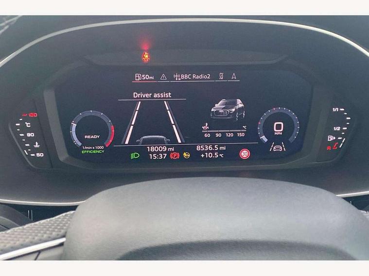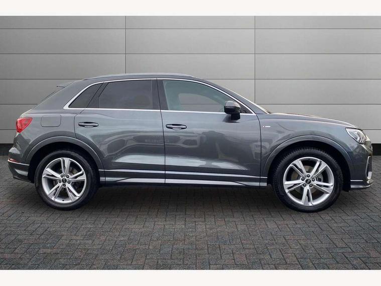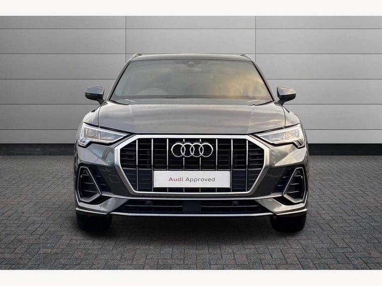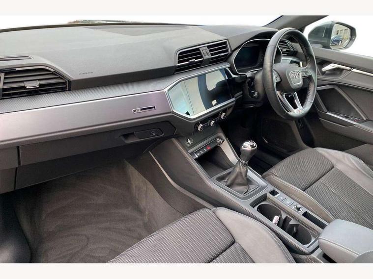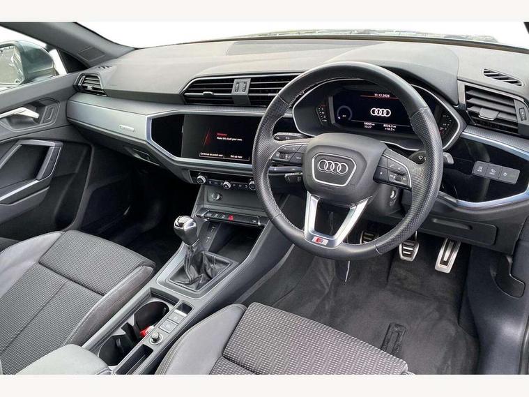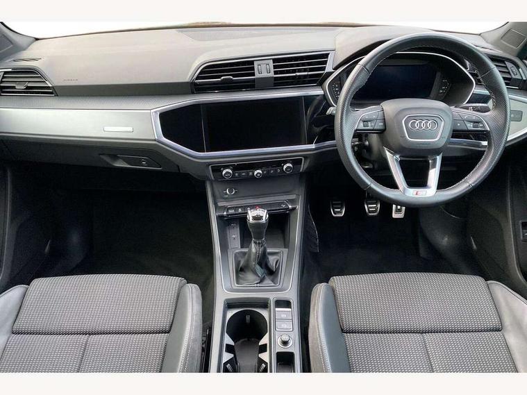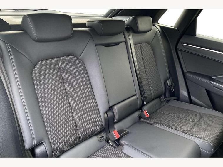 Amazon alexa Integration, Audi drive select, Audi lane departure warning, Audi Virtual Cockpit - 10.25" display, Bluetooth interface, Camera based traffic sign recognition, Cruise control + speed limiter, Legal emergency call, MMI Navigation Plus with high resolution 10.1 inch touchscreen colour display, Power operated tailgate, Progressive steering, Rear parking sensors, Service interval indicator, Smartphone interface includes wireless Apple carplay/Android Auto, Start stop system with recuperation, Voice control system with natural language interaction, Sports suspension, 2 USB-C ports with charge and data functions, 6 passive loudspeakers, DAB digital radio module, Acoustic windscreen, Aluminium roof rails, Aluminium window trim, Auto dimming frameless rear view mirror, Body colour front spoiler blade, Body coloured bumpers, Electrically folding, adjustable and heated door mirrors with integrated LED side indicators and kerb view function for passenger side, Front and rear electric windows, Front fog lights, Front side air inlets in matt platinum grey, Grille vertical bars in aluminium silver/Matt, High gloss black finish B and C pillars, LED Dynamic rear indicators, LED headlights with LED daytime running lights, LED rear lights, LED third brake light, Privacy glass dark tinted rear and rear-side windows (from B-pillar backwards), Rain and light sensors, Rear diffuser grille in grained matt black, Rear diffuser strip in matt titanium black, Rear side wing doors, Rear wiper, S line badges on front wings, S Line front and rear bumpers, Side skirt insert in matt Platinium grey, Titanium black radiator grille, Variable front intermittent wipers, 12V socket in rear centre console, 3 seat bench in 2nd row, 40:20:40 folding with manual adjustment for 60:40 forwards/backwards position and backrest angle, Adjustable rear seat bench/backrest with centre armrest and cupholder, Black cloth headlining, Dual zone electronic climate control, Front and rear black floor mats with contrast stitching in rock grey, Front and rear headrests, Front and rear roof module including reading lights, Front centre armrest, Glove compartment lighting, Height and reach adjustable steering wheel, Illuminated door sill trims with S logo, ISOFIX child seat mounting for front passenger with airbag deactivation and outer rear seat including top tether attachment point for outer rear seats, Luggage compartment light, Manual front seats with height adjustment, Perforated leather gearknob, Single front passenger seat, Stainless steel luggage compartment sill finisher, Stainless steel pedals, Ambient lighting pack - Q3, Non smoking pack - Q3, 3x3 point rear seatbelts, 6 airbags - Driver, front passenger, curtain and side windows, Audi pre-sense front with pedestrain and cyclist recognition, Electrically operated child locks on rear doors, Electromechanical parking brake, Electronic stabilisation control including ABS, ASR and EDL, Front seatbelt reminder, Hill descent control, Hill hold assist, Pre sense basic, Seatbelt monitoring, Tyre pressure warning, Warning triangle and first aid kit, Anti theft alarm, Anti theft wheel bolts, Immobiliser, Remote central locking, Dark matt brushed aluminium inlay, Detail dashboard around MMI touch colour display in glass look, black with surround in aluminium look, Leatherette door armrest,