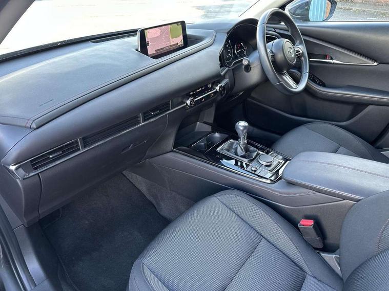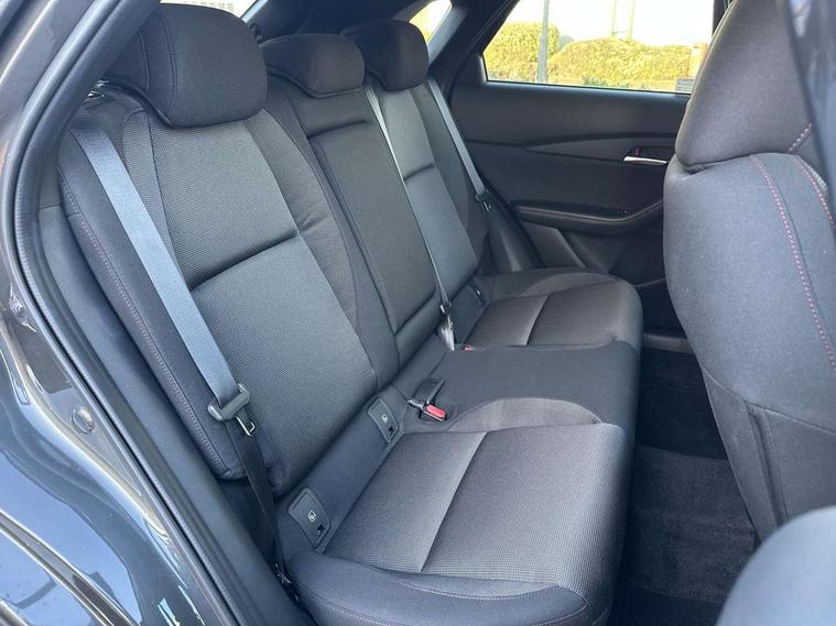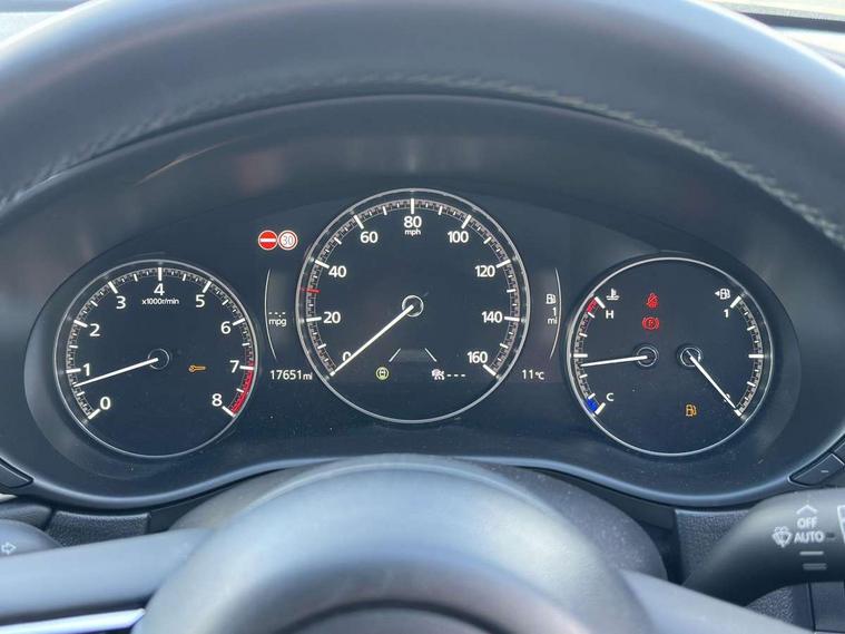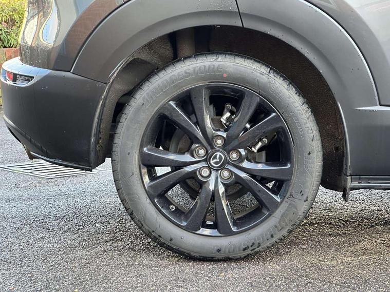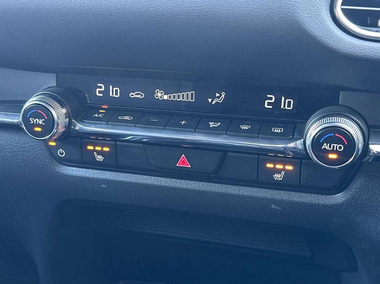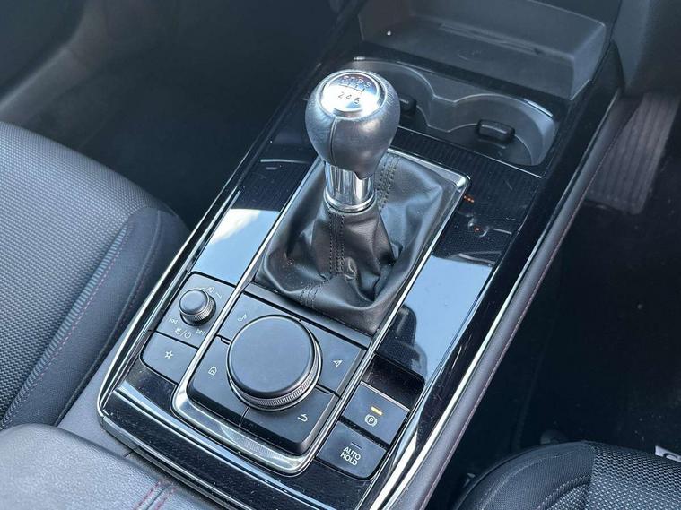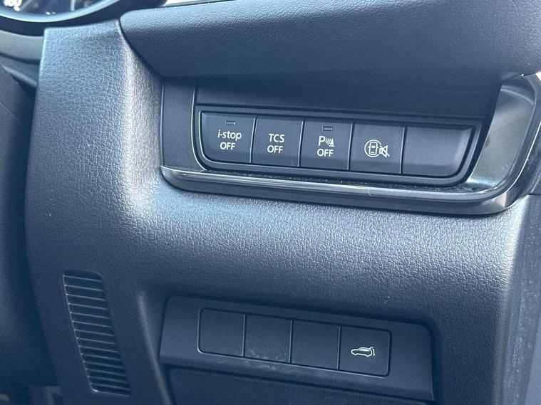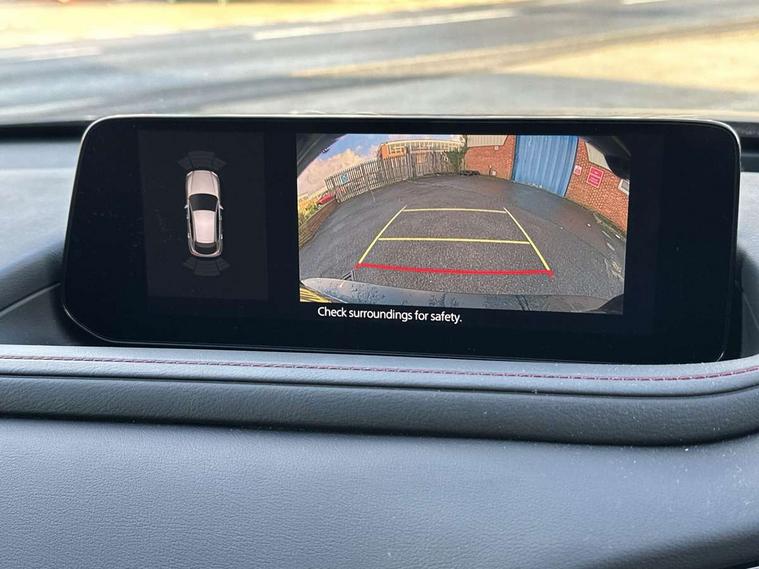 10.25" display with Mazda Connect infotainment, 7" TFT Colour driver instrument panel display, Adaptive cruise control (Mazda radar cruise control), Blind spot monitoring with rear cross traffic alert, Driver attention alert system, E-call with GPS, Emergency stop signalling system, Engine start/stop button, Front and rear parking sensors, Integrated bluetooth, Integrated Mazda navigation system, Intelligent speed assist, Lane keep assist system (LAS) with Lane departure warning system (LDWS), Mazda connected services, PAS, Power lift gate, Qi wireless charging, Reversing camera, Service indicator, Tailgate, Traffic sign recognition, Trip computer, Windscreen projected colour active driving display (HUD), Wireless Apple CarPlay/Android Auto, i-stop, 2 USB charging ports in front inner central armrest, AM / FM / DAB radio with 8 speakers, Multimedia Commander including separate volume dial, Steering wheel mounted audio/bluetooth controls, Auto dimming rear view mirror, Auto headlight levelling, B-pillar and C-pillar garnishes in piano black finish, Black electrically adjustable, heated auto power folding door mirrors with integrated indicators, Chrome finish signature wing in front grille, Coming/leaving home lighting function, Dual chrome exhaust, Dusk sensing headlights, Electric front/rear windows with one touch auto up/down, Front kodo turn signal, Gloss black front grille, Gloss black rear roof spoiler, LED headlights with halogen daytime running lights and high beam control, LED rear combination lights, Privacy glass (rear side windows and rear screen), Rain sensing front wipers with adjustable speed and intermittent wipe, Rear fog lights, Rear side wing doors, Rear wiper, Third brake light, 12V power outlet in centre console, 3 seat bench in 2nd row, 60/40 split fold down rear seats, Chrome interior trim accents with steering wheel centre bezel, surround of engine start / stop button and glove box handle, Cloth upholstery with red stitching and interior accents, Dark cloth door panel inserts, Dashboard, door cards and front centre armrest in black cloth with red stitching, Driver and front passenger visors with covered vanity mirror and driver ticket holder, Driver seat manual slide, recline, height and seat tilt adjust, Driver, front passenger and two rear door storage, Driver, Front passenger and two rear grab handles with coathooks, Dual zone climate control air conditioning with rear air vents, Folding rear centre armrest with two cup holders, Front and rear (x3) head restraints, Front and rear LED lighting, Front armrest, Front centre storage with two cupholders, Front passenger seatback pockets, Front passengers seat manual slide, recline and height adjustment, Gear shift indicator, Glovebox illumination, Heated front seats with 3 stage setting, ISOFIX child seat anchorage points attached on outer rear seats, Leather wrapped gear shift knob, Leather wrapped steering wheel with telescopic and tilt adjustment, LED luggage compartment lighting, Light roof headlining and pillars, Roof mounted sunglasses holder, Single front passenger seat, 3 point ELR front seat belts x2 with pretensioners, 3 point ELR rear seat belts, Anti-lock braking system (ABS), Drivers knee airbag, DSC - Dynamic Stability Control, Electronic parking brake with auto disengage function and auto hold function, Front and rear curtain airbags, Front dual stage driver and single stage front passenger airbags, Front passenger airbag cut-off switch, Front side airbags, Front smart city brake support, G-Vectoring control plus, Hill launch assist, Manual child lock in rear doors, Mild Hybrid system with regenerative braking, Seatbelt reminder for driver/front passenger and rear seats, Traction control system (TCS), Tyre pressure monitoring system (TPMS), Remote central locking with deadlocking and automatic door lock when driving, Smart keyless entry, Thatcham accredited alarm and immobiliser, 18" Black metallic alloy wheels, Emergency tyre repair kit,