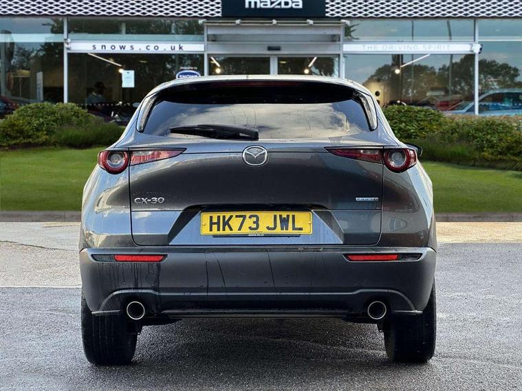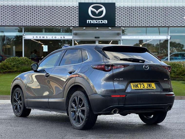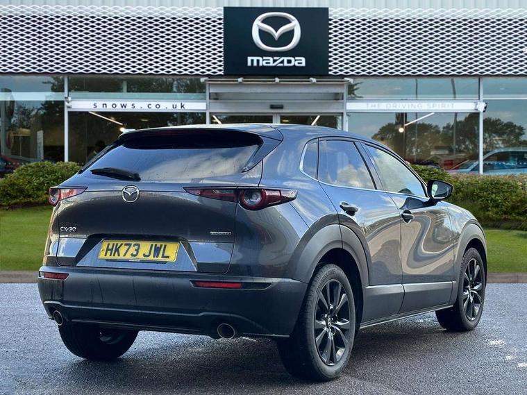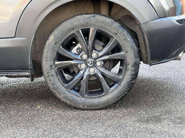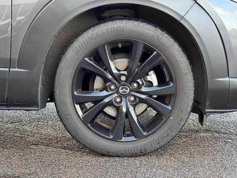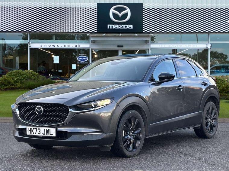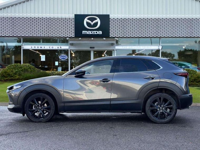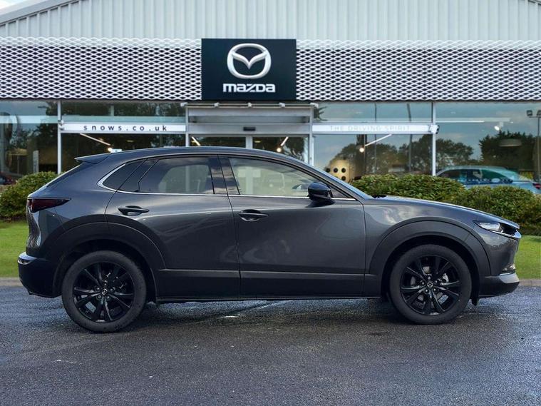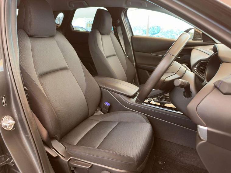 10.25" display with Mazda Connect infotainment, 7" TFT Colour driver instrument panel display, Adaptive cruise control (Mazda radar cruise control), Blind spot monitoring with rear cross traffic alert, Driver attention alert system, E-call with GPS, Emergency stop signalling system, Engine start/stop button, Front and rear parking sensors, Integrated bluetooth, Integrated Mazda navigation system, Intelligent speed assist, Lane keep assist system (LAS) with Lane departure warning system (LDWS), Mazda connected services, PAS, Power lift gate, Qi wireless charging, Reversing camera, Service indicator, Tailgate, Traffic sign recognition, Trip computer, Windscreen projected colour active driving display (HUD), Wireless Apple CarPlay/Android Auto, i-stop, 2 USB charging ports in front inner central armrest, AM / FM / DAB radio with 8 speakers, Multimedia Commander including separate volume dial, Steering wheel mounted audio/bluetooth controls, Auto dimming rear view mirror, Auto headlight levelling, B-pillar and C-pillar garnishes in piano black finish, Black electrically adjustable, heated auto power folding door mirrors with integrated indicators, Chrome finish signature wing in front grille, Coming/leaving home lighting function, Dual chrome exhaust, Dusk sensing headlights, Electric front/rear windows with one touch auto up/down, Front kodo turn signal, Gloss black front grille, Gloss black rear roof spoiler, LED headlights with halogen daytime running lights and high beam control, LED rear combination lights, Privacy glass (rear side windows and rear screen), Rain sensing front wipers with adjustable speed and intermittent wipe, Rear fog lights, Rear side wing doors, Rear wiper, Third brake light, 12V power outlet in centre console, 3 seat bench in 2nd row, 60/40 split fold down rear seats, Chrome interior trim accents with steering wheel centre bezel, surround of engine start / stop button and glove box handle, Cloth upholstery with red stitching and interior accents, Dark cloth door panel inserts, Dashboard, door cards and front centre armrest in black cloth with red stitching, Driver and front passenger visors with covered vanity mirror and driver ticket holder, Driver seat manual slide, recline, height and seat tilt adjust, Driver, front passenger and two rear door storage, Driver, Front passenger and two rear grab handles with coathooks, Dual zone climate control air conditioning with rear air vents, Folding rear centre armrest with two cup holders, Front and rear (x3) head restraints, Front and rear LED lighting, Front armrest, Front centre storage with two cupholders, Front passenger seatback pockets, Front passengers seat manual slide, recline and height adjustment, Gear shift indicator, Glovebox illumination, Heated front seats with 3 stage setting, ISOFIX child seat anchorage points attached on outer rear seats, Leather wrapped gear shift knob, Leather wrapped steering wheel with telescopic and tilt adjustment, LED luggage compartment lighting, Light roof headlining and pillars, Roof mounted sunglasses holder, Single front passenger seat, 3 point ELR front seat belts x2 with pretensioners, 3 point ELR rear seat belts, Anti-lock braking system (ABS), Drivers knee airbag, DSC - Dynamic Stability Control, Electronic parking brake with auto disengage function and auto hold function, Front and rear curtain airbags, Front dual stage driver and single stage front passenger airbags, Front passenger airbag cut-off switch, Front side airbags, Front smart city brake support, G-Vectoring control plus, Hill launch assist, Manual child lock in rear doors, Mild Hybrid system with regenerative braking, Seatbelt reminder for driver/front passenger and rear seats, Traction control system (TCS), Tyre pressure monitoring system (TPMS), Remote central locking with deadlocking and automatic door lock when driving, Smart keyless entry, Thatcham accredited alarm and immobiliser, 18" Black metallic alloy wheels, Emergency tyre repair kit,