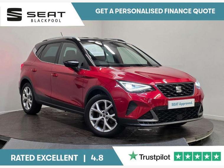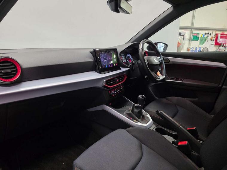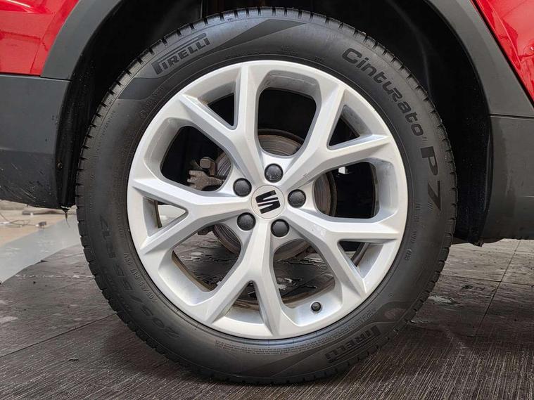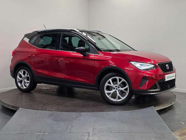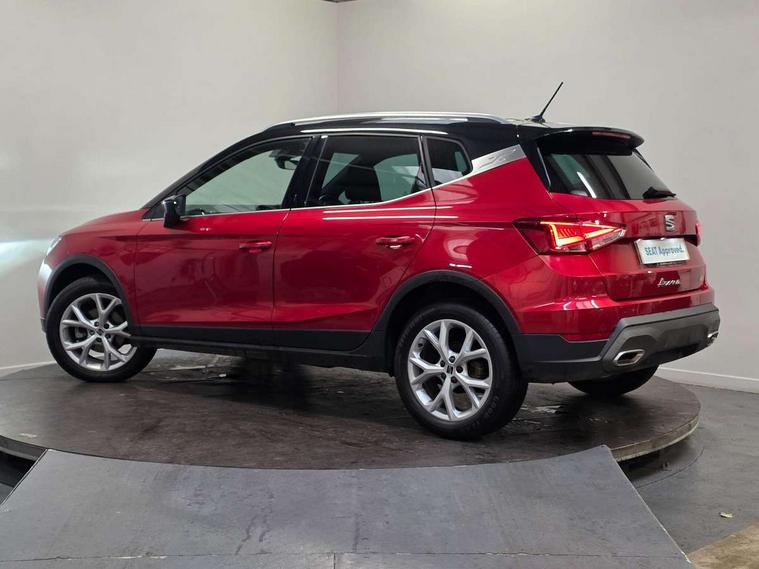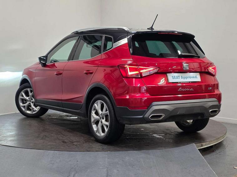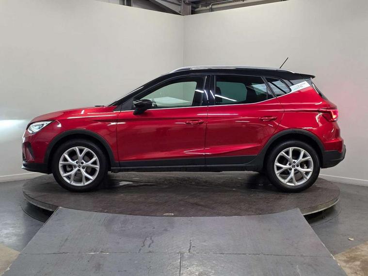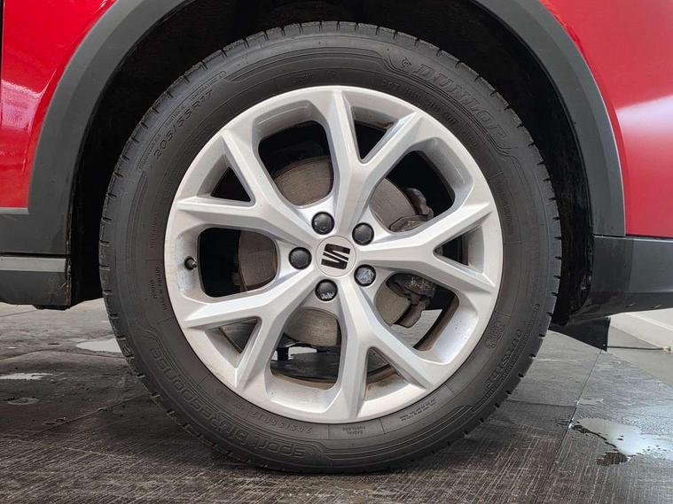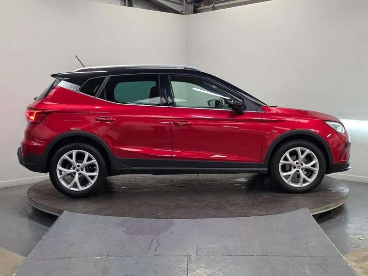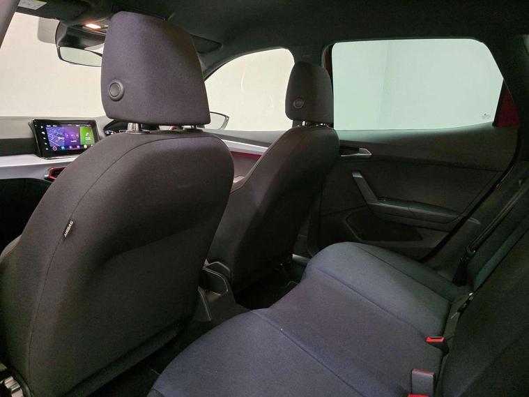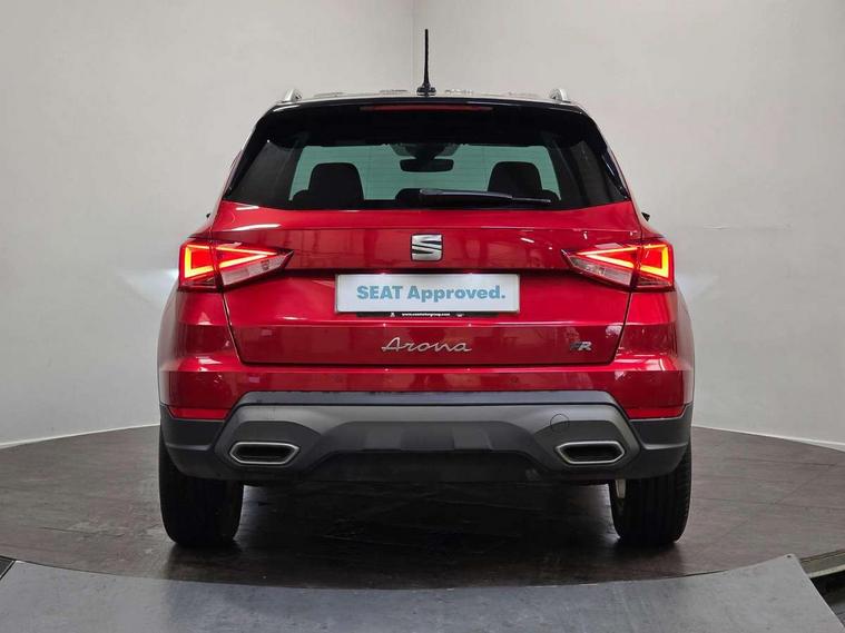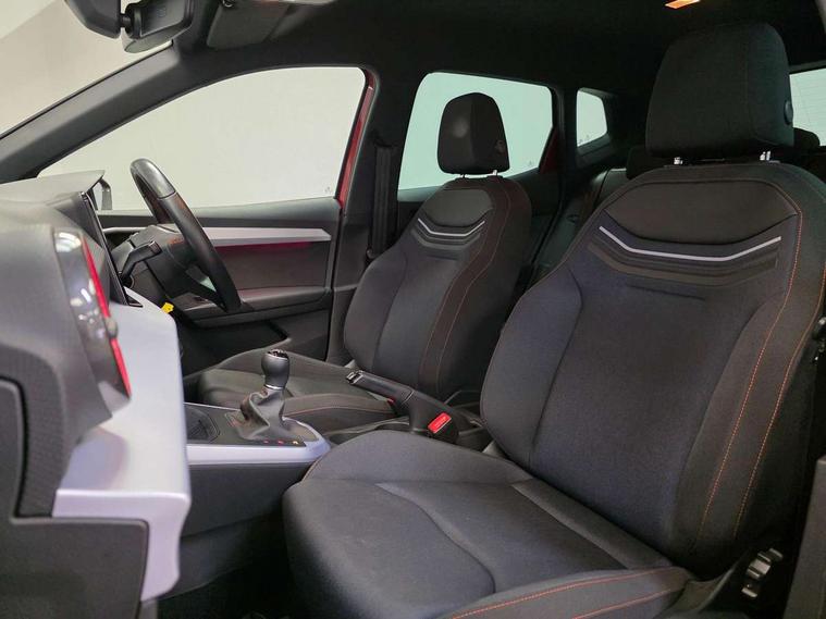 'Lights On' Reminder warning buzzer, 8" Digital cockpit, Digital clock, E-call, Electric speed sensitive power steering, Full Link Smartphone Integration with Mirror Link, Apple Car Play, Google Android Auto with USB Type C cable for Apple and Android compatibility, Lane keeping system, Low fuel warning light, Outside temperature display, Rear parking sensor, RPM counter, Seat connect with safety, service, remote and online, SEAT Drive profile - Four different models normal-sport-eco-individual, steering response, throttle response, Trip computer, Bluetooth interface for hands free and audio streaming, DAB digital radio and AM/FM radio, Steering wheel mounted audio controls, Anti theft roof antenna, Auto dimming interior rear view mirror, Automatic activation of hazard warning lights, Body coloured bumpers, Body coloured door handle inserts, Chrome roof rails and window surrounds, Dark tinted rear windows, Electric front/rear windows, Electrically adjustable, heated and folding door mirrors, Front fog lights with cornering function and rear fog light, FULL LED automatic headlights with dynamic headlight range control, coming and leaving home, LED daytime running lights, LED rear tail lights and licence plate lights, Protective side mouldings, Rain sensing wipers, Rear side wing doors, Rear spoiler, Rear window wash/wipe, Roof colour door mirrors, Third brake light, Twin exhaust pipe styling hidden exhaust pipe, Visible VIN plate, Windshield wiper with intermittent control and potentiometer, 2 cupholders, 3 seat bench in 2nd row, 60/40 split folding rear seat, Aircare filter, Black interior roof, Cloth upholstery, Double boot floor, Driver sunvisor with covered mirror + card holder, Dual zone climate control, Front courtesy light with 2x front and 2x rear reading lights, Front sport seats, Gear shift indicator, Height adjustable front seats, Height/reach adjustable steering column, Illuminated boot, Instrument lighting with brightness control, Interior ambient lighting, Interior light in footwell, central console and door panel, ISOFIX points in outer rear seats with top tether anchorage points, Passenger sunvisor with vanity mirror, Perforated flat bottomed leather steering wheel/gear knob/handbrake with red stitching and FR logo, Single front passenger seat, Two front and three rear height adjustable headrests, Connectivity pack plus - Arona, Interior chrome pack - Arona, 3 point seatbelts on all rear seats, ABS, Active front headrests, Child locks on rear doors, Driver and front passenger airbags with front passenger airbag de activation, front side and curtain airbags, Electronic stability control, Emergency Brake Assist (EBA) and front assist, Front and rear seatbelt reminder, Hill hold control, Multi-Collision braking, Tiredness recognition system, Traction control, Tyre pressure monitoring system, Alarm with back-up horn, Electronic engine immobiliser, Locking wheel bolts, Remote central locking + deadlocks, Tow away protection, Titan black dashboard, 17" Dynamic alloy wheels,