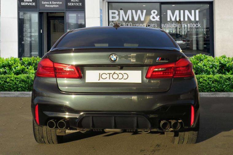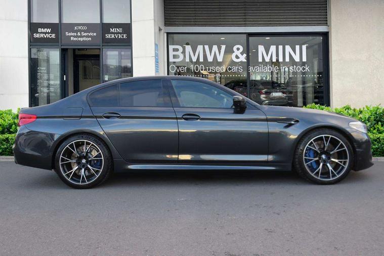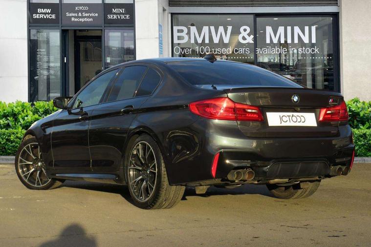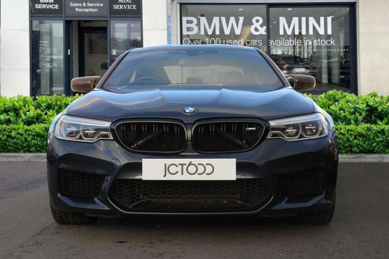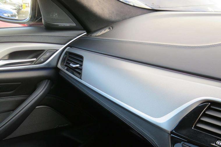 20GB Hard drive, Automatic bootlid operation, BMW Live Cockpit Professional sat nav system including 10.25" high resolution display and Intelligent Voice Assistant, BMW Online services, BMW Teleservices, Brake force display, City brake control, Comfort access system with smart opener, Enhanced bluetooth with wireless charging, Front/rear Parking distance control, Head up Display, iDrive controller and display with 10.2" colour display monitor, Lane departure and rear collision warning system, On board computer, On-board diagnosis - OBD, Outside temperature display, Park assist plus, Personal Profile, Rear cross traffic alert, Reversing camera, Service interval indicator, Servotronic PAS, Speed limiter, Voice control system, Wifi hotspot preparation, Adaptive drive with variable damper control, Anti-roll bars, Petrol Particulate Filter, BMW professional radio, DAB Digital radio, Gesture control for infotainment system, Anti-corrosion treatment, Auto dimming door mirrors, Auto dimming rear view mirror, Body colour door handles, Body coloured bumpers, Body coloured side sills, Dynamic brake lights, Electric folding/heated door mirrors with integrated indicators, Electric front and rear windows with fingertip open/close + anti-trap all round, Follow me home headlights, Heated windscreen washer jets, High beam assistant, High gloss black door mirrors, High gloss black kidney grille, High gloss black rear apron, High gloss black side gills with M5 logo, Icon Adaptive LED headlights, Illuminated door handles, Illuminated door sill finishers with M5 designation, LED daytime running lights, M rear spoiler, M side gills with M5 logo, M Sport exhaust system, Rain sensor with auto light activation system, 12V power point front, 4 zone control automatic air conditioning, Additional 12V sockets in rear and luggage compartment + twin USB charging sockets, Alcantara headlining in anthracite, Ambient interior lighting, Anthracite Velour floor mats, Battery in luggage with jump start facility, Electric adjustable steering column, Front centre armrest with storage compartment, Front cupholders x 2, Front footwell lights, Front reading lights, Front/rear armrests within door panels, Gearshift paddles, Illuminated glovebox with lock, Isofix rear child seat preparation, M leather steering wheel, M Sport multi-function front seats with electric lumbar support and driver memory, Multi-function controls for steering wheel, Rear centre armrest with 2 cupholders + storage, Rear footwell lights, Rear headrests, Connected package professional - M5, ABS/EBD, Auto hold function, Automatic Stability Control (ASC), BMW emergency call, Brake assist function, Brake energy regeneration, Cornering brake control (CBC), Crash Sensor - activates hazard/interior lighting + unlocks doors, Door reinforcements, Driver/front passenger side airbags, Driver/Passenger airbags (Impact dependent), DSC - Dynamic Stability Control, Dual horn, Dynamic brake control, Dynamic Traction Control - DTC, Electromechanical parking brake, Front and rear head airbags, Front head restraints with anti-whiplash, Front passenger airbag deactivation, Fuel cut off safety device, Hill start assist, M sport seatbelt, Motor Slip Regulation (MSR) - Engine Drag Torque Control, Seat belts front inertia reel with pyrotechnical belt latch tensioner, belt force limiter and belt restrainer, Side impact protection, Three inertia reel rear seatbelts, Tyre pressure monitoring system, Warning triangle and first aid kit, Automatic drive away locking facility, Engine immobiliser, Locking wheel bolts, Remote central locking, Remote control Thatcham category 1 alarm, 20" M Y-spoke light alloy wheels with mixed tyres in bicolour finish - style 789, Tyre mobility system,