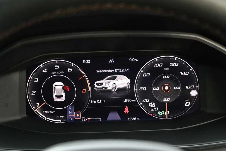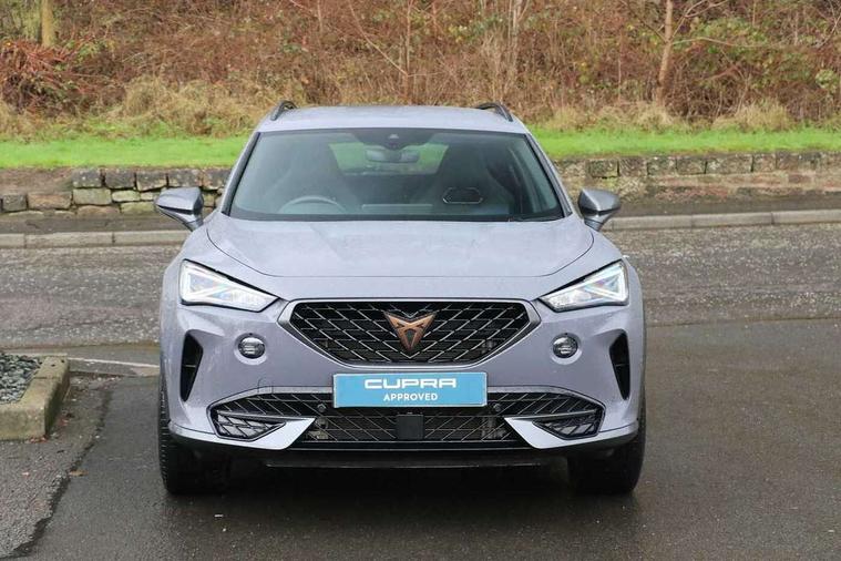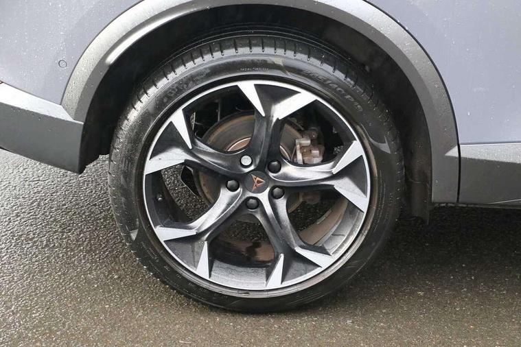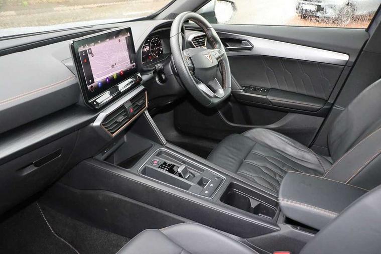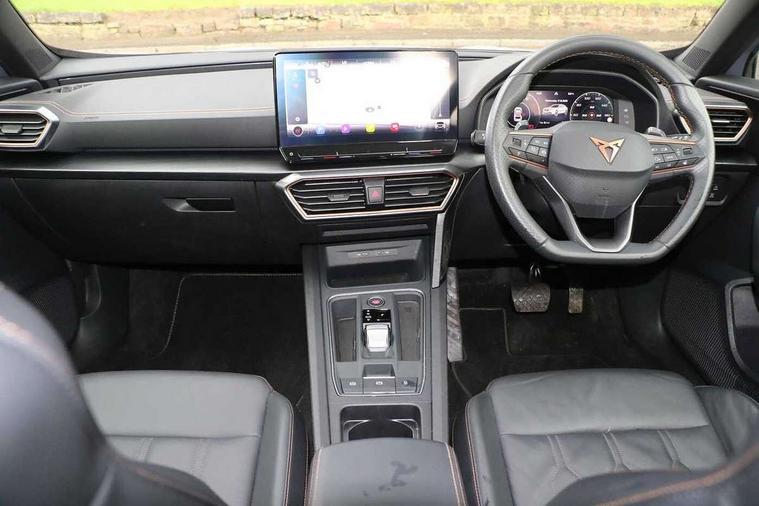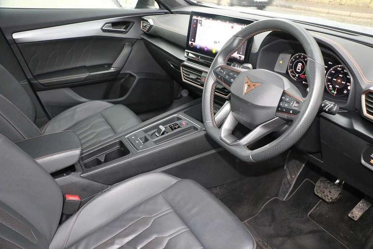 Digital cockpit and configurable dashboard, Driver alert system, Driving profile selection, Forward collision warning with automatic braking, Lane assist, Navigation system with 12'' Touchscreen Display, Park assist (inc front/rear parking sensors), PAS, Predictive adaptive cruise control with speed limiter, Rear view camera, RPM, trip computer, outside temp gauge, instrument light brightness, low fuel warning light, lights on reminder, gearshift indicator, Service interval indicator, Start/stop system with regenerative braking, Voice control system, Wireless apple carplay, Wireless phone charger, Electronic locking differential and dynamic traction support, Standard suspension, 2 front and 2 rear USB type C sockets, Auxiliary input socket, DAB radio, Auto dimming rear view mirror, Body colour door handles, Body coloured bumpers, Dark grey wing mirror, Daytime running light with automatic headlight control and coming home feature, Dynamic headlight range control, Electric front/rear windows, Electrically adjustable heated and folding door mirrors with memory function, Front fog lamps with cornering function, Gloss black roof rails and window surrounds, LED Headlights, LED Taillights with dynamic indicator, Rain sensing wipers, Rear diffuser with black simulated exhaust pipes, Rear side wing doors, Rear wash/wipe, Third brake light, Tinted rear windows, Welcome lights, 12v power supply in centre console, 12V socket, 12v socket in loadspace, 2 front and 2 rear reading lights, 230V socket, 3 seat bench in 2nd row, 60/40 split rear bench seat with armrest and mechanical seat release, Black headlining, Dust/pollen filter, Front and rear head restraints, Front centre armrest, Height/reach adjust steering wheel, Illuminated interior front door sills, Illuminated sunvisor with mirror, Isofix, Leather multi function heated steering wheel with gear shift paddles, Luggage tie-down hooks, Single front passenger seat, Three zone climate control with control panel in rear, Variable luggage/load compartment floor, Wraparound lighting, Genuine Nappa leather Pack - Cupra, 3 point seatbelts on all rear seats, ABS, Brake control system - ESC and brake booster, Child proof door locks, Driver and front passenger airbags with front passenger airbag de-activation, Electronic parking brake, Front and rear disc brakes, Front side curtain airbags, Hill hold control, Public e-call, Seat belt reminder for front and rear seats, Tyre pressure monitoring system, Anti theft alarm system, Keyless entry and start system (KESSY), Locking wheel bolts, Copper and aluminium interior detailing, 19" 'Exclusive' machined sport matte black and silver alloy wheels,