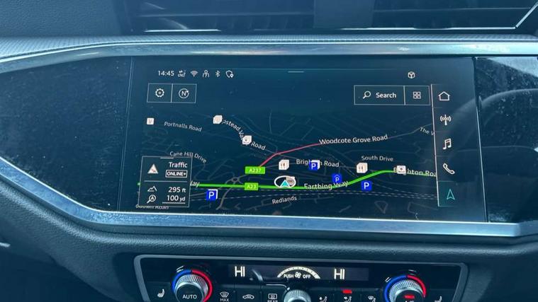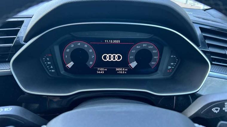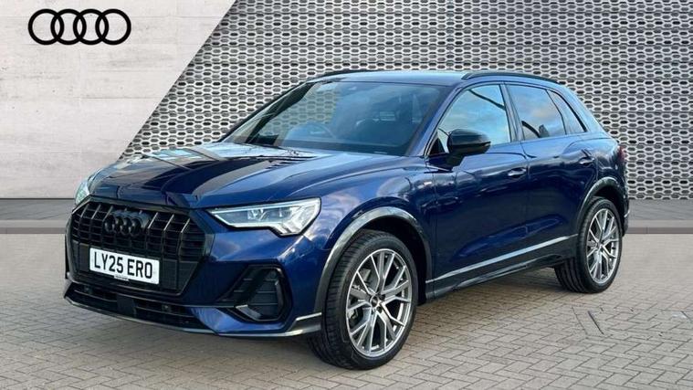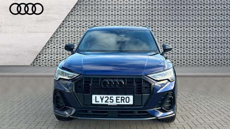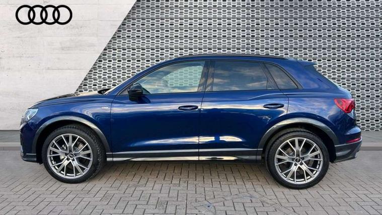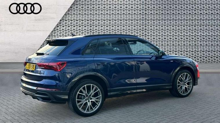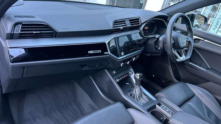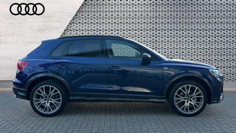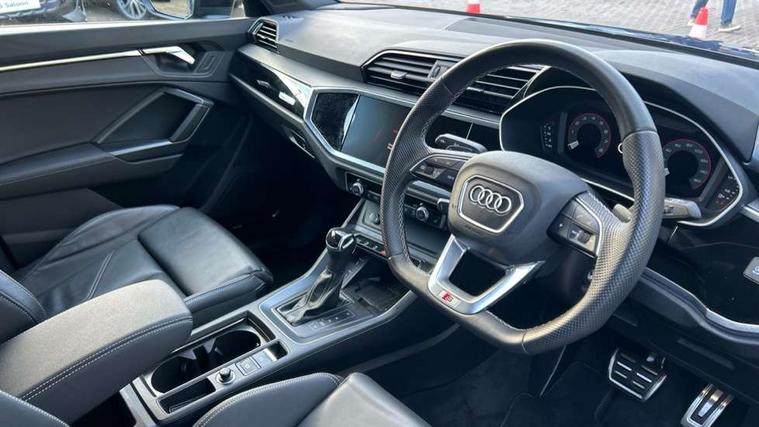 Amazon alexa Integration, Audi connect safety and service, Audi drive select, Audi lane departure warning, Audi Virtual Cockpit - 10.25" display, Bluetooth interface, Camera based traffic sign recognition, Distraction and Fatigue warning, Legal emergency call, MMI Navigation Plus with high resolution 10.1 inch touchscreen colour display, Power operated tailgate, Progressive steering, Service interval indicator, Smartphone interface includes wireless Apple carplay/Android Auto, Start stop system with recuperation, Voice control system with natural language interaction, Sports suspension, 2 USB-C ports with charge and data functions, 6 passive loudspeakers, DAB digital radio module, Acoustic windscreen, Audi Beam uses LEDs to project the Audi logo onto the ground as you exit your Q3, Auto dimming door mirrors, Auto dimming frameless rear view mirror, Black roof rails, Electrically folding, adjustable and heated door mirrors with integrated LED side indicators and kerb view function for passenger side, Front and rear electric windows, Front fog lights, Grille vertical bars in aluminium silver/Matt, High gloss black finish B and C pillars, LED Dynamic rear indicators, LED headlights with LED daytime running lights, LED rear lights, LED third brake light, Privacy glass dark tinted rear and rear-side windows (from B-pillar backwards), Rain and light sensors, Rear diffuser grille in grained matt black, Rear diffuser strip in matt anthracite black, Rear side wing doors, Rear wiper, S line bumpers in contrasting Manhattan grey, Variable front intermittent wipers, 12V socket in rear centre console, 3 seat bench in 2nd row, 40:20:40 folding with manual adjustment for 60:40 forwards/backwards position and backrest angle, Adjustable rear seat bench/backrest with centre armrest and cupholder, Black cloth headlining, Dual zone electronic climate control, Electric lumbar support, Front and rear black floor mats with contrast stitching in rock grey, Front and rear headrests, Front centre armrest, Height and reach adjustable steering wheel, Illuminated door sill trims with S logo, ISOFIX child seat mounting for front passenger with airbag deactivation and outer rear seat including top tether attachment point for outer rear seats, Manual front seats with height adjustment, Perforated leather gearknob, Single front passenger seat, Stainless steel luggage compartment sill finisher, Stainless steel pedals, Twin leather upholstery with front sport seats + S embossing, Black styling pack - Q3, Non smoking pack - Q3, 3x3 point rear seatbelts, 6 airbags - Driver, front passenger, curtain and side windows, Audi pre-sense front with pedestrain and cyclist recognition, Electrically operated child locks on rear doors, Electromechanical parking brake, Electronic stabilisation control including ABS, ASR and EDL, Front seatbelt reminder, Hill descent control, Hill hold assist, Pre sense basic, Seatbelt monitoring, Tyre pressure warning, Warning triangle and first aid kit, Anti theft wheel bolts, Immobiliser, Remote central locking, Thatcham approved category 1 anti theft alarm, Aluminium look interior elements, Detail dashboard around MMI touch colour display in glass look, black with surround in aluminium look, Leatherette door armrest, Piano black inlay,