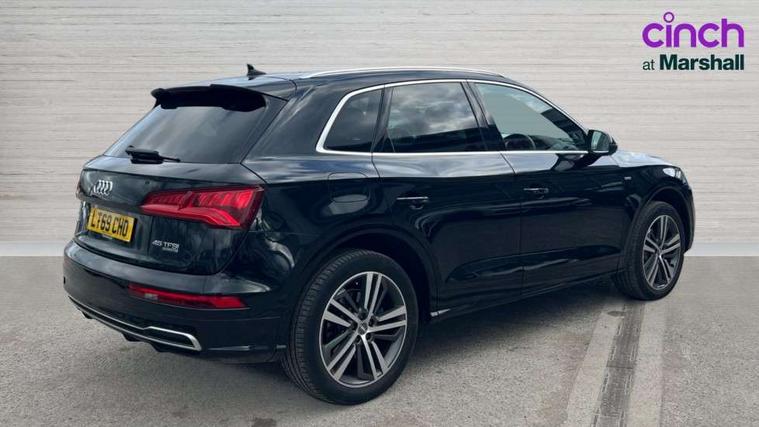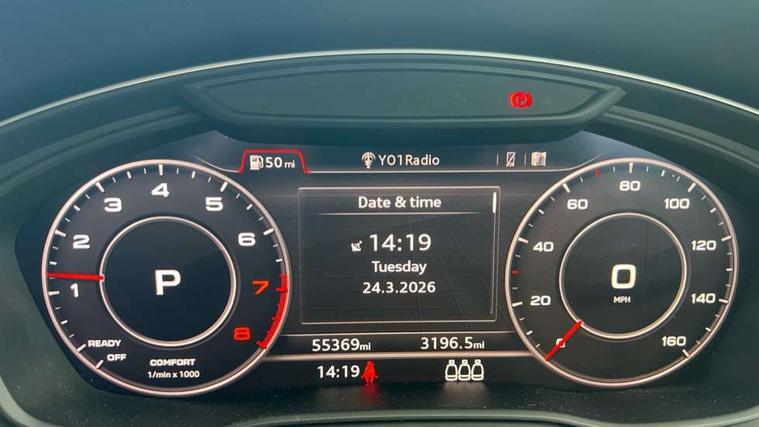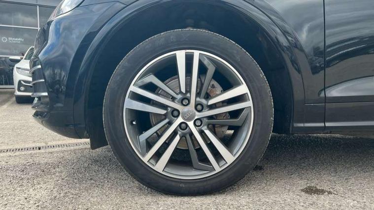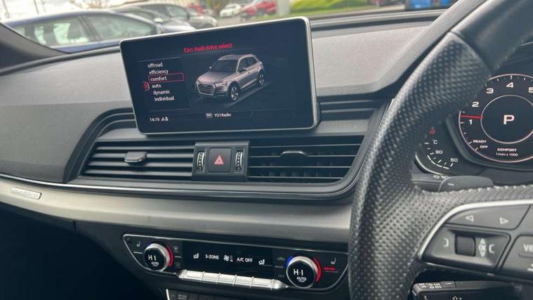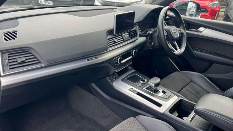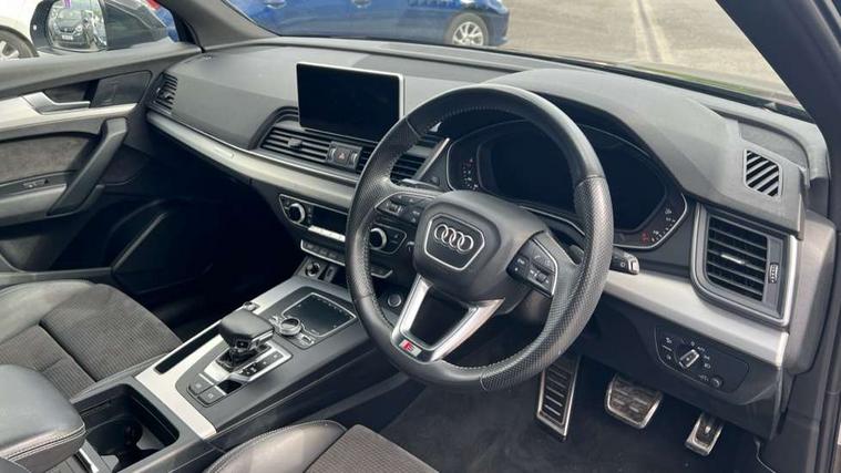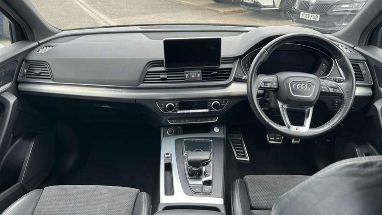7" Colour driver information system, Audi connect safety and service (e-call), Audi drive select, Audi parking system plus with front and rear sensors, Audi Pre sense collision avoidance, Audi smartphone interface, Automatic start-stop system with coasting functionality and efficiency programme, Cruise control + speed limiter, Electro - mechanical power assisted steering, MMI Navigation, Mobile telephone preparation - bluetooth interface, Power tailgate, Service interval indicator, Voice control system, Dynamic suspension, Quattro on demand, 2x SD card slot, CD player, DAB Digital radio, MMI radio plus with 7" colour MMI screen and MMI controller, Acoustic windscreen, Air inlets in matt titanium black with blades in matt aluminium silver, Aluminium roof rails, Auto dimming rear view mirror, Automatic headlight levelling, Body colour bumpers, Body colour door mirrors, Body colour rear diffuser with matt aluminium silver surrounds, Body colour S Line side skirts, Body colour underbody protection, Chrome exhaust tailpipe, Electric adjustable/heated/folding door mirrors, Front and rear electric windows, High beam assistant, LED headlights with LED rear lights + dynamic rear indicators, Light and rain sensor for auto activation of lights and windscreen wipers, Loading sill protector in stainless steel, Privacy glass with front acoustic glazing, Rear wiper, S front and rear bumpers, S Line badges on the front wings, S Line rear spoiler, Twilight grey matt radiator grille with matt aluminium horizontal chrome struts, 2 x USB charging port with aux input socket, 3 rear headrests, 40:20:40 split folding rear seat with rear centre armrest, Black cloth headlining, Contrast stitching on seats, steering wheel and gear lever gaiter, Deluxe 3 zone electronic climate control, Front centre armrest, Front sport seats with S embossed logo, Front/rear floor mats, Heated front seats, Height adjustable front head restraints, Height/reach adjustable steering column, Illuminated door sill trims with S logo, ISOFIX child seat mounting and top tether, Luggage compartment carpet, Manual seat adjustment with 4-way electric lumbar support, Perforated leather gearknob, Removable luggage compartment floor, Stainless steel pedals, Sunvisors with vanity mirrors, Tool kit, Trunk roller cover, High gloss pack - Q5, LED interior light pack - Q5, Non Smokers pack, 3 point seatbelts on all seats, 6 airbags - Driver, front passenger, curtain and side airbags, Electromechanical parking brake, Electronic stabilisation control including ABS, ASR and EDL, Front passenger airbag deactivation, Hill descent control, Hill hold assist, Multi collision brake assist, Pop-up bonnet for pedestrian protection, Pre sense city, Seat belt force limiter, Seatbelt monitoring, Tyre pressure warning, Warning triangle and first aid kit, Anti theft alarm, Anti-theft wheel bolts, Keyless Go access/ignition system, Remote central locking, Matt brushed aluminium inlays,