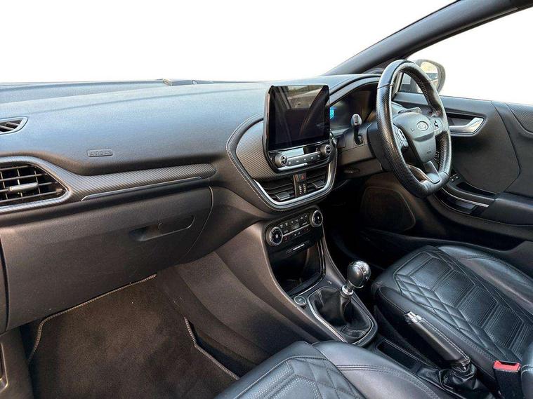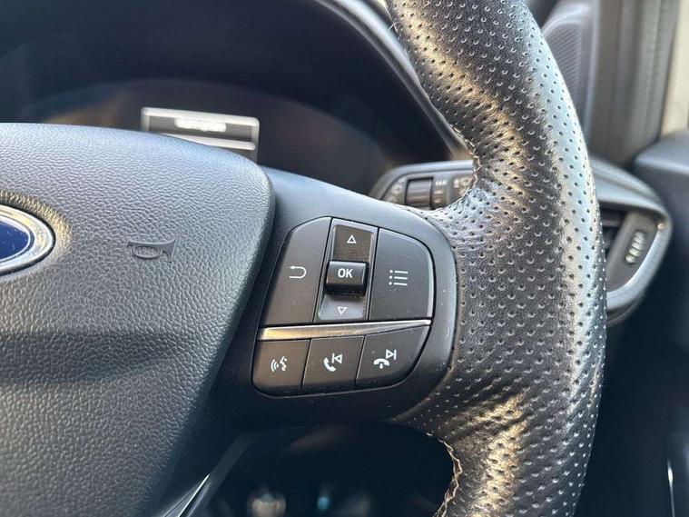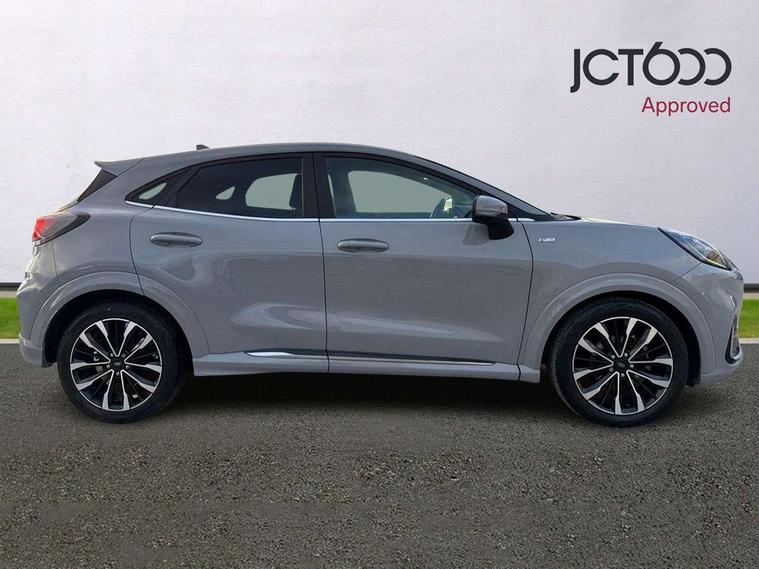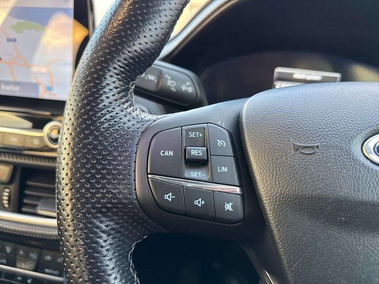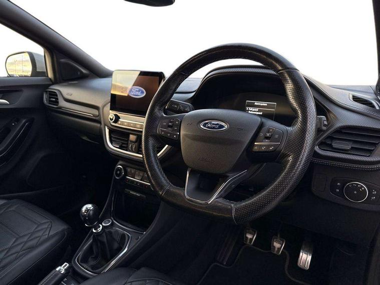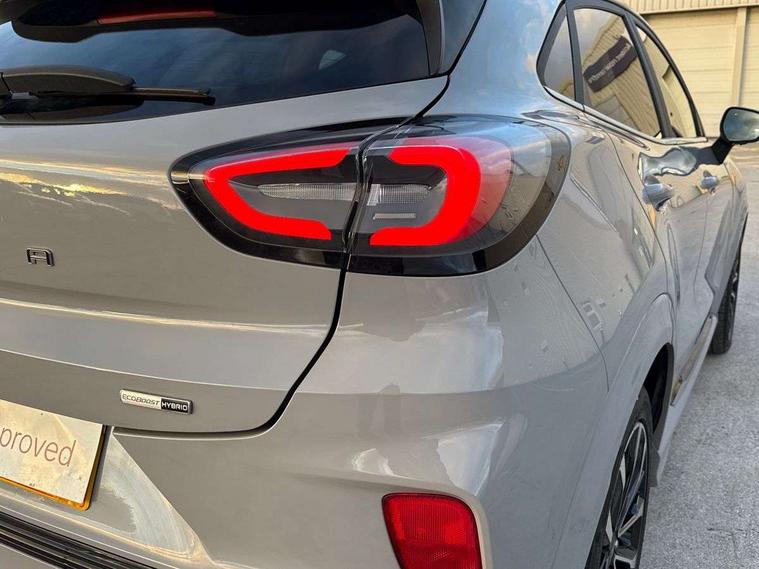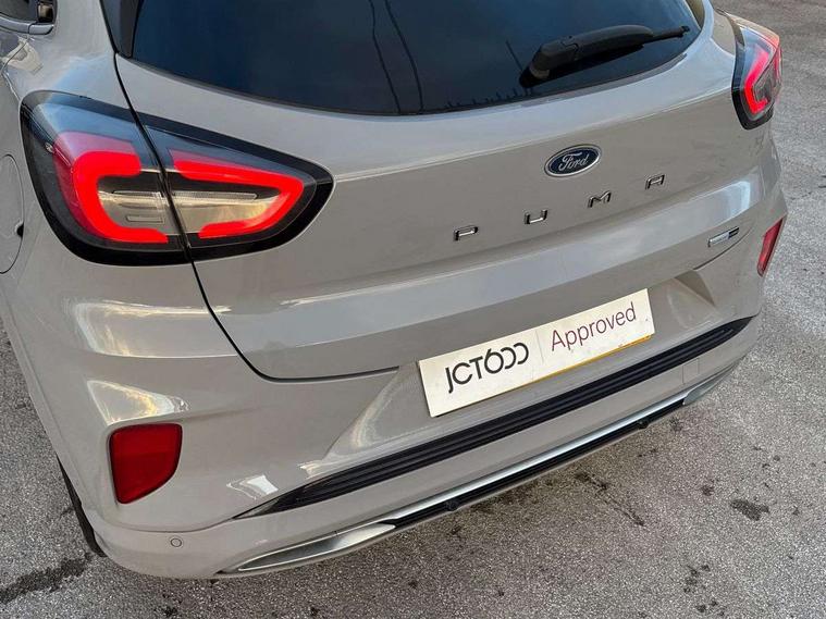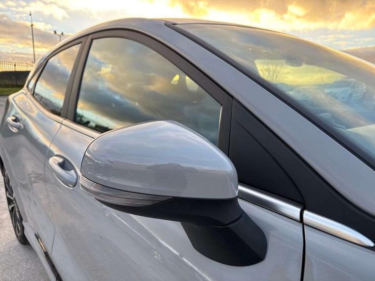Ford easy fuel, Full digital 12.3" instrument cluster, Lane keeping aid with lane departure warning, Power assist steering, Rear parking sensor, Selectable drive modes(Normal, Eco, Sport, Slippery and Trail), Wireless charging pad, Automatic headlights with rain sensing wipers and auto high beam, Body coloured door mirrors, Bodyside chrome styling, Fixed LED headlamps, Front fog lights with cornering lights and LED rear lamps, Gloss black with chrome elements on front and rear bumpers, High chrome waistline, LED daytime running lights, Power foldable heated door mirrors with puddle lamps, Privacy glass to side rear windows and tailgate glass, Quickclear heated windscreen, Rear wiper, ST-Line body kit with large rear spoiler wth sports suspension, Unique Vignale style upper grille and surround, Alloy sports pedals, Centre console with armrest and stowage, Ford megabox extended bootspace, Front and rear floor mats, Front and rear head restraints, Lumbar massage for driver and passenger, Manual air conditioning, Perforated leather flat bottomed steering wheel with metal grey stitching, Premium leather upholstery, Premium sensico wrapped instrument cluster, B&O Premium Audio system + Ford SYNC 3 navigation pack - Puma, Comfort pack - Puma, 3 rear seatbelts, Electronic stability control (ESC) and hill start assist, Pre-collision assist with autonomous emergency braking, pedestrian/cyclist detection & post-collision braking, Tyre pressure monitoring system (TPMS), Thatcham alarm, Carbon look interior deco spears,