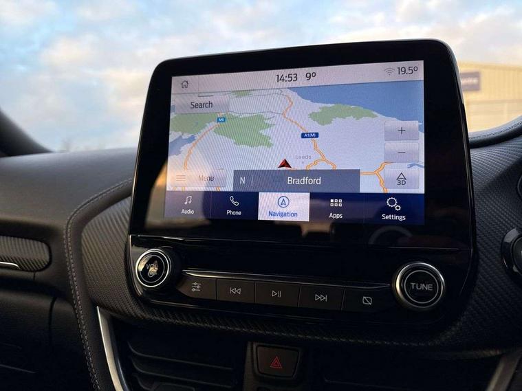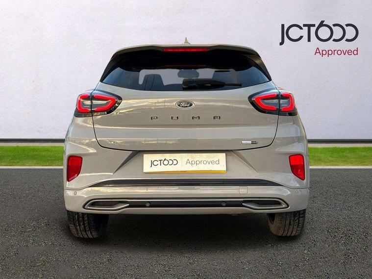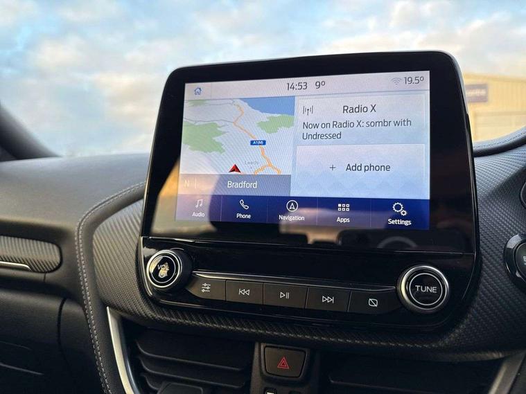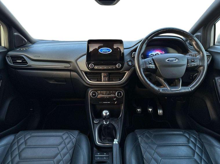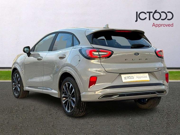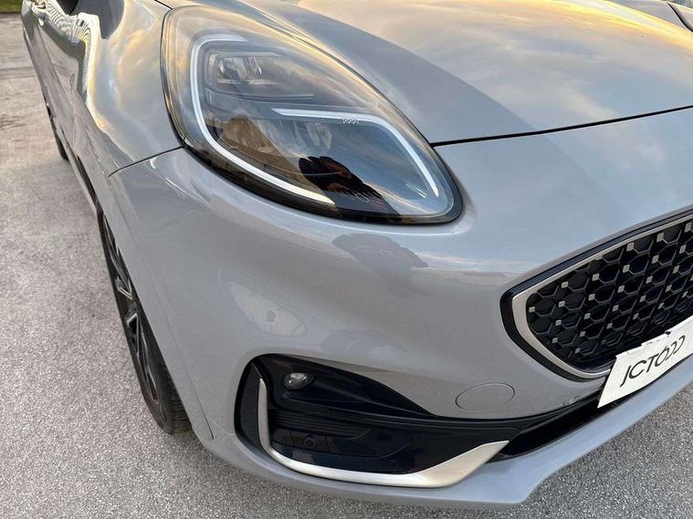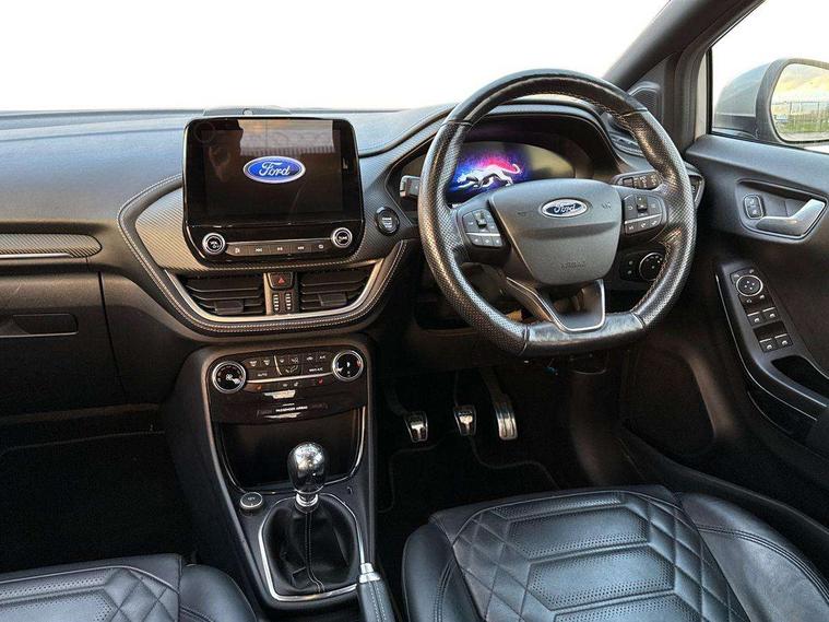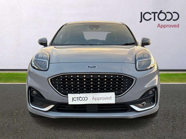 Ford easy fuel, Full digital 12.3" instrument cluster, Lane keeping aid with lane departure warning, Power assist steering, Rear parking sensor, Selectable drive modes(Normal, Eco, Sport, Slippery and Trail), Wireless charging pad, Automatic headlights with rain sensing wipers and auto high beam, Body coloured door mirrors, Bodyside chrome styling, Fixed LED headlamps, Front fog lights with cornering lights and LED rear lamps, Gloss black with chrome elements on front and rear bumpers, High chrome waistline, LED daytime running lights, Power foldable heated door mirrors with puddle lamps, Privacy glass to side rear windows and tailgate glass, Quickclear heated windscreen, Rear wiper, ST-Line body kit with large rear spoiler wth sports suspension, Unique Vignale style upper grille and surround, Alloy sports pedals, Centre console with armrest and stowage, Ford megabox extended bootspace, Front and rear floor mats, Front and rear head restraints, Lumbar massage for driver and passenger, Manual air conditioning, Perforated leather flat bottomed steering wheel with metal grey stitching, Premium leather upholstery, Premium sensico wrapped instrument cluster, B&O Premium Audio system + Ford SYNC 3 navigation pack - Puma, Comfort pack - Puma, 3 rear seatbelts, Electronic stability control (ESC) and hill start assist, Pre-collision assist with autonomous emergency braking, pedestrian/cyclist detection & post-collision braking, Tyre pressure monitoring system (TPMS), Thatcham alarm, Carbon look interior deco spears,