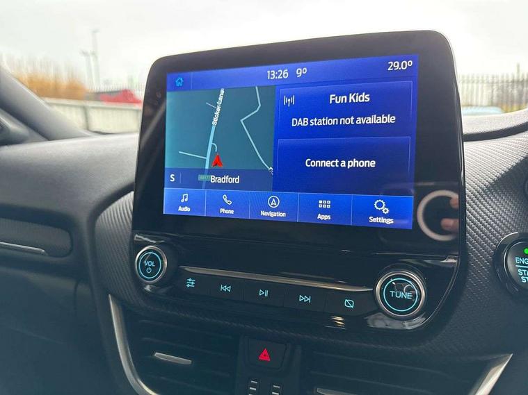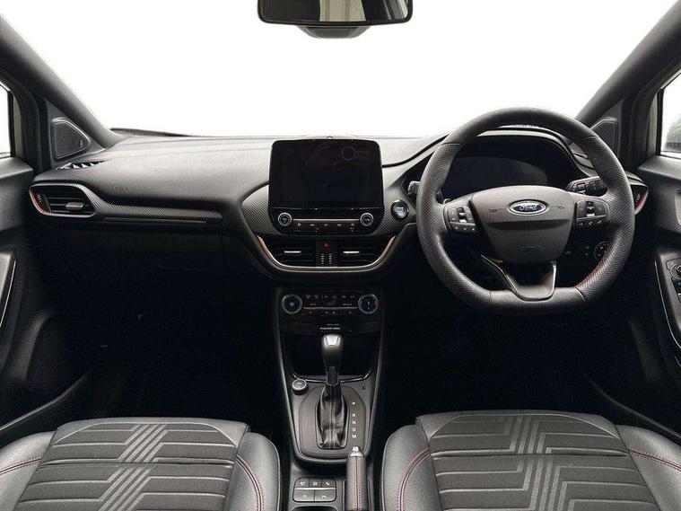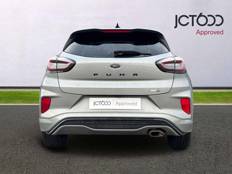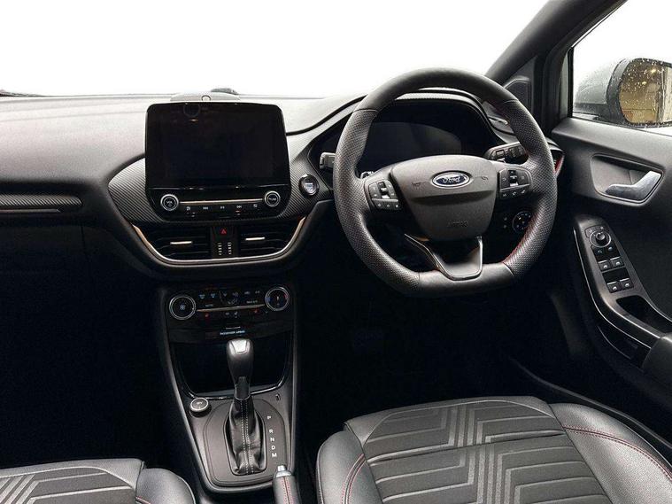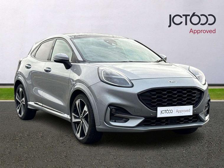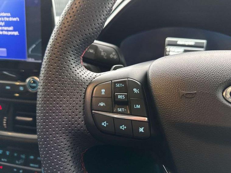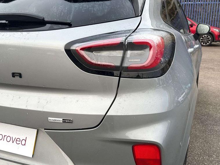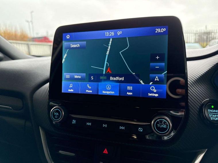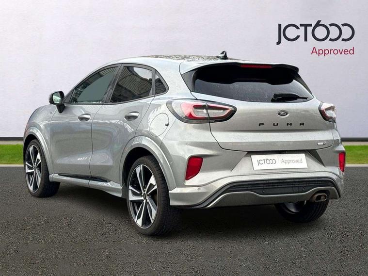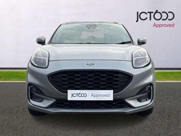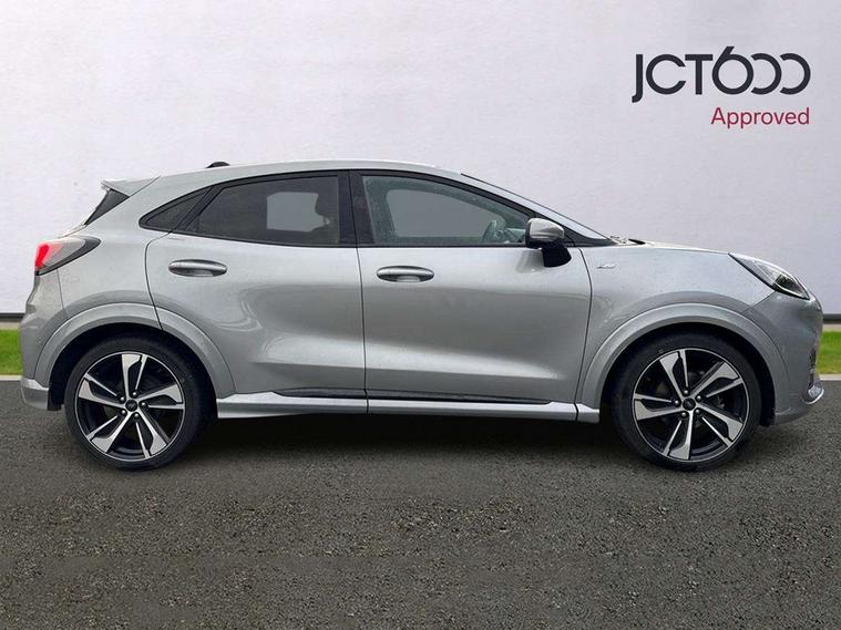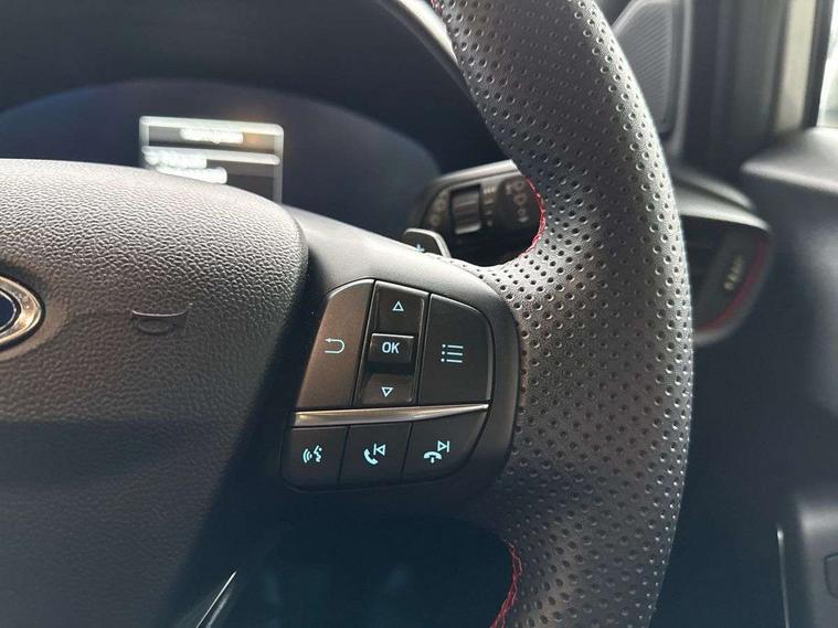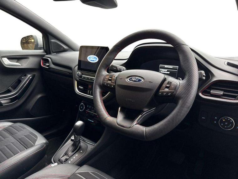 Ford easy fuel, Full digital 12.3" instrument cluster, Lane keeping aid with lane departure warning, Power assist steering, Power start button, Rear parking sensor, Selectable drive modes(Normal, sport, Eco, trail, slippery), Wireless charging pad, Automatic headlights with rain sensing wipers and auto high beam, Body coloured door mirrors, Front fog lights with cornering lights and LED rear lamps, Power foldable heated door mirrors with puddle lamps, Privacy glass to side rear windows and tailgate glass, Quickclear heated windscreen, Rear wiper, ST-Line body kit with large rear spoiler wth sports suspension, Centre console with armrest and stowage, Driver and passenger seat lumbar and height adjust, Ford megabox extended bootspace, Front and rear floor mats, Front and rear head restraints, Manual air conditioning, Sensico partial premium upholstery, Wireless charging pad with electronic air temperature control (EATC), B&O Premium Audio system + Ford SYNC 3 navigation pack - Puma, 3 rear seatbelts, Electronic stability control (ESC) and hill start assist, Pre-collision assist with autonomous emergency braking, pedestrian/cyclist detection & post-collision braking, Tyre pressure monitoring system (TPMS), Thatcham alarm, Carbon look interior deco spears,