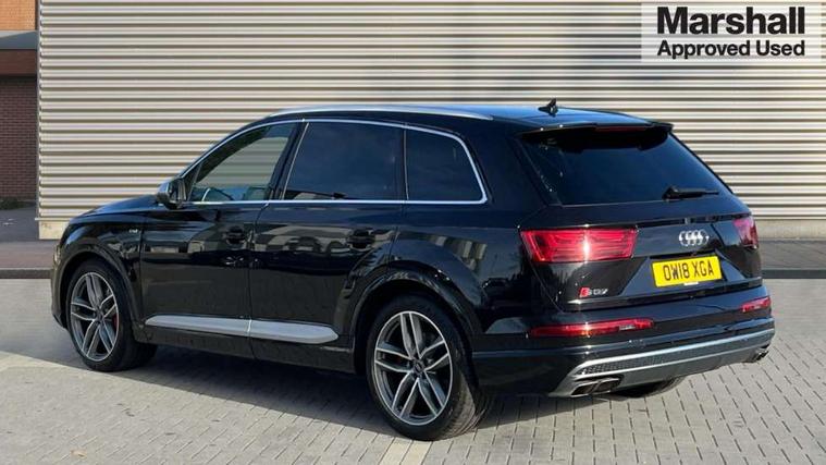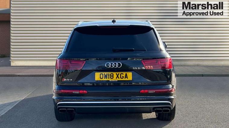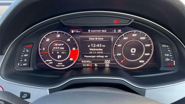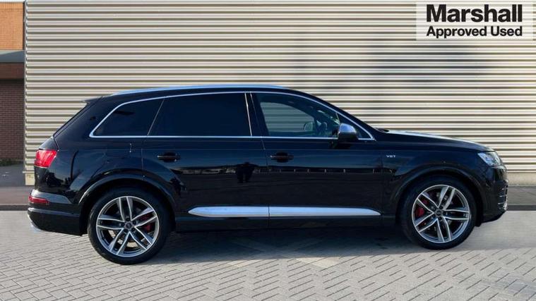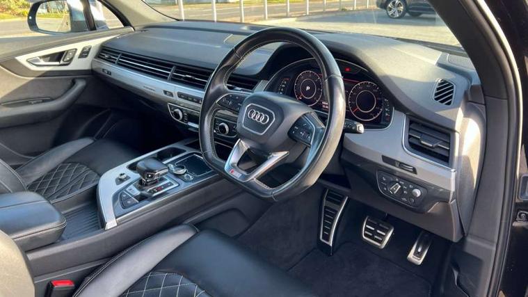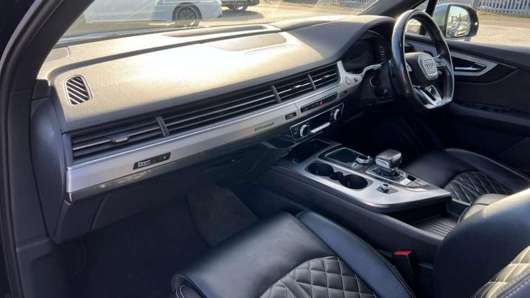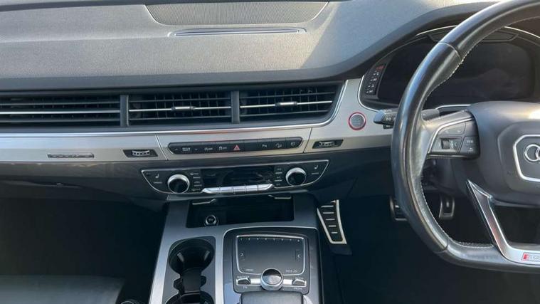 Audi drive select, Audi smartphone interface, MMI - Multi Media Interface control system, MMI navigation plus with touch and 8" colour display, DVD, SD card reader, 10GB music storage, Mobile phone preparation with bluetooth interface, Remote electric boot opening/closing, Service interval indicator, Servotronic speed related PAS, Speed limiter, Voice control system, 85 litre fuel tank, Adaptive air suspension, 2 USB ports, Audi music interface, Aux-in socket, DAB digital radio module, MMI radio plus, Acoustic windscreen, Active exhaust sound system, Aluminium effect front grille, Audi Beam uses LEDs to project the Audi Sport logo, Auto dimming rear view mirror, Body coloured bumpers, Dual branch oval twin exhaust tailpipes, Dynamic rear indicators, Electric front+rear windows, Headlight washers, High beam assist, LED daytime running lights, LED tail lights, Loading sill protector in stainless steel, Platinum grey front lip spoiler, Rain and light sensors, Rear wiper, Roof spoiler, S body styling, 2 cupholders in front centre console, 35/30/35 split fold 2nd row seats, 4 way electrically adjustable lumbar support for drivers seat, 4 way electrically adjustable lumbar support for front passenger seat, Aluminium scuff plates, Door sill trims with S line logo, Electric 3rd row 50/50 split/fold, Electric adjustable front seats, Four zone electronic climate control, Front ashtray and cigar lighter, Front centre comfort armrest with storage + cupholders, Front head restraints, Front/rear floor mats, Gearshift paddles, Heated front seats, ISOFIX on front passenger and rear outer seats, Leather gear knob, Rear centre armrest with 2 cupholders, Rear headrests, Stainless steel pedals, Sunvisors with illuminated vanity mirrors, Top tether anchor plate for isofix child seat, Interior light pack - Q7, 3 point seatbelts on all seats, ABS+Electronic Brake force Distribution, Curtain airbags, Driver and passenger airbags, EDL + ASR, Electrically operated child locks on rear doors, Electromechanical parking brake, ESP, Front passenger airbag deactivation, Front side airbags, Hill descent control, Hill hold assist, Seatbelt warning, Traction control, Tyre pressure monitoring system, Warning triangle and first aid kit, Alarm with interior monitoring, Immobiliser, Keyless Go access/ignition system, Locking wheel bolts, Remote central locking, Chrome door inserts, Tool kit, Tyre repair kit,