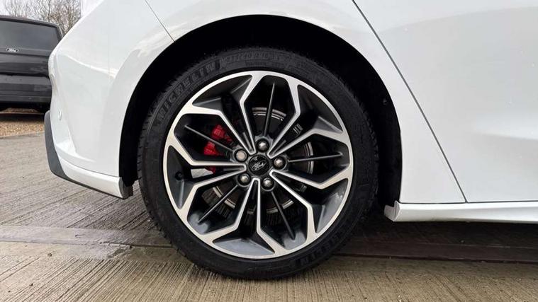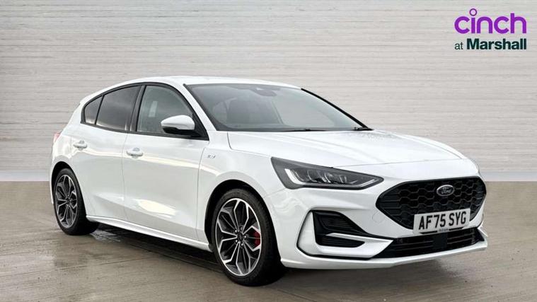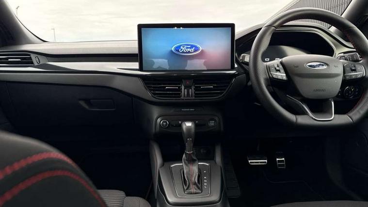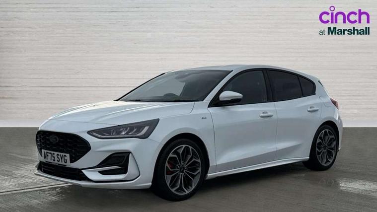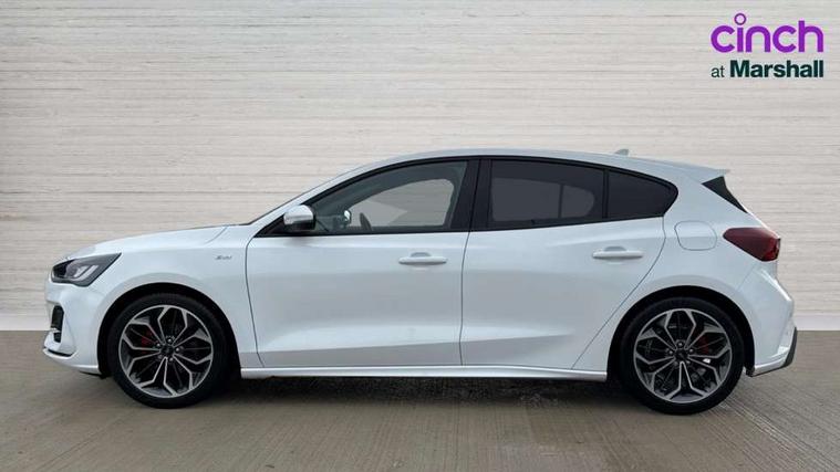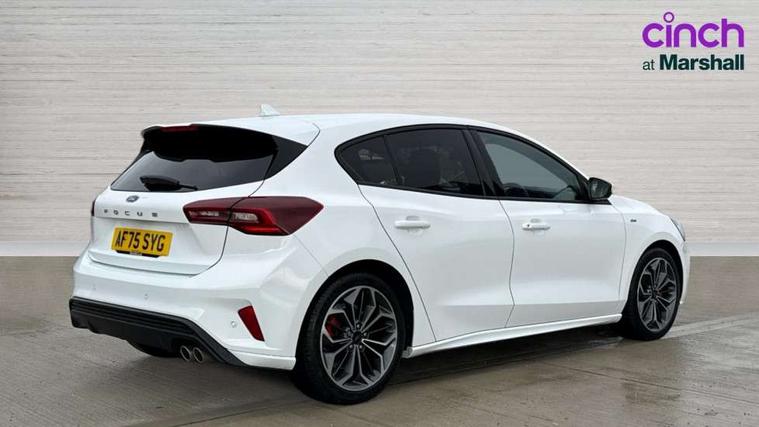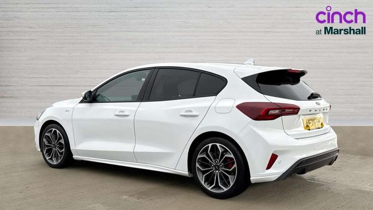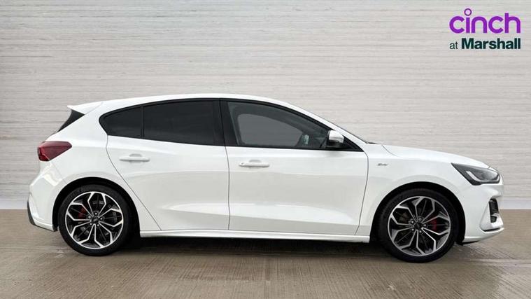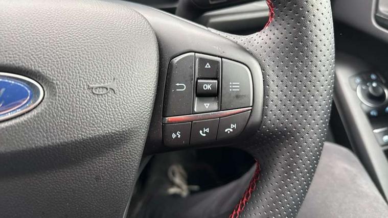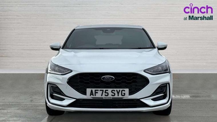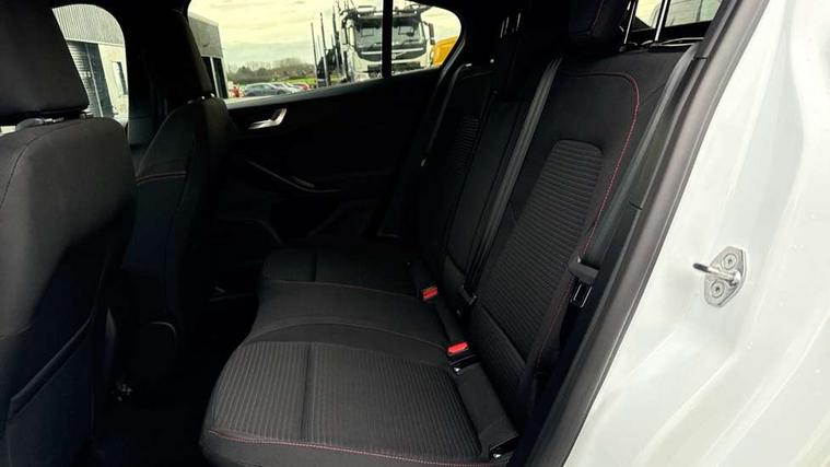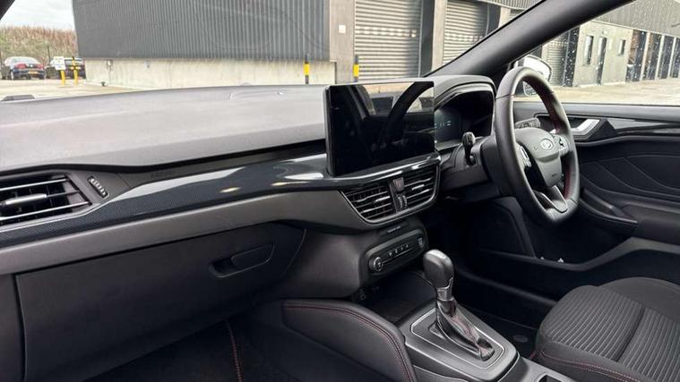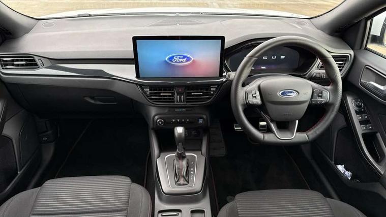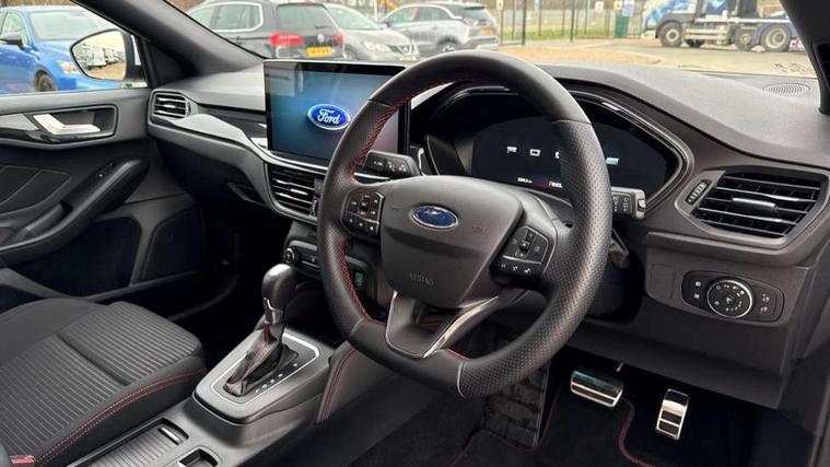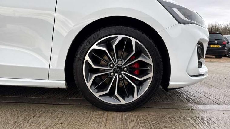 12.3" Digital instrument cluster, Bluetooth system, Digital clock, Easy fuel capless refuelling system, Eco mode, Ford SYNC4 Nav with 13.2'' touchscreen, DAB, Emergency Assistance, Apple Carplay & Android Auto, B&O Premium Audio with 10 speakers, FordPass Connect, Lane keeping system - lane keeping alert and lane keeping aid, PAS, Rev counter, Selectable drive mode, Service interval indicator, Trip computer, Wireless charging pad, Sports tuned suspension, 2 USB ports, Auto headlamps (on/off), Body coloured door handles, Electrically operated front and rear windows with one touch opening and closing, Electrically operated heated power fold door mirrors with puddle lamp with side indicators, Front variable intermittent wipers with electric wash, Heated rear window, LED daytime running lamp, LED rear lamps, LED third brake light, Polished twin tailpipe, Privacy glass, Quickclear heated windscreen, Rain sensor, Rear side wing doors, Tailgate wash/wipe, Unique ST-Line grille, full bodystyling kit, and large body coloured rear roof spoiler, 3 rear headrests, 3 seat bench in 2nd row, Dual zone electronic air temperature control, Full sensico premium upholstery, Height adjustable front headrests, Isofix child seat preparation, Load through ski hatch, Manual 2-way passenger seat adjust, Power 4-way driver seat adjust, with power lumbar adjust, Reach + rake adjustable steering column, Single front passenger seat, ST-Line Design pack - Focus, Winter pack - Focus, 3x3 point rear seatbelts, ABS+Electronic Brake force Distribution, Auto hold function, Driver airbag, EDL traction control, Electronic parking brake, Electronic stability control, Front and rear seatbelt reminder, Front inertia reel height adjustable seatbelts with pre-tensioners, Front passenger airbag, Front side airbags, Passenger airbag deactivate switch, Post collision braking, Pre collision assist with autonomous emergency braking and pedestrian/cyclist detection, Remote/power child rear door locks, Side curtain airbags, Three rear inertia reel lap/diagonal seatbelts, Tyre pressure monitoring system, Keyless entry and keyless start, MyKey system, Remote central locking & engine immobiliser, Thatcham alarm with power door dead locks, 18" 5x3 spoke pearl grey high gloss machined finish alloy wheels with mini spare wheel,