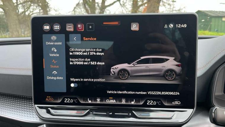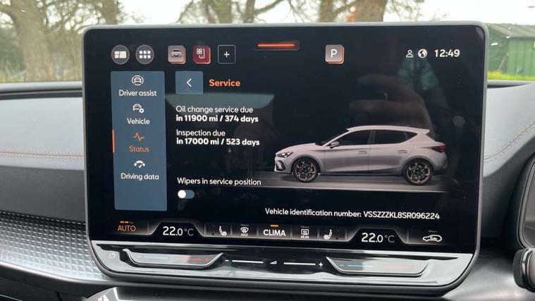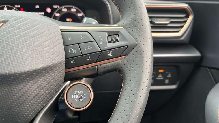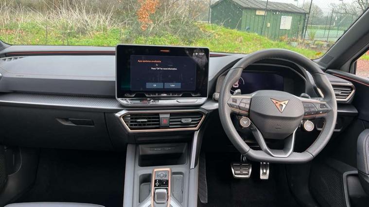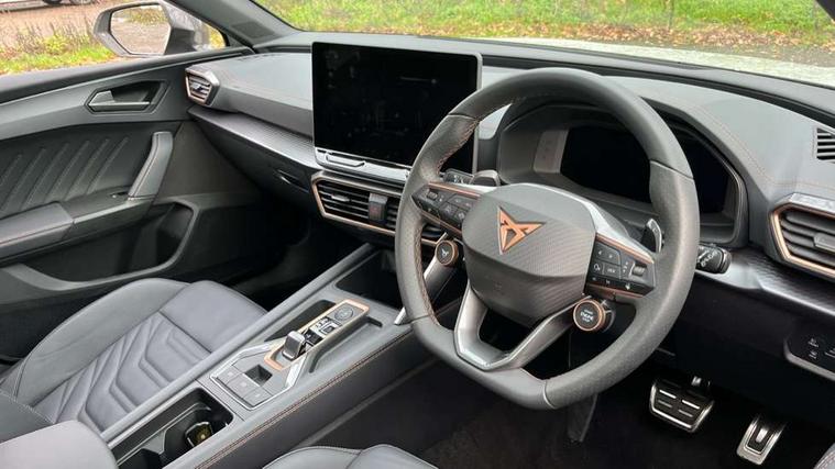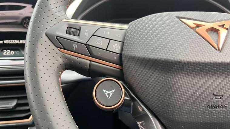 Adaptive cruise control with follow-to-stop and speed limiter, CUPRA drive profile selection with (Comfort/Sport/Individual), throttle response and gearshift mode, Digital cockpit, Dynamic road sign display, E-call, Four x USB Type C ports (2 in front and 2 in rear), Front and rear parking sensors, Front assist with forward collision warning braking reaction to vehicles, pedestrians and cyclists, Full link smartphone integration with Mirror Link, wireless Apple CarPlay and wired Google Android Auto, Intelligent park assist, Lane change assist with emergency assist, Lockable tailgate, Rear view camera, RPM, trip computer, outside temp gauge, instrument light brightness, low fuel warning light, lights on reminder, gearshift indicator, Service interval indicator, Side and exit assist, Start/stop system with regenerative braking, Wireless phone charger, Auxiliary input socket, Auto dimming rear view mirror, Body colour door handles, Body coloured bumpers, Cupra sports bumpers, Dark tinted rear windows, Electric front/rear windows, Electrically adjustable, heated and folding door mirrors, High beam assist, LED front fog lamps with cornering function, LED rear fog lamp, Matrix LED Headlights with variable light distribution, Matrix Beam and Dynamic headlight range control, Rain sensing wipers, Rear side wing doors, Rear wash/wipe, Separate daytime running light with automatic headlight control and coming home feature, Third brake light, Welcome light with logo projector in door mirrors, 12v power supply in centre console, 3 seat bench in 2nd row, 5 headrests, 60/40 split rear bench seat with armrest, Ambient lighting (glovebox, footwell, ambient lighting multicoloured), Black headlining, Cupra sports pedals, CUPRA Supersports, heated steering wheel with satellite buttons, Electrically adjustable driver seat and lumbar support with memory function + manually adjustable passenger seat, Folding boot cover, Front and rear reading lights X 4, Front centre armrest, Heated front seats, Height/reach adjust steering wheel, Illuminated interior front door sills, Interior wraparound lighting, ISOFIX points in outer rear seats with top tether anchorage points, Leather upholstery, Single front passenger seat, Storage pockets on rear of front seats, Sunvisors with illuminated mirror, Three zone climate control, Dynamic and comfort pack - Leon Cupra, Media system plus with 12.9" display + navigation pack - Leon Cupra, 3 point seatbelts on all rear seats, ABS, Brake control system - ESC and brake booster, Child proof door locks, Cupra black brake calipers, Driver and front passenger airbags with front passenger airbag de-activation, front side and curtain airbags, Electronic parking brake, Hill hold control, Pre-crash front and rear seat belt tensioner, window closure and hazard lights, Rear disc brakes, Seat belt reminder for front and rear seats, Tiredness recognition system, Tyre pressure monitoring system, Anti theft alarm system with interior monitoring in cab, backup horn and towing protection, KESSY Advanced - Keyless start, keyless entry, Locking wheel bolts, Chrome and copper interior detailing, 19" Mistral machined R black and silver alloy wheel with 91Y tyres, Breakdown kit, Tool kit,