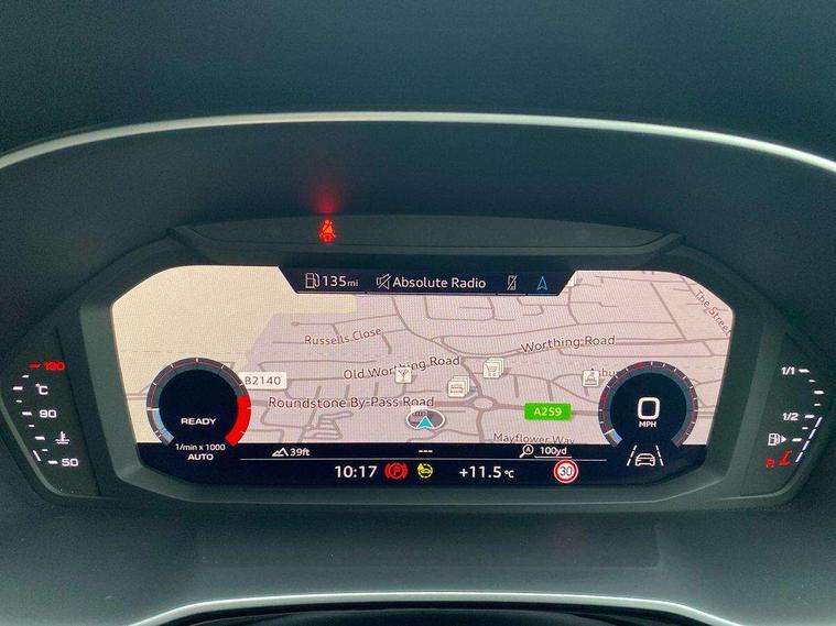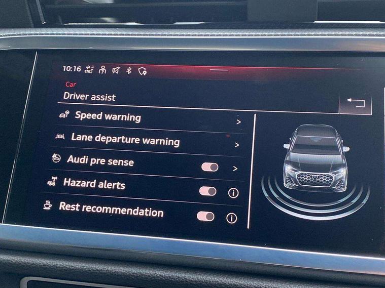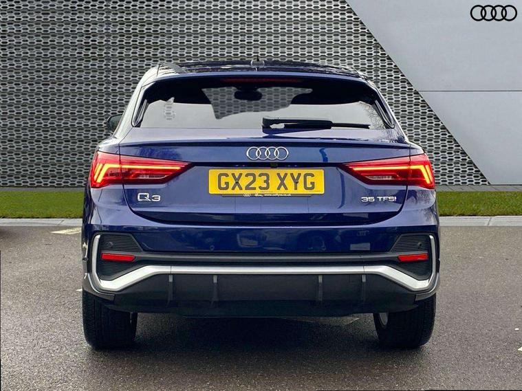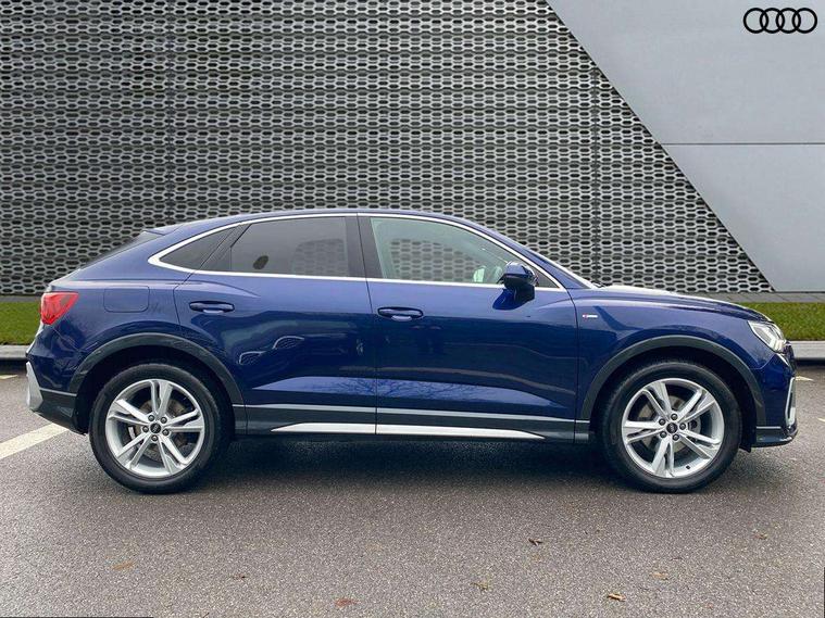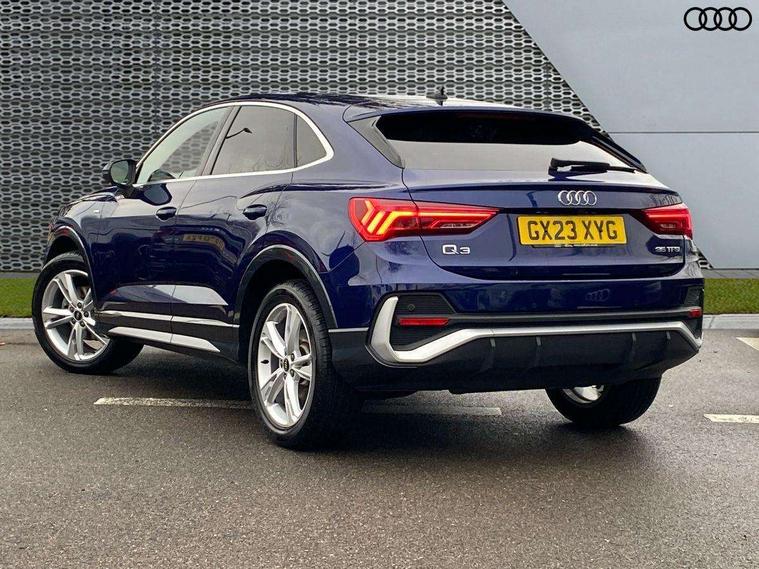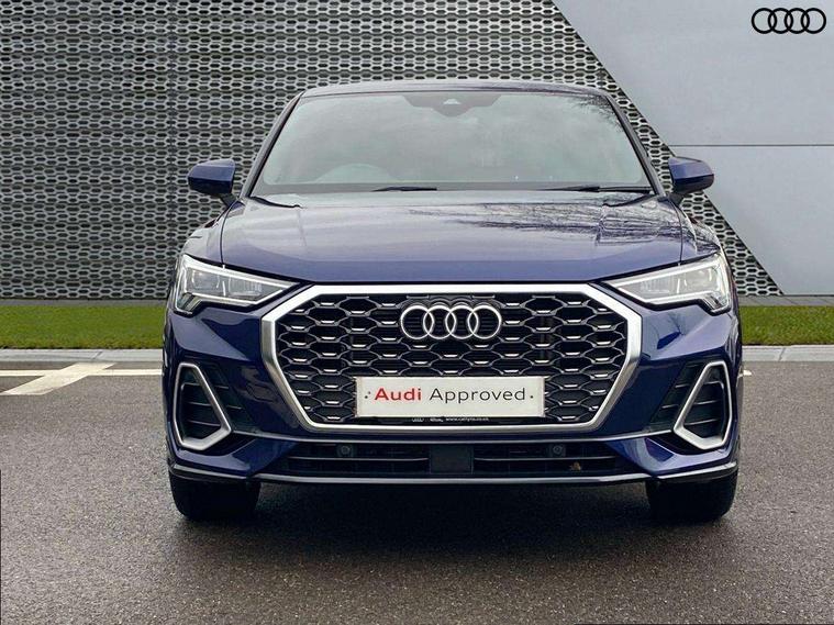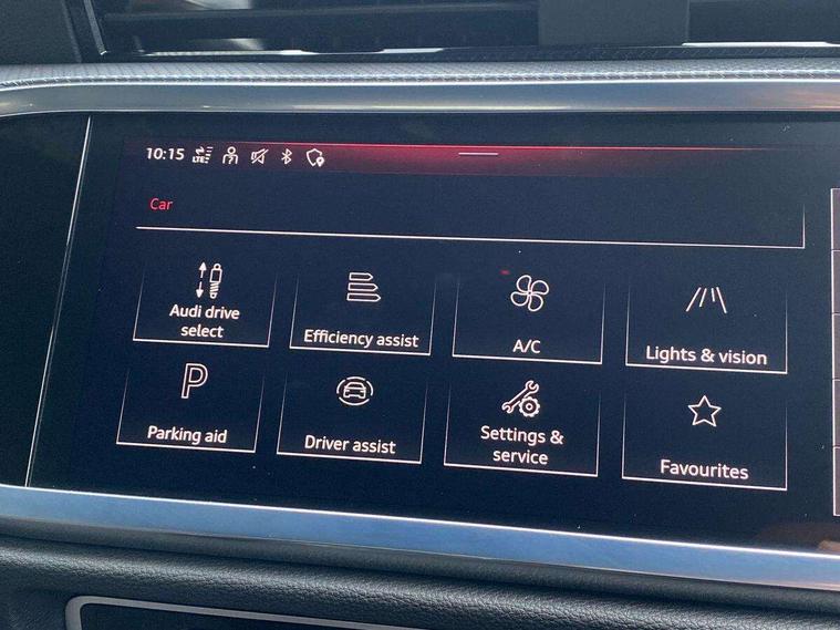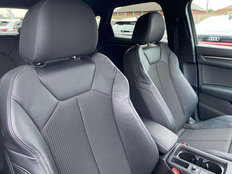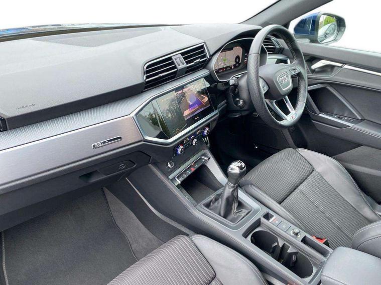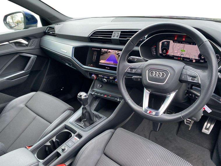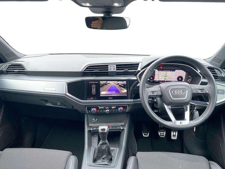 Audi drive select, Audi lane departure warning, Audi Virtual Cockpit - 10.25" display, Bluetooth interface, Camera based traffic sign recognition, Cruise control + speed limiter, Legal emergency call, MMI Navigation Plus with high resolution 10.1 inch touchscreen colour display, Power operated tailgate, Progressive steering, Rear parking sensors, Service interval indicator, Smartphone interface includes wireless Apple carplay/Android Auto, Start stop system with recuperation, Voice control system with natural language interaction, Sports suspension, 2 USB-C ports with charge and data functions, 6 passive loudspeakers, DAB digital radio module, Acoustic windscreen, Aluminium window trim, Auto dimming frameless rear view mirror, Diffuser grille in grained matt black, Diffuser trim in selenite silver, Electrically folding, adjustable and heated door mirrors with integrated LED side indicators and kerb view function for passenger side, Front and rear electric windows, Front fog lights, Front side air inlets in selenite silver, Front underbody protection in manhattan grey paint finish, Grille surround in aluminium silver matt, High gloss black finish B and C pillars, LED Dynamic rear indicators, LED headlights with LED daytime running lights, LED rear lights, LED third brake light, Privacy glass dark tinted rear and rear-side windows (from B-pillar backwards), Radiator grille in anthracite black with inlay in matt aluminium silver, Rain and light sensors, Rear side wing doors, Rear underbody protection in matt black, Rear wiper, S line badges on front wings, S line front and rear bumpers and side skirts in contrasting Manhattan grey paint finish, Side skirt insert in matt Platinium grey, Variable front intermittent wipers, 12V socket in rear centre console, 3 seat bench in 2nd row, 3 spoke leather multifunction steering wheel features S badging and grips in perforated leather with contrast stitching, 40:20:40 folding with manual adjustment for 60:40 forwards/backwards position and backrest angle, Adjustable rear seat bench/backrest with centre armrest and cupholder, Black cloth headlining, Dual zone electronic climate control, Front and rear black floor mats with contrast stitching, Front and rear headrests, Front and rear roof module including reading lights, Front centre armrest, Glove compartment lighting, Height and reach adjustable steering wheel, Illuminated door sill trims with S logo, ISOFIX child seat mounting for front passenger with airbag deactivation and outer rear seat including top tether attachment point for outer rear seats, Luggage compartment light right in white, Luggage compartment sill protection in stainless steel, Manual front seats with height adjustment, Perforated leather gearknob, Single front passenger seat, Stainless steel pedals, Ambient lighting pack - Q3, Non smoking pack - Q3, 3x3 point rear seatbelts, 6 airbags - Driver, front passenger, curtain and side windows, Audi pre-sense front with pedestrain and cyclist recognition, Electrically operated child locks on rear doors, Electromechanical parking brake, Electronic stabilisation control including ABS, ASR and EDL, Front seatbelt reminder, Hill descent control, Hill hold assist, Pre sense basic, Seatbelt monitoring, Tyre pressure warning, Warning triangle and first aid kit, Anti theft alarm, Anti theft wheel bolts, Immobiliser, Remote central locking, Aluminium look interior elements, Black dashboard, Dark matt brushed aluminium inlay, Detail dashboard around MMI touch colour display in glass look, black with surround in aluminium look, Leatherette door armrest,