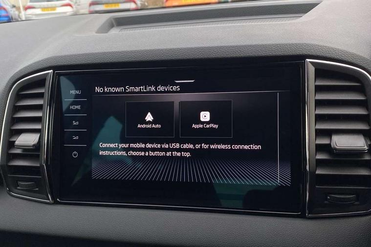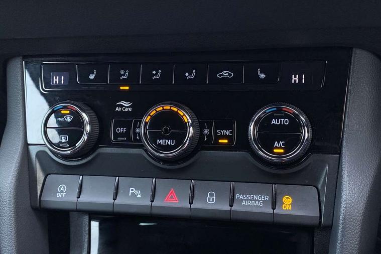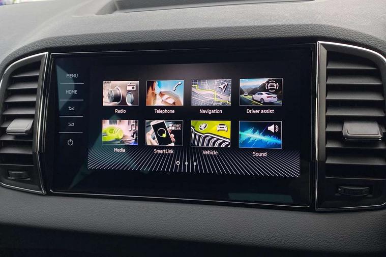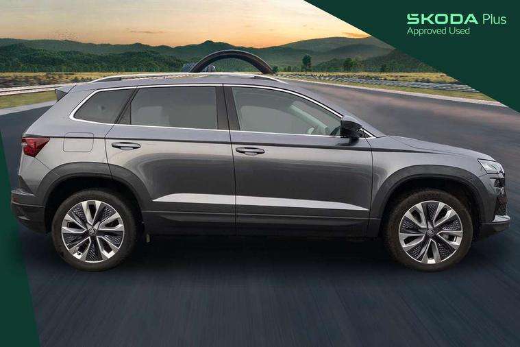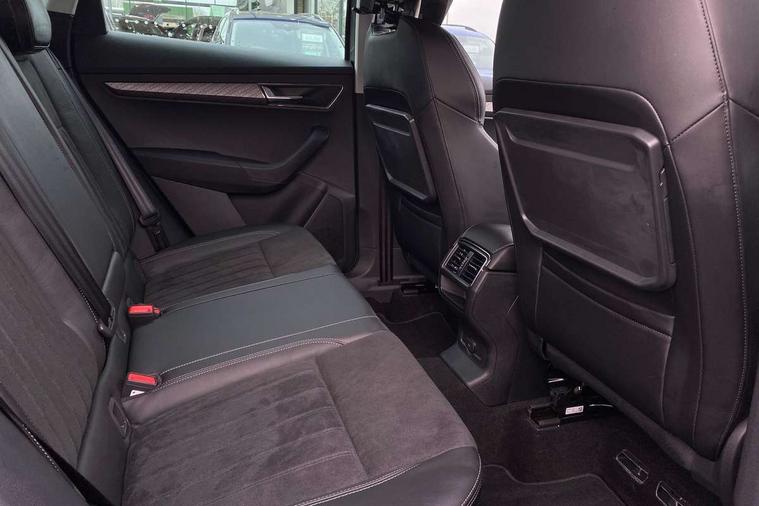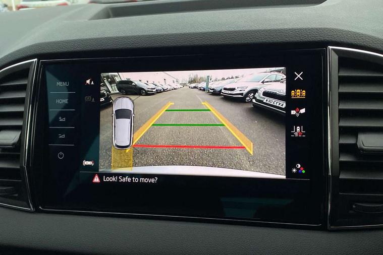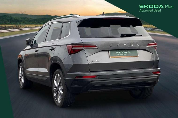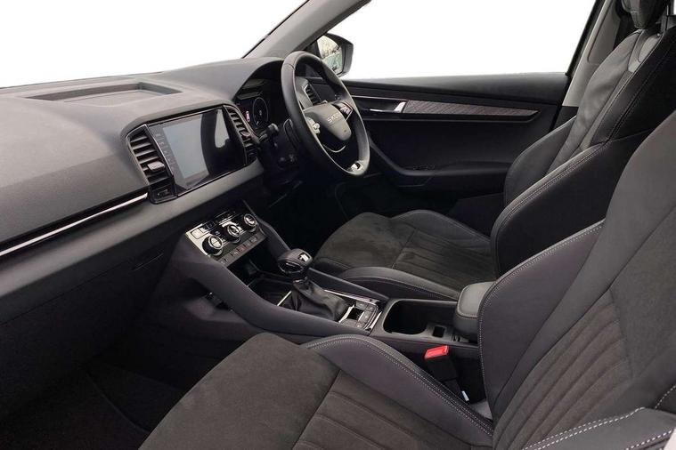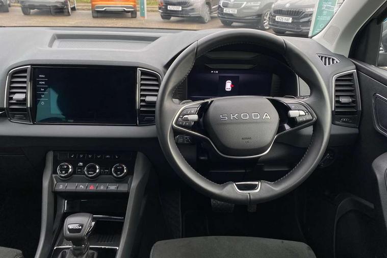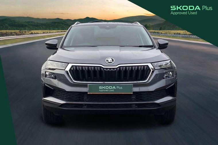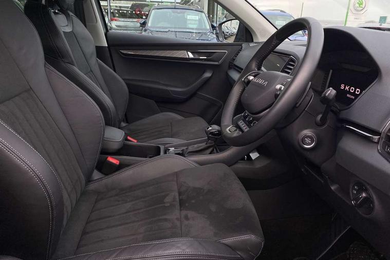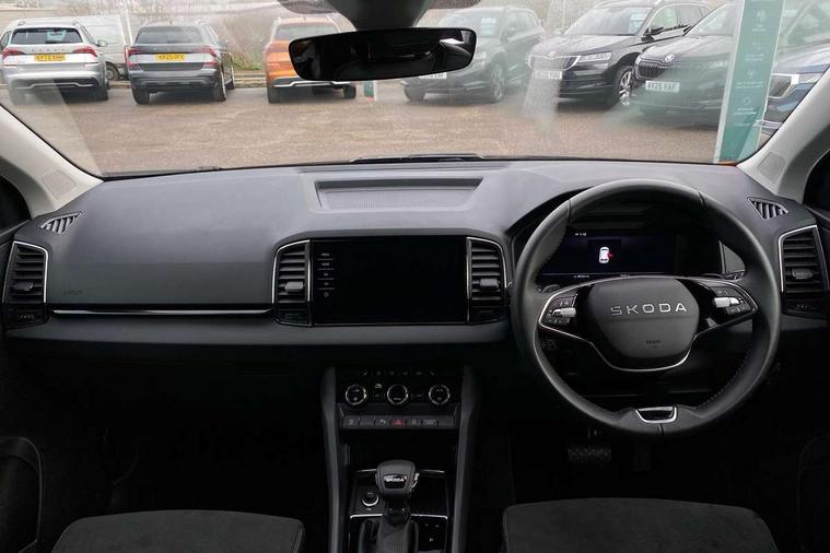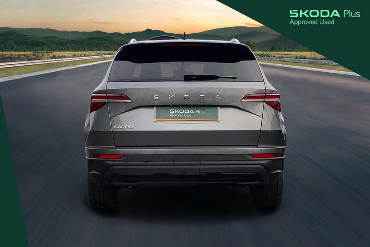 Advanced driver attention and drowsiness monitor, Drive Mode Selection including ECO function, Electro-mechanical PAS, Emergency services call system, Outside temperature gauge, Sensor for driver assistance systems, Service interval indicator, SmartLink wireless for Apple and wired for Android, Start/stop system with regenerative braking, Traffic sign recognition, USB C Port x 2 in front centre console, Virtual Cockpit - 10.25" digital display, Virtual pedal with electrically operated boot door, Wireless smartphone charging, DAB radio with Bluetooth, USB connection, Acoustic glass, Aero front windscreen wipers with intermittent function, Auto dimming rear view mirror with light and rain sensors, Black electric window control buttons, Body colour door mirrors and handles, Electric front and rear windows with child proof lock, Extended rear roof spoiler, Heated rear windscreen, LED daytime running lights, LED rear lights with high functionality welcome effect and dynamic indicators, Light assistant (coming/leaving home/tunnel light), Plastic scuff plates in door apertures, Privacy glass, Rear side wing doors, Rear window wiper with washer system and intermittent control, Safety reflectors on front doors, Third brake light, Unique dark chrome design logo on alloy wheels, 1.5 litre bottle holders in driver and front passenger door panels, 12V socket in boot, 12v socket in front centre armrest with storage compartment and rear air vents, 2 spoke leather heated multifunction steering wheel with DSG paddles, 2 x Tablet holder, 3 rear height adjustable headrests, 3 seat bench in 2nd row, 4 foldable roof handles with rear coat hooks, Black floor carpet, Cargo elements in boot, Chrome inner door handles, Decorative door sills with KAROQ badging, Foldable hooks in the boot, Front head restraints, Height adjustable front three point seats belts with tensioners, Height/reach adjust steering wheel, Ice scraper, Illuminated glovebox, Illuminated luggage compartment, Interior noise suppression, Isofix child seat preparation for front passenger seat, Isofix child seat preparation outer rear, Manual lumbar support for front seats, Pearl grey interior ceiling, Pen holder, Pollen filter, Rear boot cover, Rear package tray, Rear reading lights, Rubbish bin door, Safety vest holder, Single front passenger seat, Skoda lettering on steering wheel, Storage box in upper central dashboard closed, Sunvisors with illuminated vanity mirrors, Textile floor mats, Ticket holder, Columbus pack - Karoq, Design Pack - Karoq, Non Smokers pack, Parking pack - Karoq, Automatic door unlocking in case of crash, Automatic fuel cut off in case of crash, Driver airbag, Electronic parking brake with auto hold function, Emergency rear braking signal, ESC (incl. ABS+MSR+ASR+EDS+HBA+DSR+RBS+MKB), Front side airbags, Head airbags, Hill hold control, Knee airbags, Passenger airbag with switch-off function, Pedestrian monitor, Power operated child safety locks, Seatbelt reminder signalisation and pretensioner for all seats, Three point seatbelts rear, Two tone horn, Tyre pressure monitor, Alarm with interior monitoring, back up horn and tilt sensor with safe function, Electronic engine immobiliser, Keyless entry and start/stop, Remote central locking with 2 remote folding keys, Black centre console, Chrome framed air vents, Satin black dashboard, Anti-theft wheel bolts protection, Breakdown and tool kit,