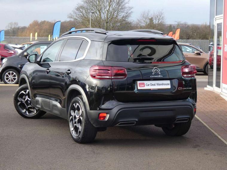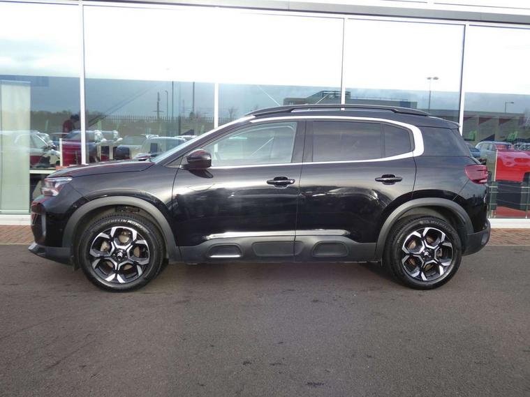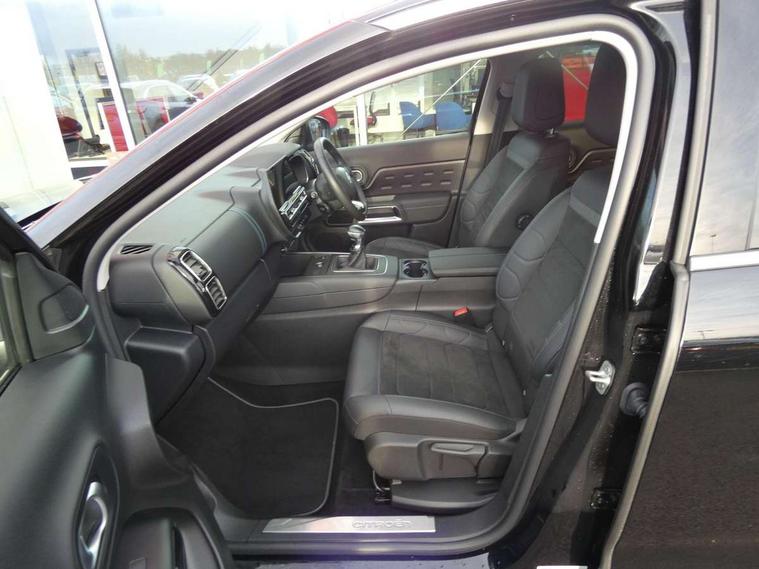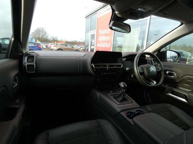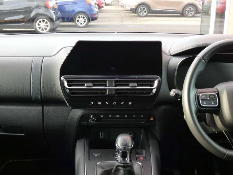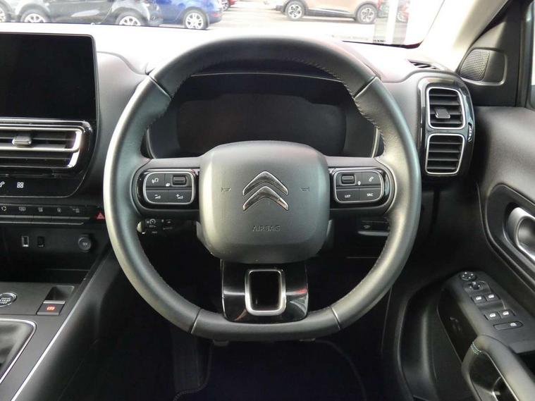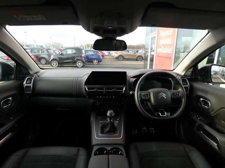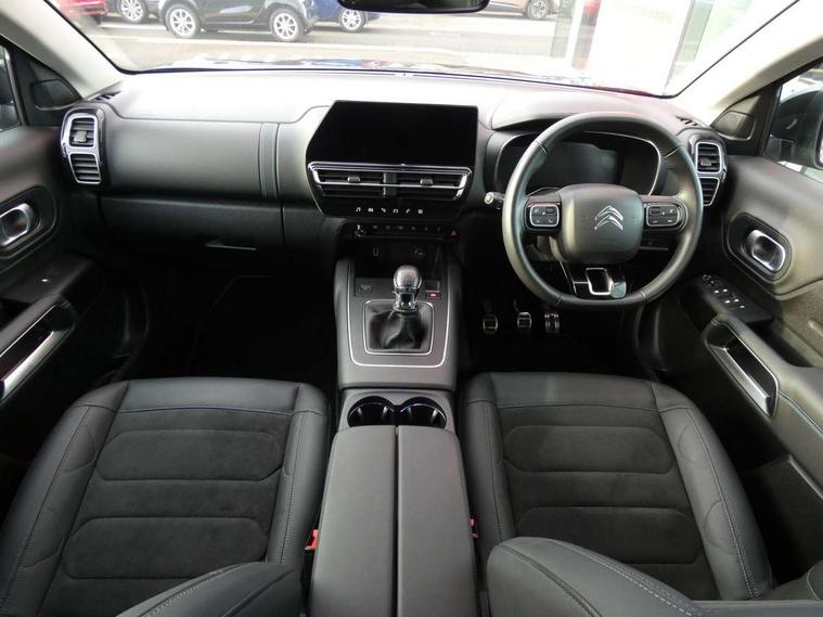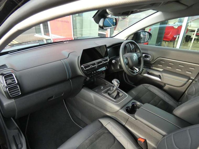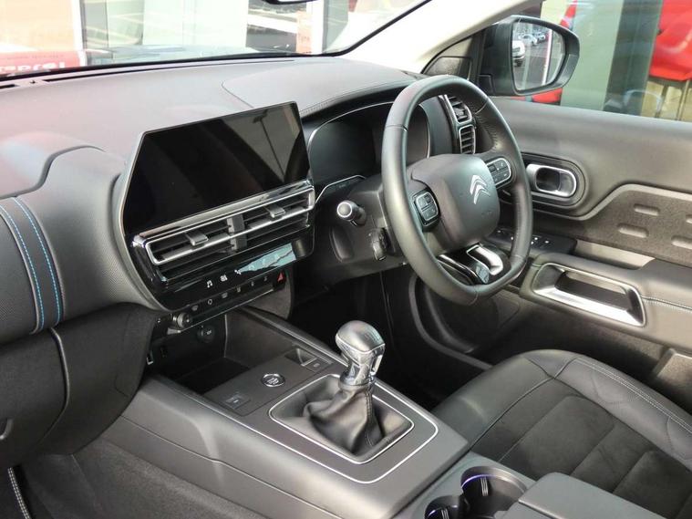 10" Touchscreen user interface with citroen connect nav, voice commands, Bluetooth handsfree and audio streaming, 12.3" digital instrument cluster with customisable zones and colour schemes, Citroen connect box emergency assist system, Citroen connect play featuring android auto and apple carPlay, Electric power steering, Multi function trip computer, Advanced comfort suspension, Auxiliary input socket, FM and DAB digital radio, 6 speakers, Polyphonic sounds, USB A socket (charge only) on rear part of central console, 3rd brake light, Acoustic laminated windscreen with rain and brightness sensors, Automatic hazard light activation upon heavy brake application, Automatic headlights with welcome and goodbye lighting, Body colour door handles, Body colour front bumper with air curtain, silver painted skid plate, and matt black lower section, Body colour rear bumper, Electric heated and folding door mirrors with LED approach lighting and blind spot monitoring indicators, Electrochrome auto dimming interior rear view mirror, Front fog lights with static cornering function, Gloss black longitudinal roof bars, Glossy black door mirrors, Glossy black structured grille, LED headlights with LED daytime running lights and visual signature, LED rear lights with visual signature, Magic wash automatic windscreen wipers with flat blades, variable speed depending on vehicle speed, and windscreen washers integrated into the wipers, Radio aerial integrated into rear window, Rear side wing doors, Rear window wiper with intermittent facility, linked to reverse gear, Sequential electric front and rear side windows with anti pinch function, Stainless steel front door thresholds, Stainless steel window finishers, Tinted row 1 windows and dark tinted row 2, C-Pillar and tailgate windows, 12V power outlet and 2x USB-A sockets (1x charge+data, 1x charge only) on front part of central console, 12V socket in boot, 2 Position boot floor, 3 point ISOFIX mountings on front passenger and rear outer seats, 4 way adjustable steering column, 6-way electric adjust driver seat, Adjustable headrests (2 in front, 3 in rear), Advanced comfort front and rear seats, Aluminium pedals and foot rest, Automatic bi-zone air conditioning with active carbon filter and air quality system, plus controllable row 2 air diffuser, Boot light, Central storage box with opening central armrest and interior lighting, Dashboard storage area to right of driver, open storage at front of central console, glovebox with smooth opening and lighting, Front + rear carpet mats, Front door storage can hold 1.5 litre bottle and A4 size documents, B-pillar coat hooks, rear door storage, central storage under armrest, Manual driver lumbar adjustment, Manual front passenger seat adjustment (height, slide, backrest angle), Map pockets in rear of front seats, Multi function leather steering wheel with two command blocks, Single front passenger seat, Three individual sliding seats with adjustable backrest and flat floor function, Two open cupholders with LED lighting in central console, Urban leather effect cloth/Alcantara upholstery with black ambience, City camera pack with front and rear parking sensors - C5 Aircross, Drive assist pack - C5 Aircross, LED interior lighting - - C5 Aircross, 3 rear 3-point seatbelts (outer seats featuring force limiters), ABS/EBD, Adaptive driver and front passenger airbags with passenger airbag deactivation function, Collision risk alert, Driver and front passenger side airbags, DSC (Dynamic Stability Control) and ASR (Electronic Anti-skid System), Electronic parking brake, ESP including traction control and stability programme, Front seat belts with double pretensioning, force limiters and height adjustment (driver and passenger), Front ventilated disc brakes and rear disc brakes, Head curtain airbags covering rows 1 and 2 (left and right), Hill start assist, Manual child lock in second row, Seatbelt unfastened audible alert, Two tone horn, Tyre under inflation indicator, Anti theft alarm with perimetric and volumetric protection, plus tilt sensor, Anti theft locking wheel nuts, Automatic door and tailgate locking with automatic unlocking in case of collision, Electronic code immobiliser, Keyless entry and start, Remote central locking + deadlocks, Compressor with puncture repair kit,