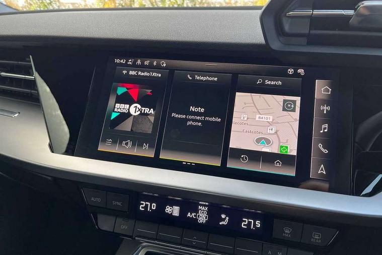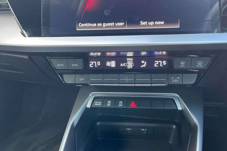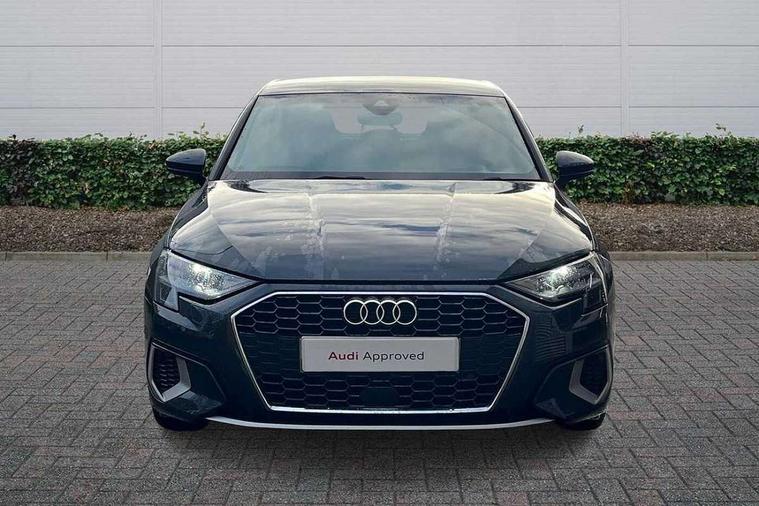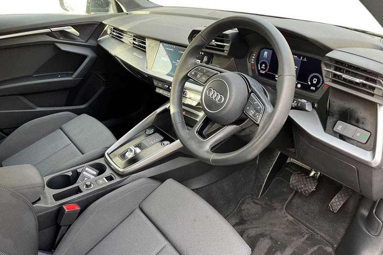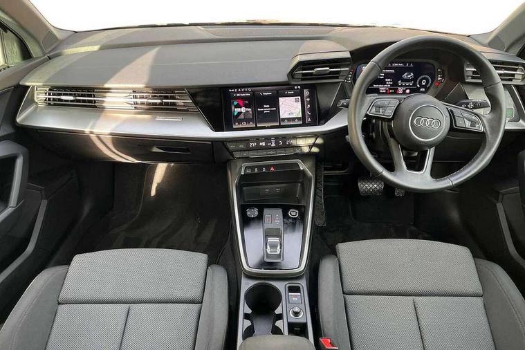 Audi drive select (Auto, Comfort, Dynamic and Individual), Audi smartphone interface, Audi Virtual Cockpit - 10.25" digital and colour instrument cluster, Automatic start/stop system with recuperation, Bluetooth interface, Camera based traffic sign recognition, Collision avoidance assistant, e-Call (emergency call), Electromechanical power speed sensitive steering, Lane departure warning system, MMI Navigation Plus with high resolution 10.1" colour touch screen display, Service indicator, Trip computer, Voice control system with natural language interaction, Standard suspension, 2xUSB-C connection with data and charging functions, 6 passive loudspeakers, DAB Digital radio, 3rd brake light, Acoustic glass windscreen, Aluminium window trim, Auto dimming frameless rear view mirror, Body colour exterior mirrors, Body colour roof spoiler, Electrically adjustable/heated/folding/auto dimming door mirrors with integrated LED indications + kerb view function for passenger side, Front electric windows, LED daytime running lights, LED headlights and halogen rear lights, Light and rain sensors, Rear electric windows, Rear side wing doors, Rear window, rear door windows and rear side windows in clear glass, Rear wiper, 12V socket and storage compartment in front centre console, 3 seat bench in 2nd row, 3 spoke leather multifunction steering wheel with paddle shift, 4 way electrically adjustable lumbar support for driver and front passenger, 60/40 split folding rear seat bench, Dual zone electronic climate control, Front and rear headrests, Front centre armrest, Front door sill trims with aluminium inlay, Front/rear floor mats, Height and reach adjustable steering wheel, Interior lighting - Front and rear roof module including reading lights, glove compartment light and right hand side, Interior lighting - glove compartment light and right hand side, Luggage compartment floor covering, Manual boot compartment lid, Manually adjustable front seats, Routine cloth upholstery with front sports seats, Seat side bolsters, Single front passenger seat, Steel grey cloth headlining, Aluminium interior elements pack - A3 Sportback, LED interior lighting pack - A3 Sportback, Sport styling pack - A3 Sportback, 3x3 point rear seat belts, Driver and front passenger airbag with passenger airbag deactivation, Electronic Stabilisation Control (ESC) including ABS, ASR and EDL, First aid kit with warning triangle and 2 safety vests, Front side airbags with head airbags and interaction airbag, Pre-sense front with pedestrian and cyclist detection, Seatbelt monitoring, Tyre pressure loss indicator, Anti theft alarm, Anti-theft wheel bolts, Electronically operated child locks, Immobiliser, Remote control central locking, Inlays with silk effect paint in platinum grey,