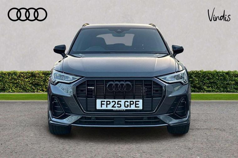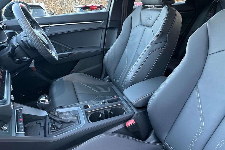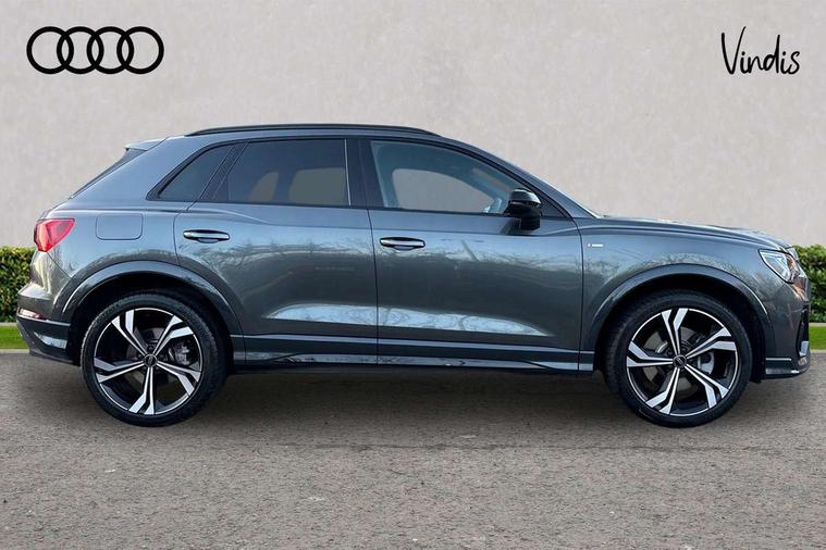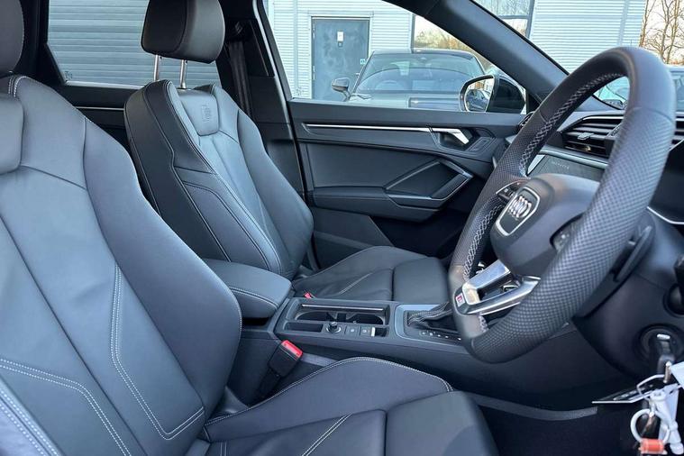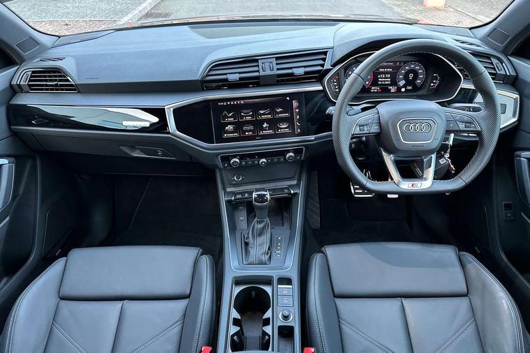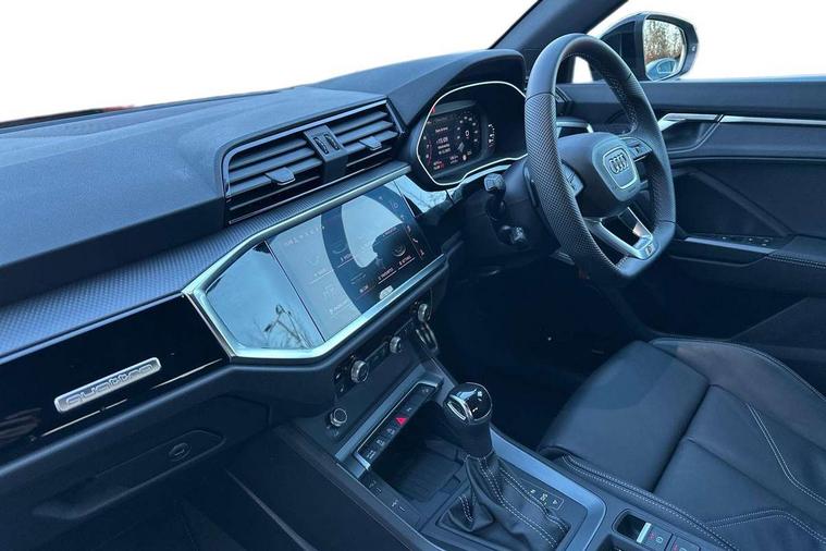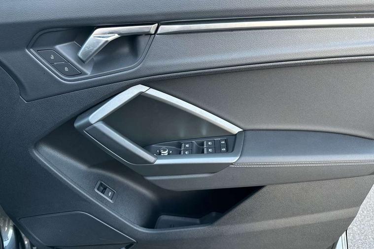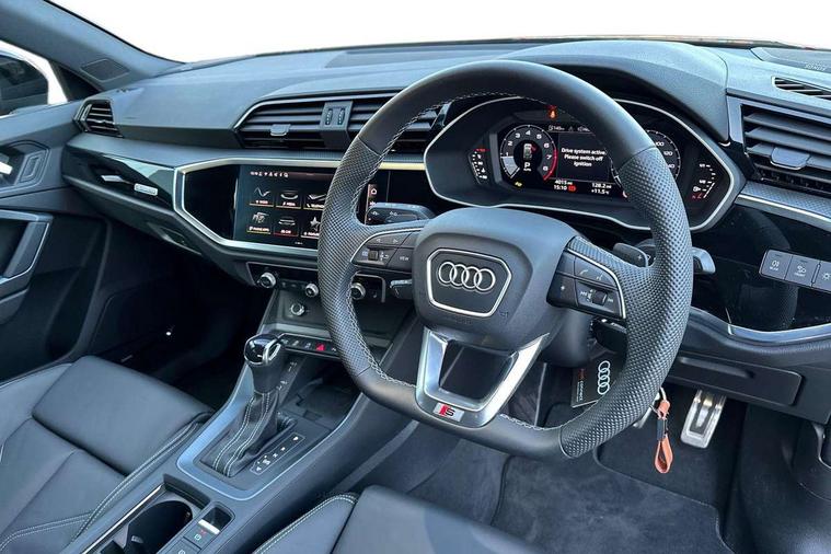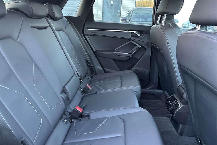 Amazon alexa Integration, Audi connect safety and service, Audi drive select, Audi lane departure warning, Audi Virtual Cockpit - 10.25" display, Bluetooth interface, Camera based traffic sign recognition, Distraction and Fatigue warning, Legal emergency call, MMI Navigation Plus with high resolution 10.1 inch touchscreen colour display, Power operated tailgate, Progressive steering, Service interval indicator, Smartphone interface includes wireless Apple carplay/Android Auto, Start stop system with recuperation, Voice control system with natural language interaction, Sports suspension, 2 USB-C ports with charge and data functions, 6 passive loudspeakers, DAB digital radio module, Acoustic windscreen, Audi Beam uses LEDs to project the Audi logo onto the ground as you exit your Q3, Auto dimming door mirrors, Auto dimming frameless rear view mirror, Black roof rails, Electrically folding, adjustable and heated door mirrors with integrated LED side indicators and kerb view function for passenger side, Front and rear electric windows, Front fog lights, Grille vertical bars in aluminium silver/Matt, High gloss black finish B and C pillars, LED Dynamic rear indicators, LED headlights with LED daytime running lights, LED rear lights, LED third brake light, Privacy glass dark tinted rear and rear-side windows (from B-pillar backwards), Rain and light sensors, Rear diffuser grille in grained matt black, Rear diffuser strip in matt anthracite black, Rear side wing doors, Rear wiper, S line bumpers in contrasting Manhattan grey, Variable front intermittent wipers, 12V socket in rear centre console, 3 seat bench in 2nd row, 40:20:40 folding with manual adjustment for 60:40 forwards/backwards position and backrest angle, Adjustable rear seat bench/backrest with centre armrest and cupholder, Black cloth headlining, Dual zone electronic climate control, Electric lumbar support, Front and rear black floor mats with contrast stitching in rock grey, Front and rear headrests, Front centre armrest, Height and reach adjustable steering wheel, Illuminated door sill trims with S logo, ISOFIX child seat mounting for front passenger with airbag deactivation and outer rear seat including top tether attachment point for outer rear seats, Manual front seats with height adjustment, Perforated leather gearknob, Single front passenger seat, Stainless steel luggage compartment sill finisher, Stainless steel pedals, Twin leather upholstery with front sport seats + S embossing, Black styling pack - Q3, Non smoking pack - Q3, 3x3 point rear seatbelts, 6 airbags - Driver, front passenger, curtain and side windows, Audi pre-sense front with pedestrain and cyclist recognition, Electrically operated child locks on rear doors, Electromechanical parking brake, Electronic stabilisation control including ABS, ASR and EDL, Front seatbelt reminder, Hill descent control, Hill hold assist, Pre sense basic, Seatbelt monitoring, Tyre pressure warning, Warning triangle and first aid kit, Anti theft wheel bolts, Immobiliser, Remote central locking, Thatcham approved category 1 anti theft alarm, Aluminium look interior elements, Detail dashboard around MMI touch colour display in glass look, black with surround in aluminium look, Leatherette door armrest, Piano black inlay,