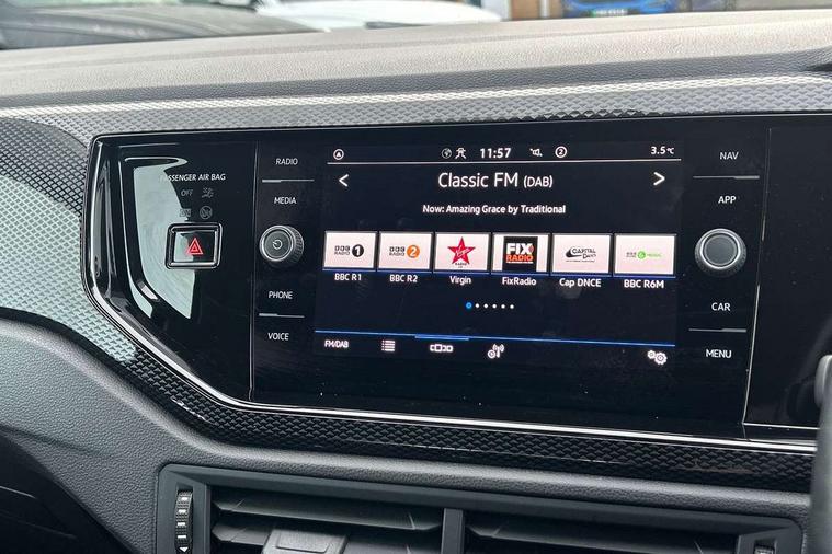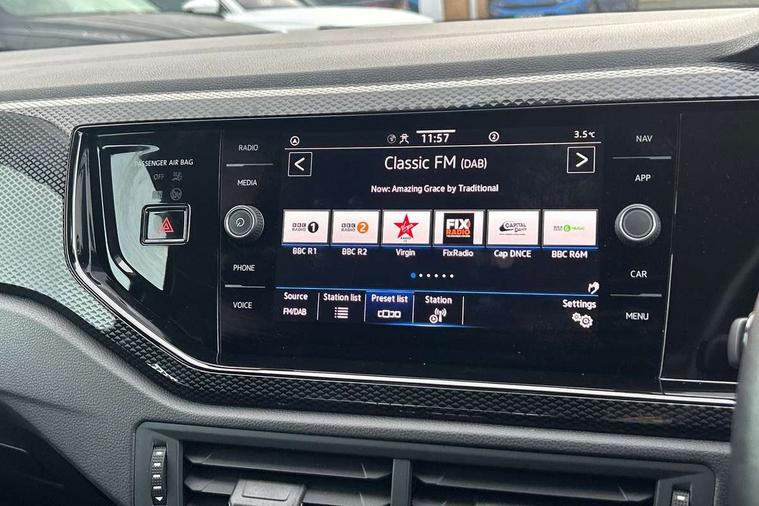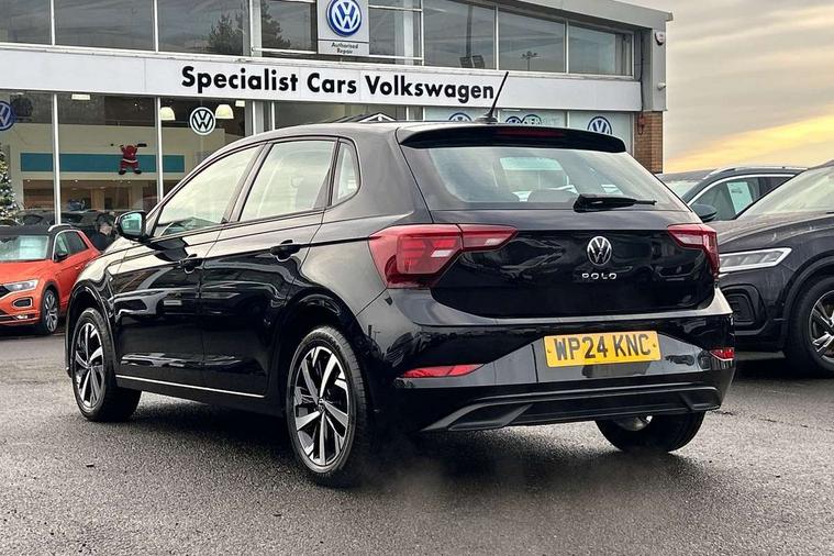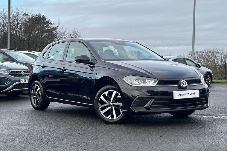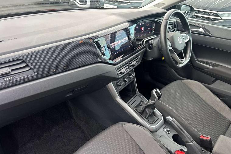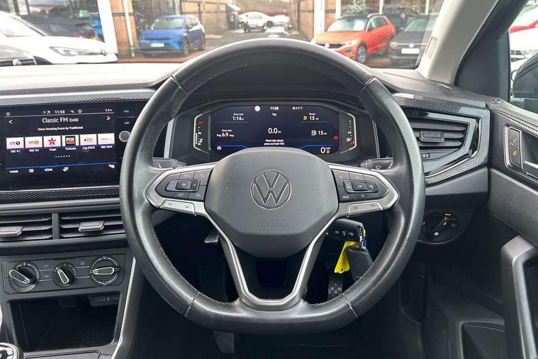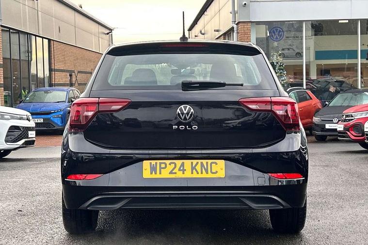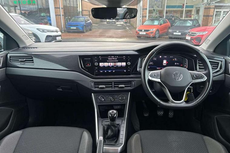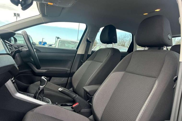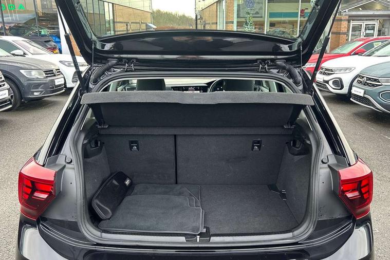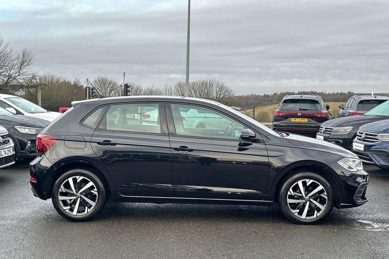 Adaptive cruise control without follow-to-stop and speed limiter, Advanced driver attention and drowsiness monitor, Bluetooth mobile phone interface, Dynamic road sign display, Emergency call service, Power assisted speed sensitive steering, Preparation for navigation system with media and internet package, Preparation for We connect and We connect plus, Speedo and rev counter, electronic odometer, trip, service interval display and exterior temperature gauge, Standard rear axle, Travel Assist - Lane keeping system and traffic jam assist, Travel assist including emergency assist, Trip computer, Warning signal and warning light for front and rear seatbelts not fastened, Washer fluid level indicator, Wireless app connect, Front wheel drive, Rear shock absorpion, Start-stop system with battery regeneration (recuperation - energy recovery during braking), DAB Digital radio, Diversity antenna for FM reception, Front and rear 6 speakers, Automatic dimming interior rear view mirror, Automatic headlight control with LED separate daytime running lights with coming/leaving home function, Body colour bumpers with chrome inserts, Body colour door handles, Body colour door mirrors, Electric front windows, Engine badge deletion, Headlight range adjustment, Heat insulating and laminated safety glass windshield, Heat insulating darkened glass in side and rear windows, Heat insulating glass windscreen, LED Headlights, LED rear combination lamps, Power folding adjustable/heated exterior mirrors and front passenger exterior mirror lowering function, Rain sensor, Rear electric windows, Rear fog light, Rear side wing doors, Rear windscreen washer and wiper with interval delay, Third brake light, 12V power socket in centre console, 2 front and 2 rear reading lights with switch off delay and dimmer, 2 USB-C ports in the front, 2 USB-C charging sockets on the center console in the rear, 3 rear head restraints, 60/40 split folding rear seat and rear seat bench not split, Ceramique roof lining, Chrome plated radiator grille inserts, air vent surrounds and light switch surrounds, Door and side trim panel, Driver and front passenger seat height adjustment, Driver/passenger sunvisors with illuminated vanity mirrors, Front centre armrest, Front seat backrest storage pockets, Front standard seats, Handbrake lever handle in leather, Hartley/Thomas cloth upholstery, Headliner in recycled material, Isofix child seat preparation easy-fit (for two outer rear seats, and front passenger seat) compatible with I-size, Leather trimmed gear knob, Luggage compartment cover, Luggage compartment lighting, Removable luggage compartment floor, Single front passenger seat, Standard climatic zones, Standard pedal cluster, Three spoke leather wrapped multifunction steering wheel, Light and vision pack - Polo, 3 point height adj front seatbelts + pretensioners, 3x3 point rear seatbelts, ABS, Driver and front passenger airbag with front passenger airbag deactivation, Drivers and front passengers safety optimised head restraints, ESC (Electronic stability control) + EDL (Electronic Differntial lock) and ASR (Traction control), Extended and predictive pedestrian/ cyclist protection, Front assist with autonomous emergency braking (for Adaptive Cruise Control ACC up to 130 mph), Front curtain and side airbags with center airbag, Front disc brakes, Hill hold control, Manual child lock in rear doors, Rear drum brakes, Single tone horn, Tyre pressure loss indicator, Alarm with interior protection, Anti-theft alarm system with interior monitoring, backup horn, and towing protection, Anti-theft wheel bolts, Electronic engine immobiliser, Lava stone black gloss/matt decorative inserts in dash and front door panels, Low rolling resistance tyres,