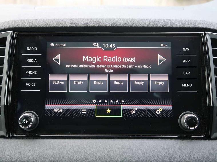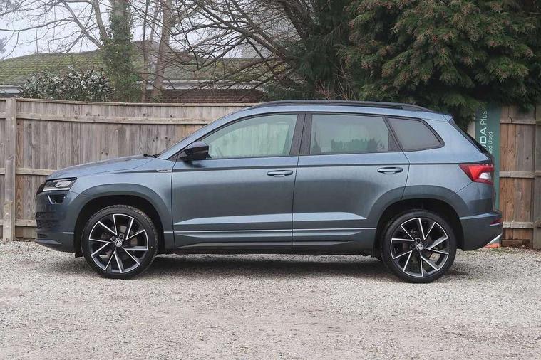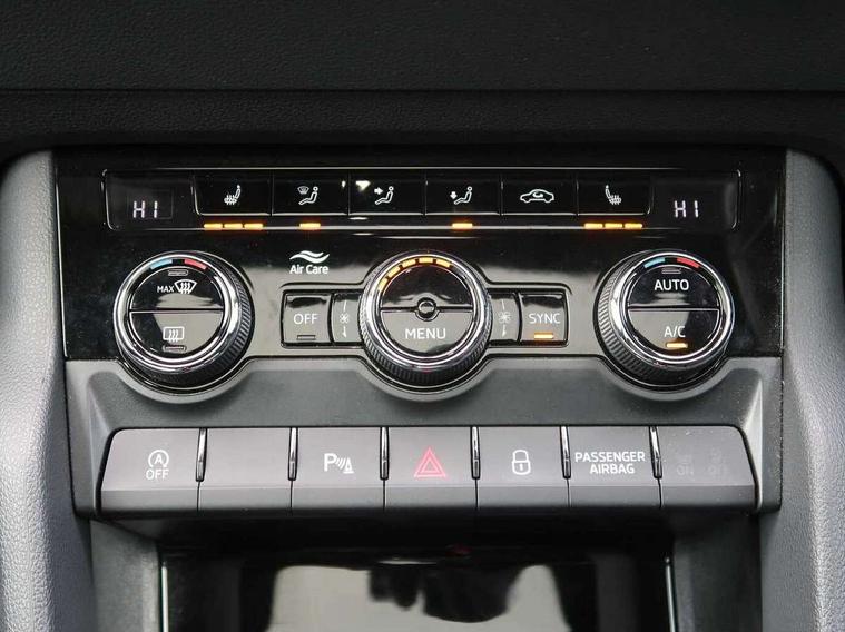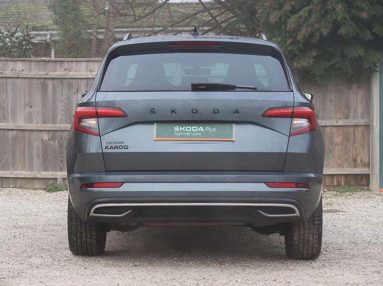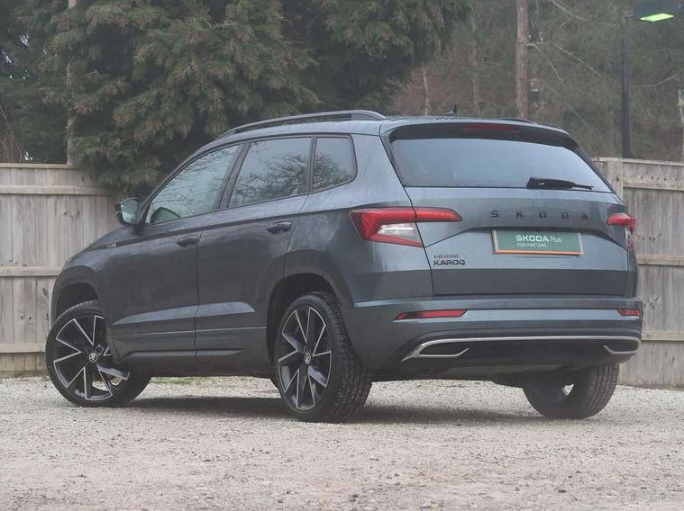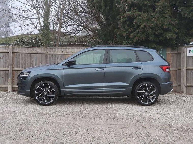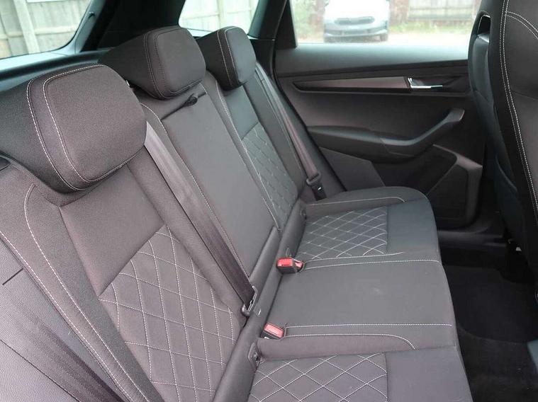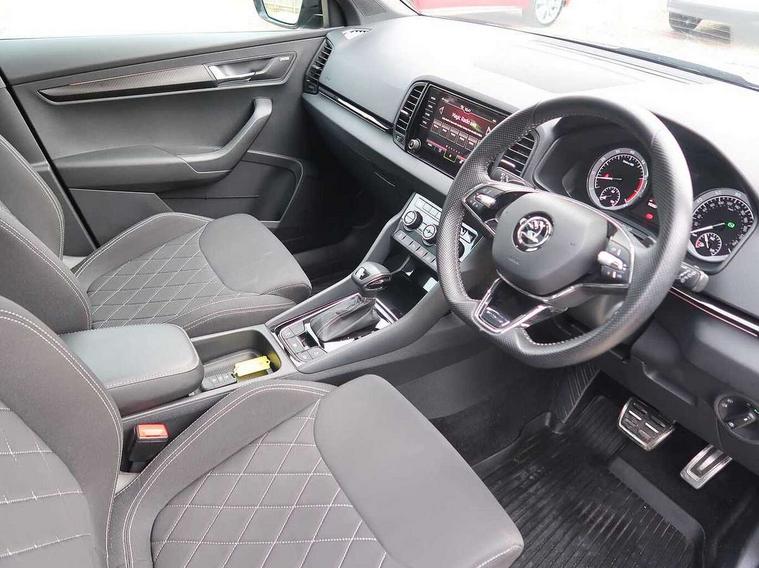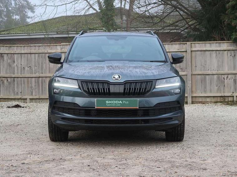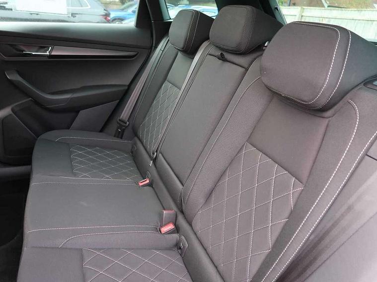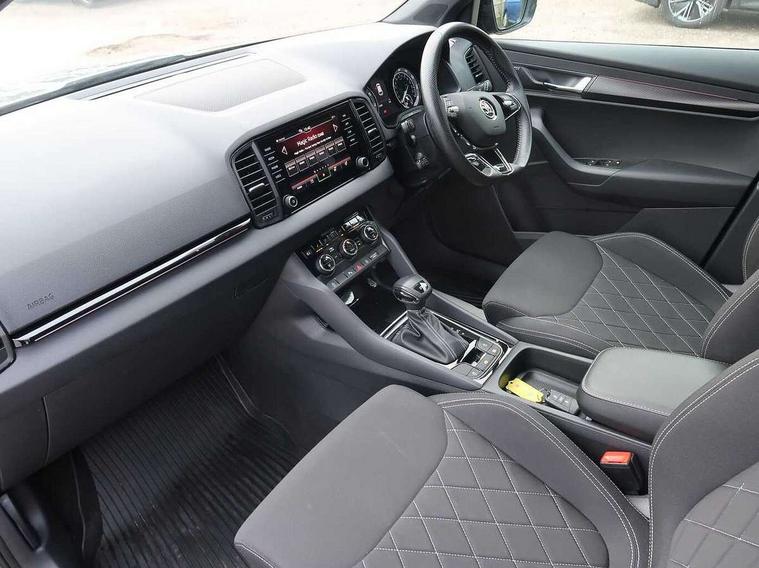 Care connect, Drive mode selector, Driver fatigue sensor, Multifunction colour trip computer, Outside temperature gauge, Service interval indicator, SmartLink wireless for Apple and wired for Android, Start/stop system with regenerative braking, USB C Port x 2 in front centre console, DAB radio with Bluetooth, USB connection, Wireless charging without wireless aerial connection, Acoustic glass, Aero front windscreen wipers with intermittent function, Automatic headlight control system, Black door mirrors, Black electric window control buttons, Black radiator grille, Black roof rails, Body colour door handles, Body coloured bumpers, Electric front and rear windows with child proof lock, Front door steps with SportLine logo, Full LED headlights + adaptive front light system + LED daytime running lights and front cornering fog lights, Headlight washers, Heated rear windscreen, LED rear lights with high functionality, Light assistant (coming/leaving home/tunnel light), Panoramic sliding sunroof, Privacy glass, Protective door side sills in body colour, Rear diffuser, Safety reflectors on front doors, Skoda lettering on tailgate in black, Sportline badge on front fender, Sportline decorative inserts with badging, Sports front and rear bumpers, Third brake light, 1.5 litre bottle holders in driver and front passenger door panels, 12V socket in boot, 12v socket in front centre armrest with storage compartment and rear air vents, 2 Folding hooks and nets in boot, 2 Front readings lights for driver and passenger, 3 rear height adjustable headrests, 4 foldable roof handles with rear coat hooks, Aluminium pedals, Black roof headlining, Cargo elements in boot, Chrome inner door handles, Door sill scuff plates, Driver and passenger seats height adjust, Front head restraints, Height adjustable front three point seats belts with tensioners, Height/reach adjust steering wheel, Ice scraper, Illuminated and cooled glovebox, Illuminated luggage compartment, Isofix child seat preparation outer rear, Manual lumbar support for front seats, Net programme in boot, Pen holder, Pollen filter, Rear reading lights, Rear seats fixed folding and divided 60:40, Retractable parcel shelf attachable to tailgate, Safety vest holder, Solid rear boot cover, Storage box in upper central dashboard closed, Storage compartment below the passenger seat, Sunvisors with illuminated vanity mirrors, Textile floor mats, Umbrella under passenger seat, Welcome animation with sportline logo, LED Interior lighting pack with Skoda welcome logo - Karoq, Airbags - Front side, head, knee and curtain, Automatic door unlocking in case of crash, Automatic fuel cut off in case of crash, Driver airbag, Electronic parking brake with auto hold function, Emergency rear braking signal, ESC including ABS, MSR, ASR, EDS, HBA, DSR, RBS, MKB and traction control, Front assist radar scanning of the space in front of the car with automatic braking, Hill hold control, Passenger airbag with switch-off function, Pedestrian monitor, Seatbelt reminder signalisation and pretensioner for all seats, Three point seatbelts rear, Two tone horn, Tyre pressure display, Tyre pressure monitor, Alarm with interior monitoring, back up horn and tilt sensor with safe function, Electronic engine immobiliser, Keyless entry and keyless start with safe system, Remote central locking with 2 remote folding keys, Black air vent surround, 19" Vega anthracite alloy wheels, Anti-theft wheel bolts protection, Storage on wheel cover,