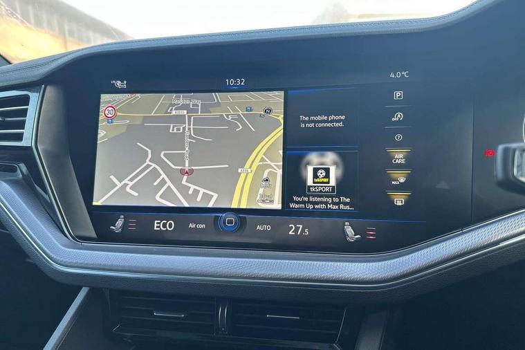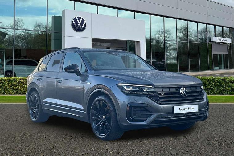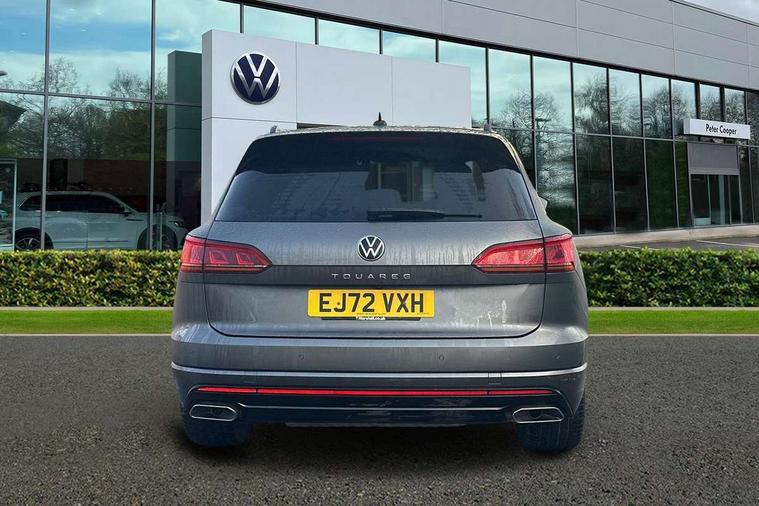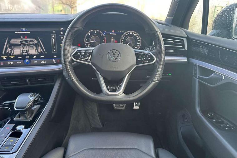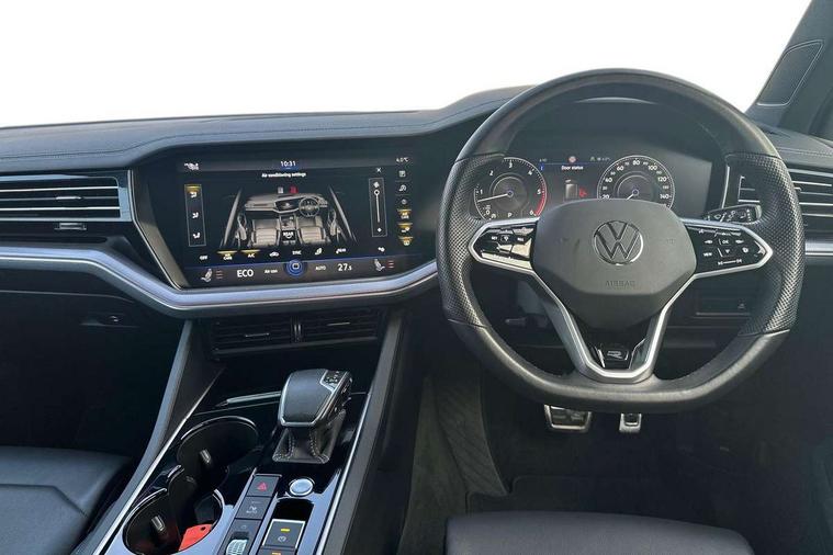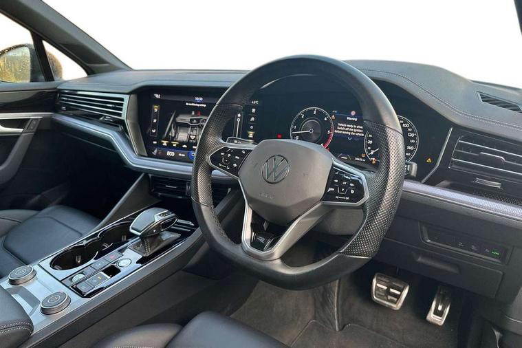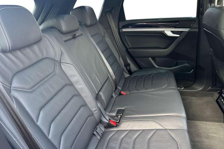 2D/3D map view, ACC - Adaptive cruise control with front assist, forward collision warning, distance monitoring, city emergency brake and speed limiter, Apple car play/Android Auto, Audible and visual fatigue detection system, Bluetooth hands free telephone connection, Car information display, Drive select with Damper control, Driver alert system, Driver profile selection, Dynamic road sign display camera controlled system with visual warning for traffic and road signs, eCall emergency system, Fully electric tailgate + keyless entry and start, Instrument cluster, MirrorLink, Multifunction camera, Multifunction computer premium with 7" colour display, One touch indicators with repeat function, Service interval indicator, Speed sensitive power steering, Start/stop system with regenerative braking, Tailgate power latch, Think blue trainer driver tips and journey analysis, Traffic sign recognition, Voice control system, Wireless Smartphone charger, 24 litre AdBlue tank, Torsen limited slip differential, DAB Digital radio, Dynamic navigation based on TMC+, Gesture control for infotainment system, Multi device interface (MDI) with illuminated USB-C connection, Music playback - MP3, WMA and AAC files, SD card slot, Simultaneous pairing of 2 compatible mobile devices, SMS functionality - read, compose and send SMS messages using touch-screen display, Title and cover art display, Volkswagen media control, Adaptive low beam for urban and motorway use, Auto dimming rear view mirror, Automatic coming/leaving home lighting function, Automatic headlights, Black anodised roof rails, Black door mirrors, Black rear diffuser, Black side window surrounds, Black upper and lower grille louvres extending into headlights and radiator grille, Body colour door handles, Body coloured wheel arches, C signature gloss black front air intake, Chromed tailpipe on the left and right integrated in the bumper with trapezoid design, Dusk sensor, Dynamic headlight range control, Electric front tilt/slide panoramic sunroof and fixed rear sunroof, Electrically power adjustable, heated, folding, auto dimming, front passenger exterior door mirror lowering function, Front and rear electric windows, Galvanised body, Gloss black finish B pillar, Gloss black rear diffuser, Headlight washers, Heat insulating darkened glass in side and rear windows, Heated windscreen washer jets, IQ.Light-LED matrix headlight, daytime running light with dynamic cornering light and indicator, LED 3rd brake light, LED rear fog light, LED rear number plate lights, Plastic scuff plates in door apertures, Poor weather light, Puddle lights, Rain sensor, Rear side wing doors, Rear wiper, 12V socket in front and rear centre console and boot, 2 Coat hooks on B pillar, 3 rear head restraints, 3 seat bench in 2nd row, 3 spoke sport heated leather multi-function sports steering wheel with gear shift paddles - generation 2, 4 way adjustable front head restraints, 4 way electric lumbar support for driver and front passenger, 4 zone climate control, 40:20:40 split folding slide/recline rear seat, B pillar vents, Black lower edge of door extending sills, Branded points of interest, Double sun visor for drivier and passenger with LED illuminated vanity mirrors, Electric luggage compartment cover, Folding rear centre armrest with 2 cupholders, Front + rear carpet mats, Front centre armrest with storage box, Gear shift indicator, Height/reach adjust steering wheel, Illuminated air conditioned glovebox, Isofix preparation for 2 rear child seats, Jack and tool kit, Leather trimmed gear knob with gloss black inlay/aluminum trim, Leatherette door trim, LED luggage compartment lighting, Load through provision, Luggage compartment with load lashing rings, Plastic loading edge protection, Rear seat remote release levers, Single front passenger seat, Soul black headlining, Stainless steel pedals, Innovision cockpit pack - Touareg, 3 point front seatbelts with pre-tensioners, ABS, Active bonnet, Automatic post collision braking system, Curtain airbags, Driver/Front Passenger airbags, EBD + Brake Assist, EDL, Electronic parking brake with auto hold, ESC with ASR, Front seat side impact airbags, Hill descent control, Hill start assist, Passenger airbag deactivate switch, Seatbelt warning lamp and buzzer, Three 3 point rear seatbelts, Two tone horn, Volkswagen roadside assistance, Warning triangle and first aid kit, Alarm with interior monitoring in cab, backup horn and towing protection, Child security locks for front and rear doors, Electronic engine immobiliser, Remote central locking, Black decorative trims on the side windows, High gloss black centre console,
